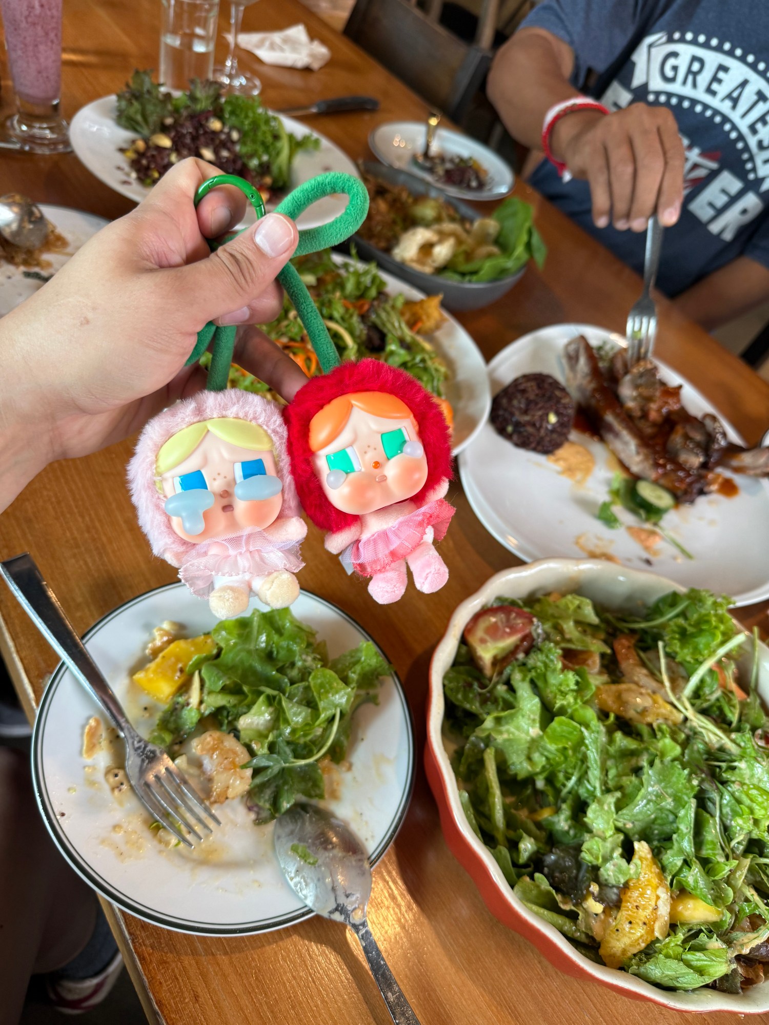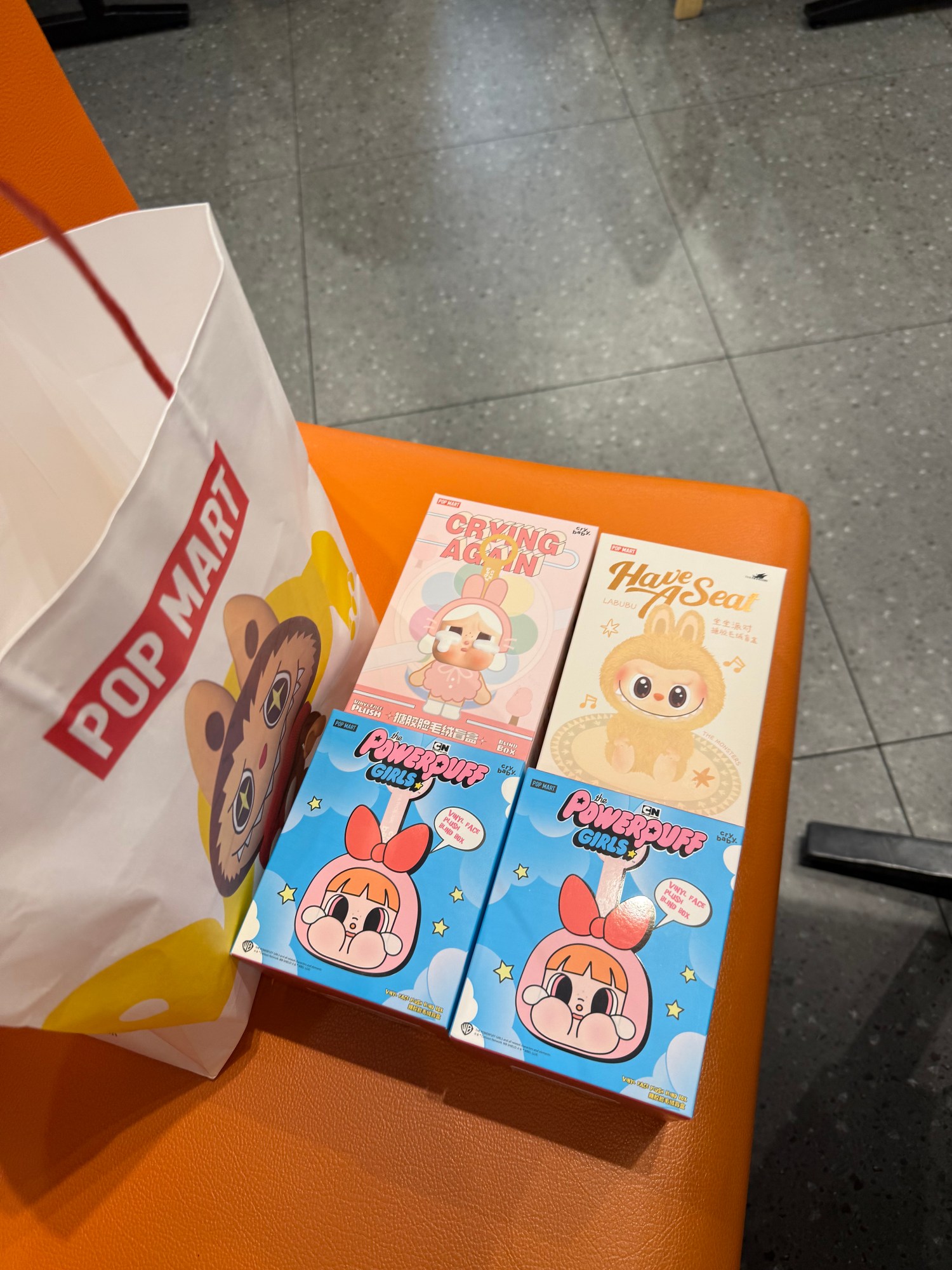 The next day, I gathered my cousins Hai and Phokai and made our way to Pop Mart for restock day (lucky me). I secured a big CryBaby from the Crying Again series for 690 baht ($22), and two mini Powerpuff Girl CryBabies (450 baht a pop, $14)—because I’m nothing if not a shopping-addicted crazy bitch. CryBabies are adorable—oversized heads, plush bodies, big anime tears. But Labubus? They’re on another level: more monstrous, rarer, and the true status symbol of the Pop Mart ecosystem. So of course they were sold out. Again. Apparently, they sold out in the first hour. One staffer told me that people call in advance and queue before opening.