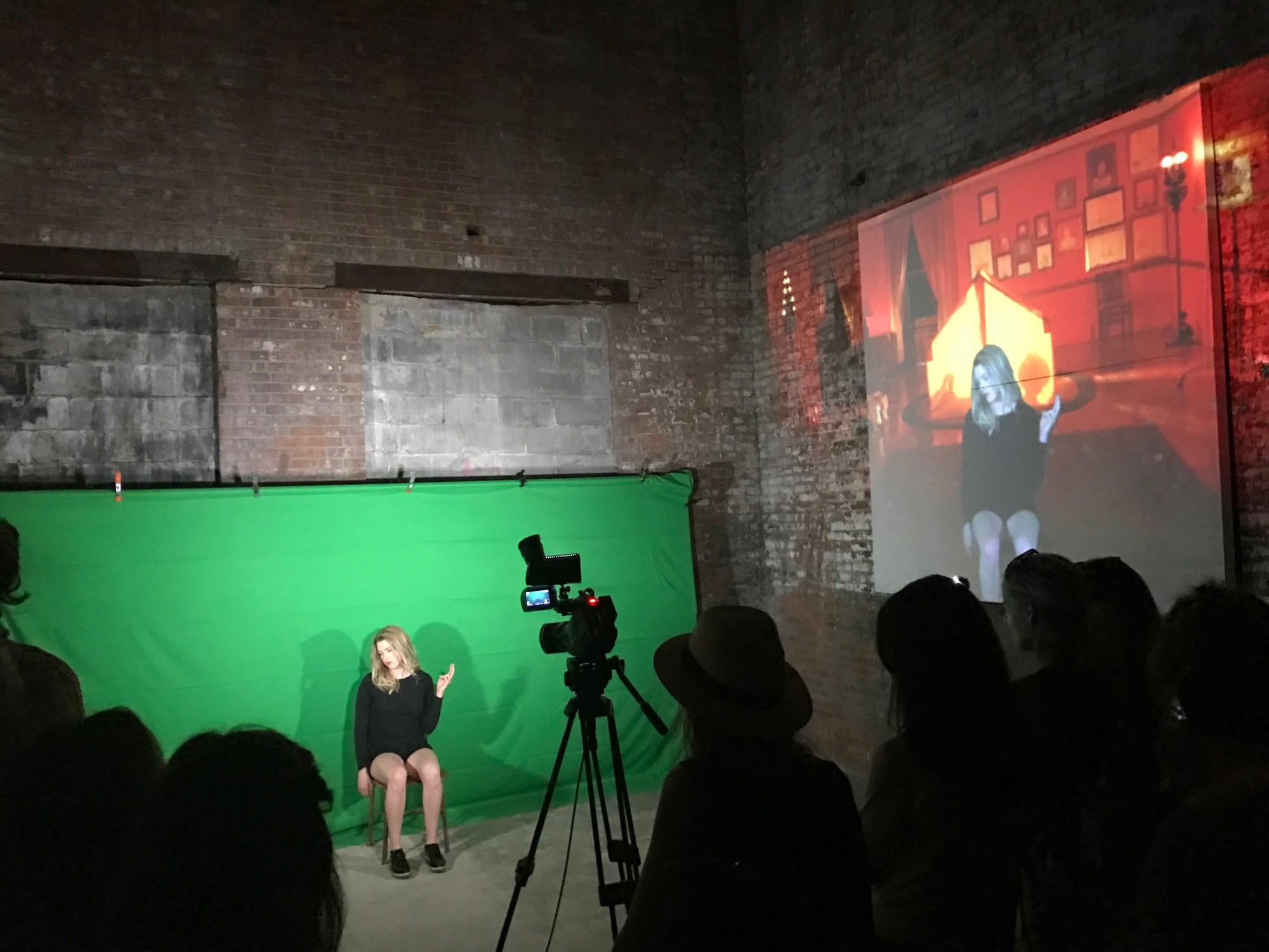 This piece subverts today’s addiction to instant gratification by absurdly translating it back into the flesh. Audience members place orders from a menu of iconic blonde films, as they are accustomed to with any on-demand system, and I instantly create a scene from that film. Performing against a green screen, I’m simultaneously projected onto the walls on either side with backdrops inspired by the original film cut behind me. Trapped inside this 270-degree “live Netflix” immersion, the audience must go from observer to participant. At different points throughout the performance, the audience itself breaks the fourth wall by engaging with my character “inside” the worlds of the films. Chaos ensues when the everyday on-demand experience crosses into the real. Hyper-stimulation and instant gratification force participants to travel quickly between emotions and worlds.