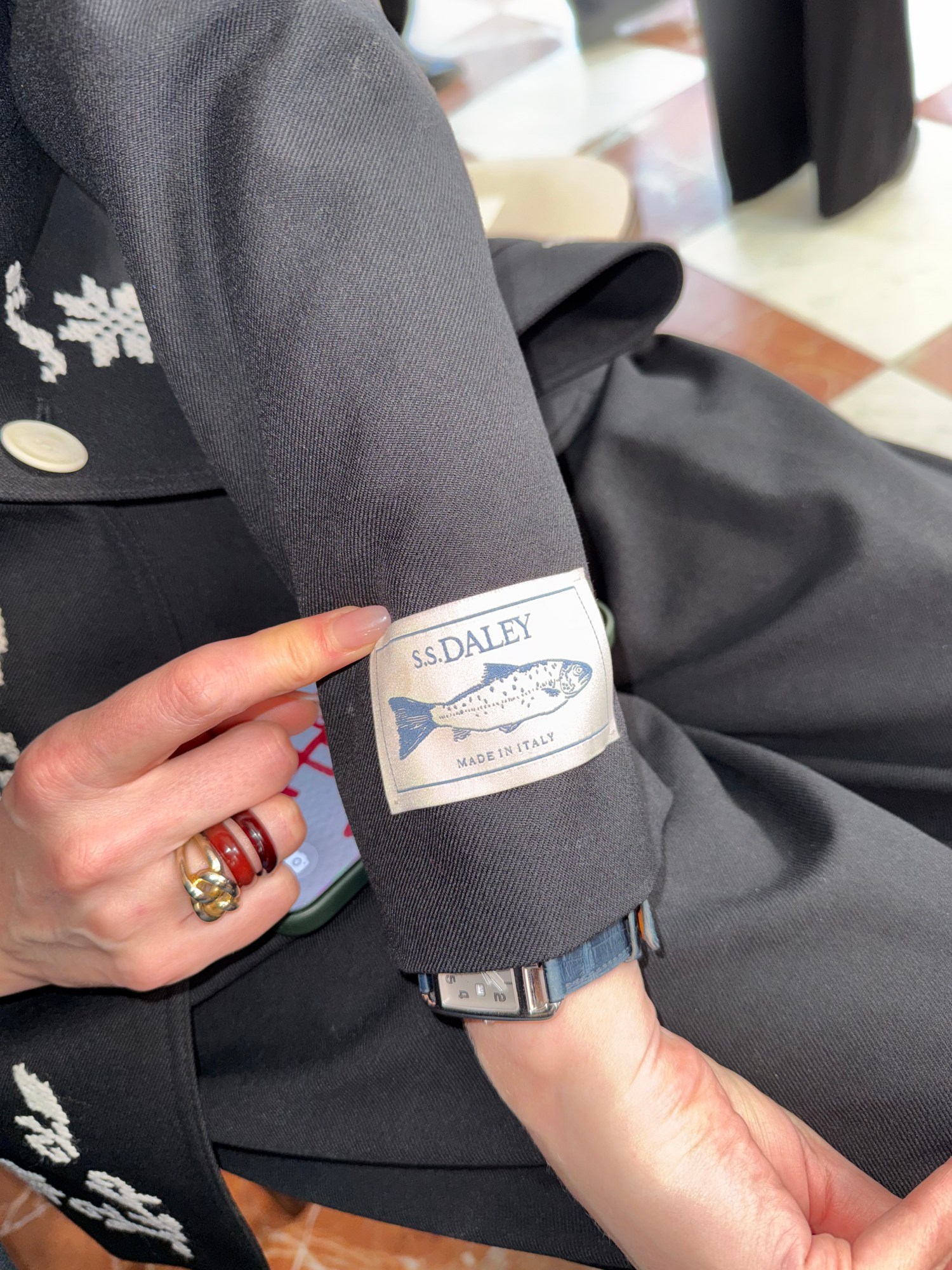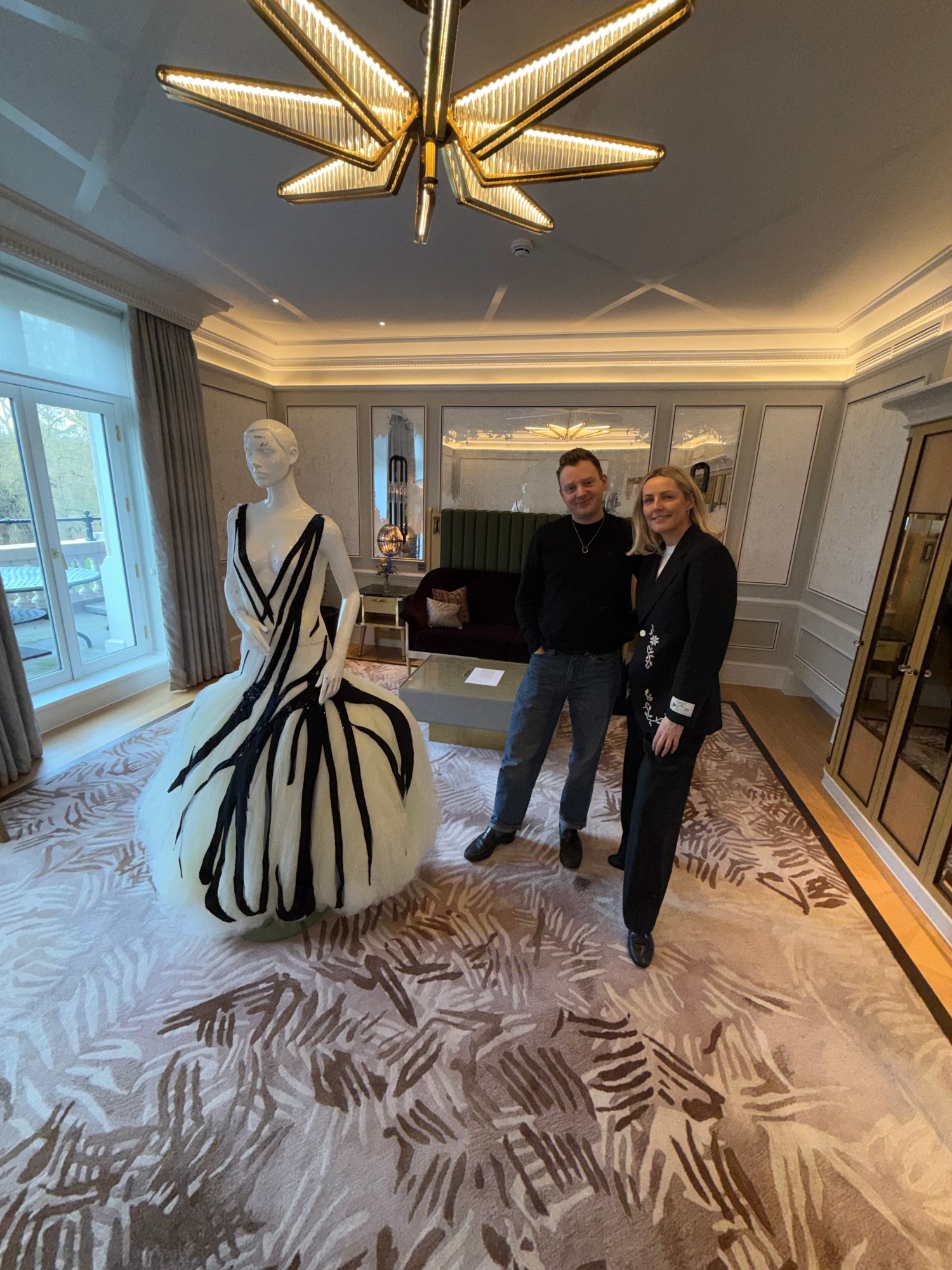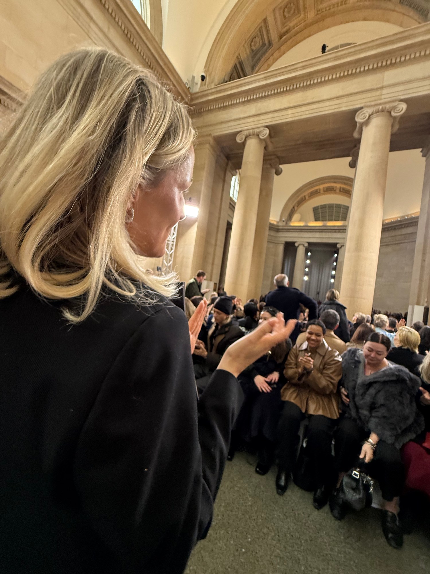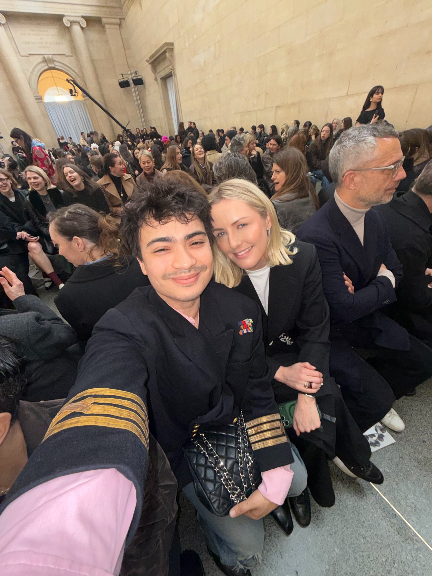 We meet first inside Tate Britain, before the show begins. The runway is still empty. Editors are settling into their seats. The room buzzes with that particular pre-show electricity. She arrives in a black S.S. Daley pant suit—sharply cut, softly authoritative—the kind of look that communicates alignment without theatrics. She smells faintly, expensively divine. “Your brain never stops,” she says, referring to her years as a journalist. “It’s muscle memory.”