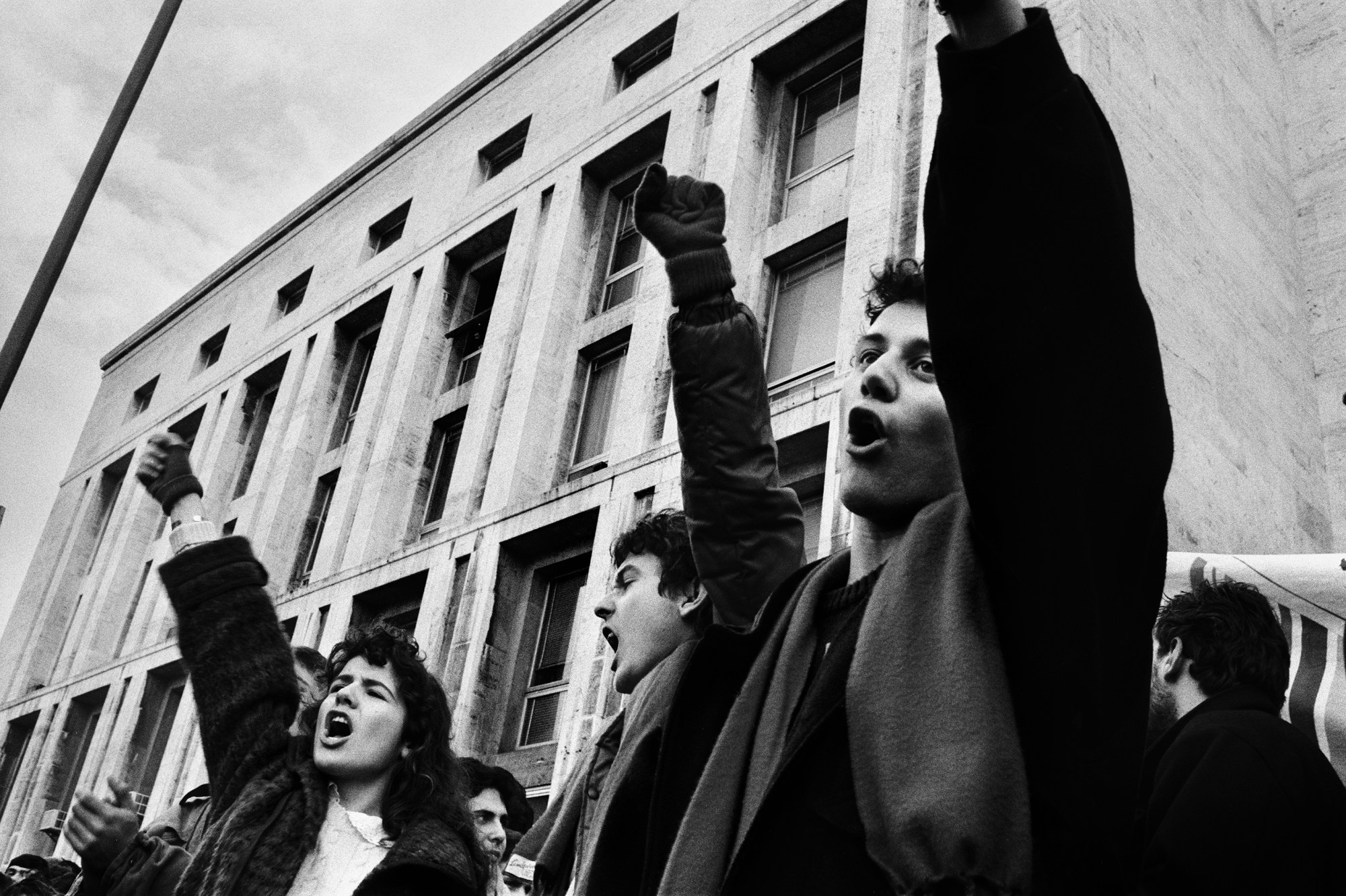 Deeply attuned to the darkness and desolation of the raging mafia war, Palermo native Fabio Sgroi (b. 1965) started photographing the city’s underground punk scene. Over a period of two years, he chronicled local anarchists, radicals and drunks while also playing in a punk band called MG. He fell into photography without a plan, only to end up joining Letizia and Franco at L’Ora in 1986 when the punk scene started to wind down. Although Sgroi was just 20 when he joined the newspaper, this made him the perfect person to document the burgeoning student movement, protests, occupations, and dynamic cultural changes sweeping the city at the time.