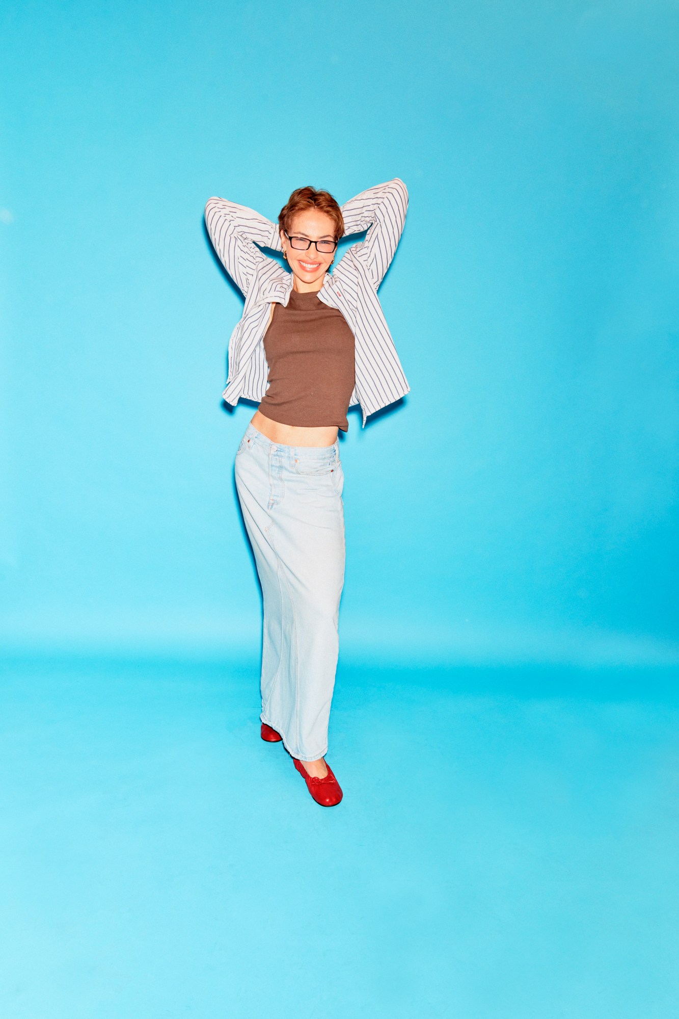 What do you do? Photographer, model, stylist. What do you love most about wearing jeans? I love how jeans make me feel when I make lemonade in them. What’s your go-to style or fit of jeans? Mom jeans, baggy. Where in the world do you want to travel—and what jeans would you pack? Tokyo in baggy jeans. What song do you have on repeat right now? “A Kind of Magic” by Queen. Finish this sentence: only in jeans can I… have fun.