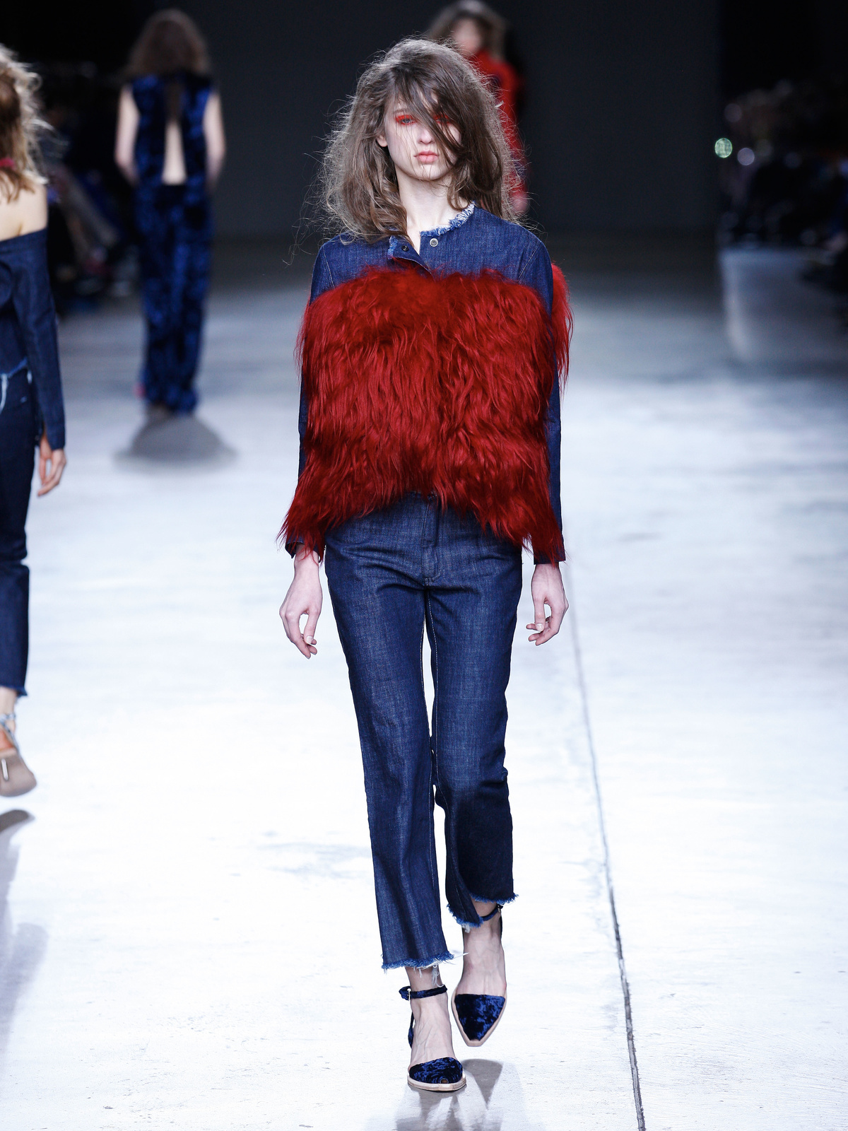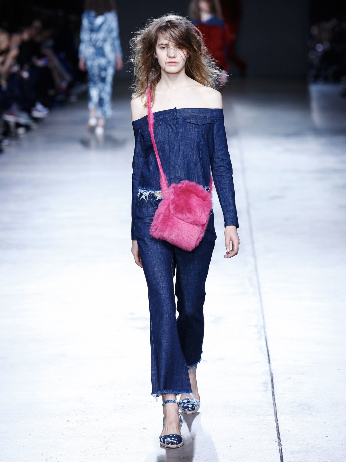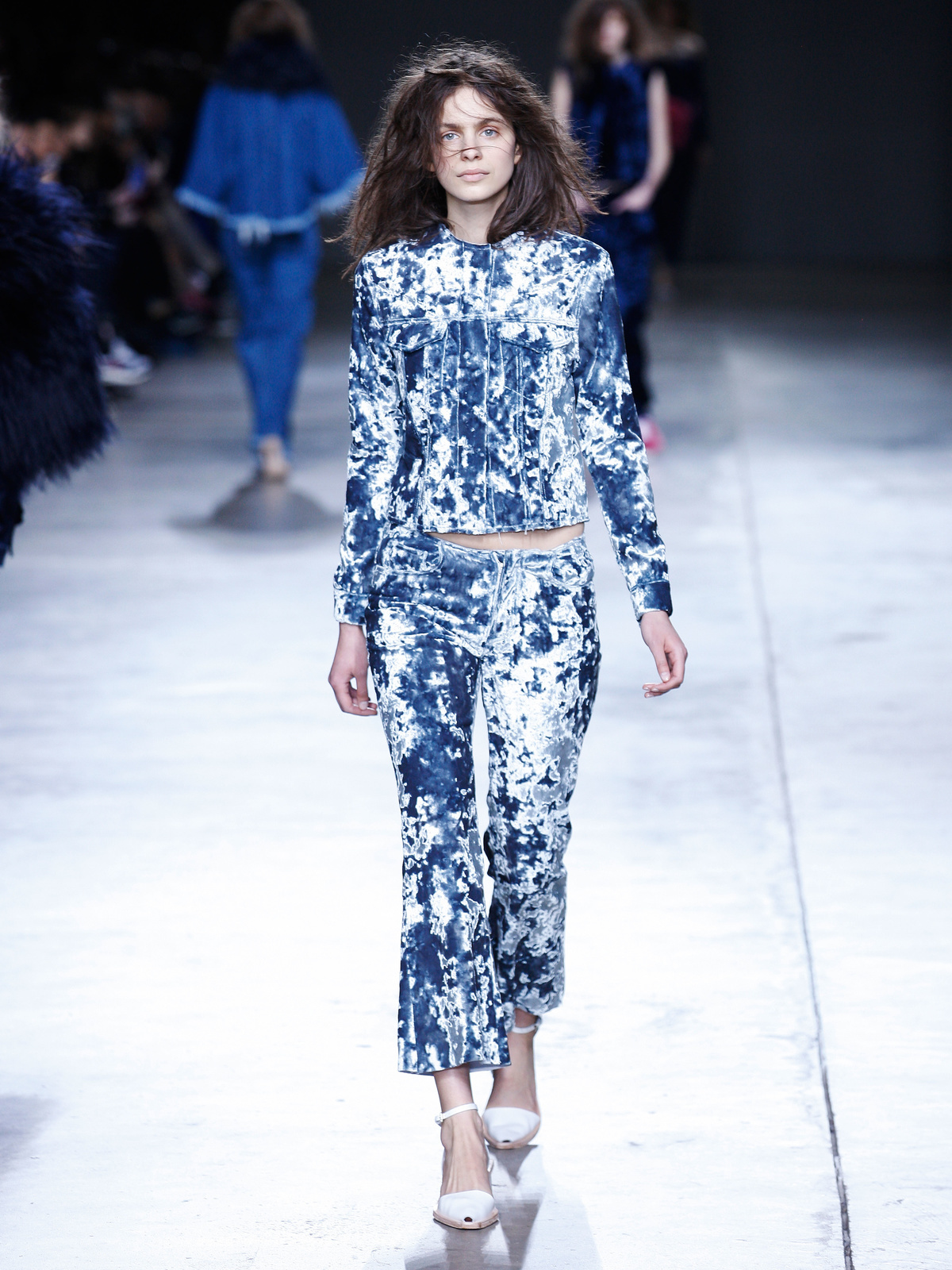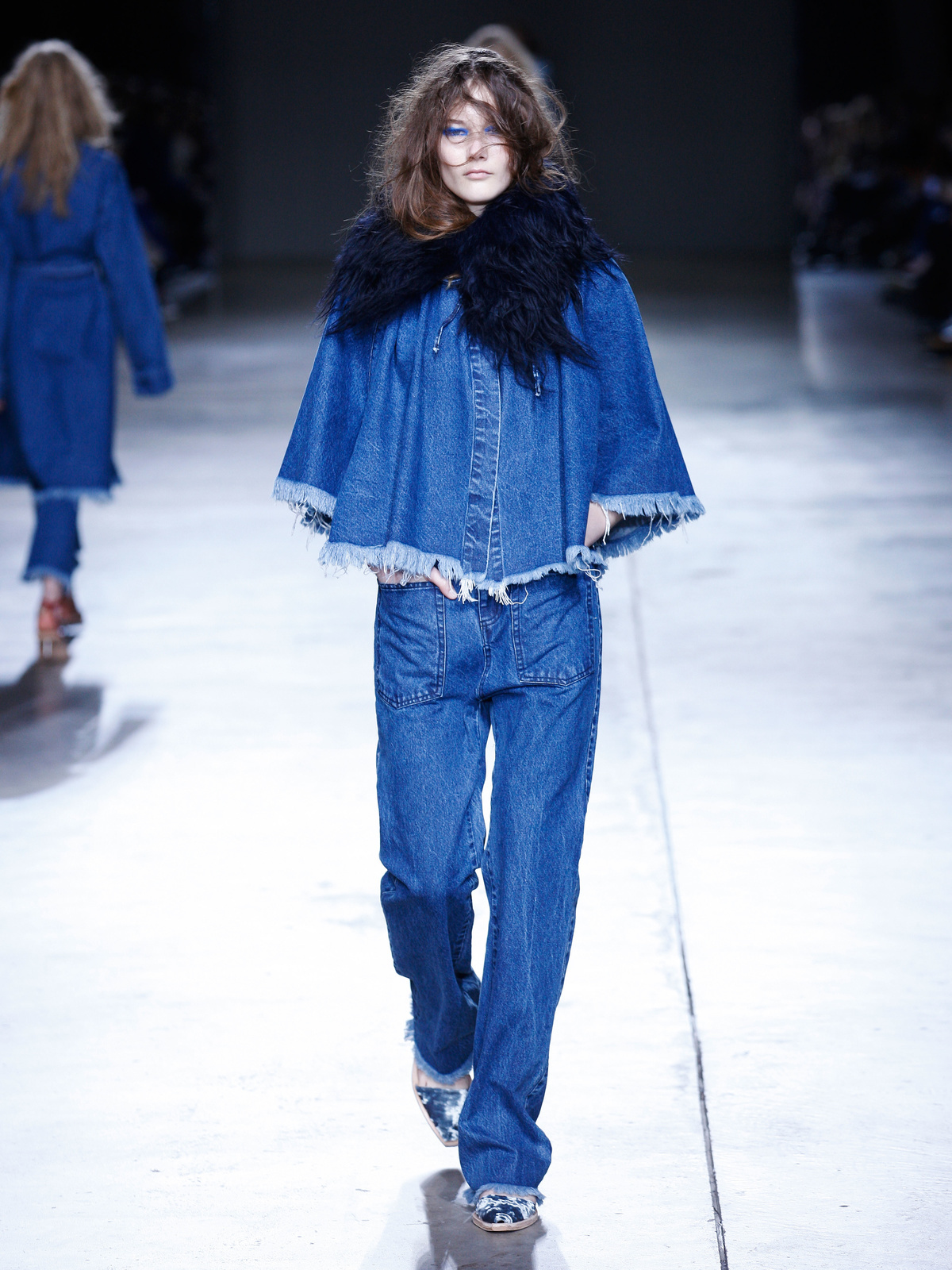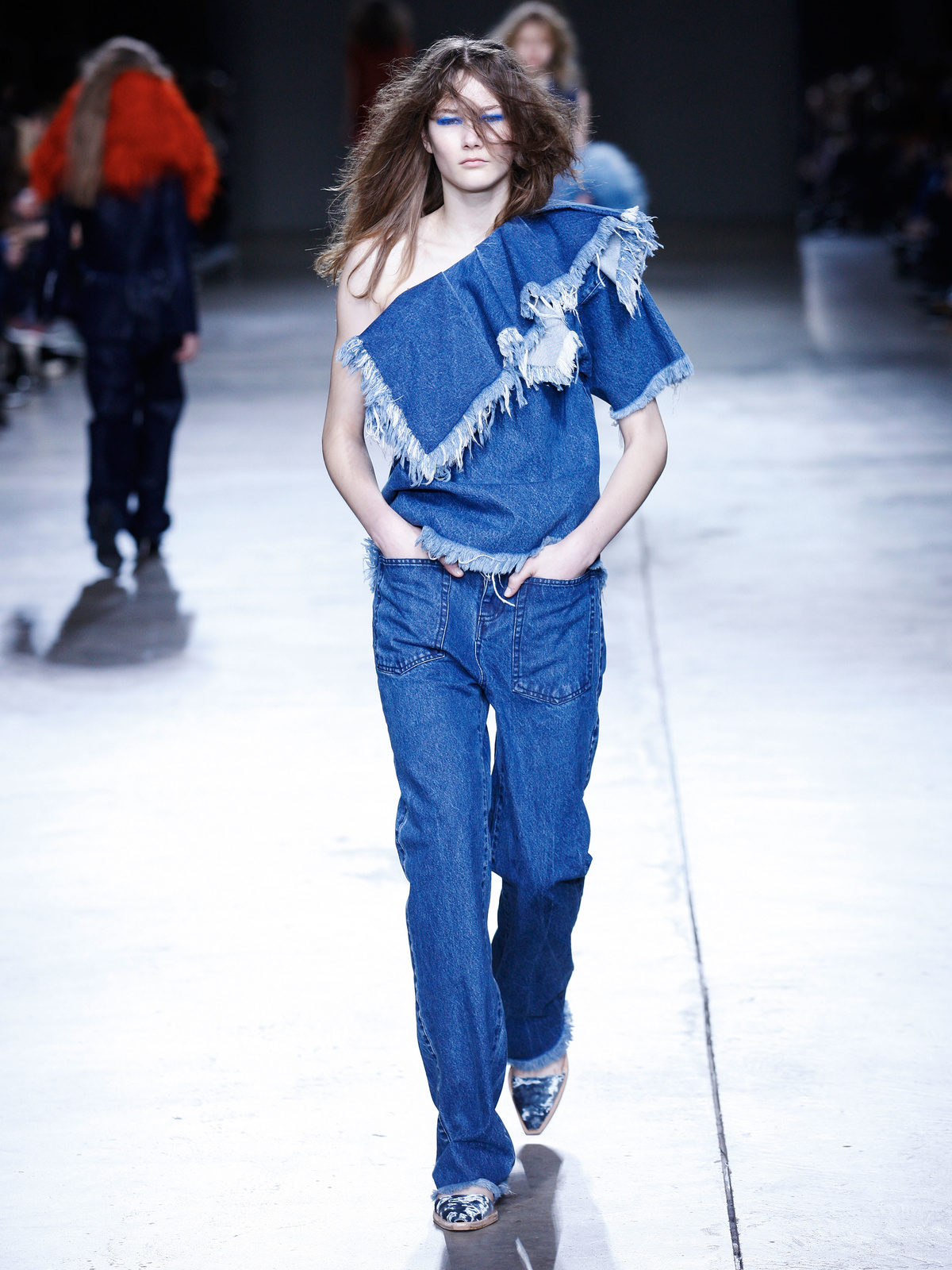 “Guitar bums and stoned-out beauties in Victorian dresses. Junkie poets, playwrights, broke-down filmmakers, and French actors. Everybody passing through here is somebody, if not in the outside world.” That was Patti Smith’s description in her book Just Kids, of New York’s Hotel Chelsea, where she lived with her boyfriend Robert Mapplethorpe in the 70s and again on her own in the 90s. The struggling artists, free minds, poets and musicians that passed through it’s doors are the inspiration for Marques’Almeida this season. Their trademark raw, frayed denim was mixed in with lush fur, crushed velvet and glamourous satin slip dresses. Trousers were hipsters and tops were off the shoulder. These are the world’s coolest new Chelsea girls…