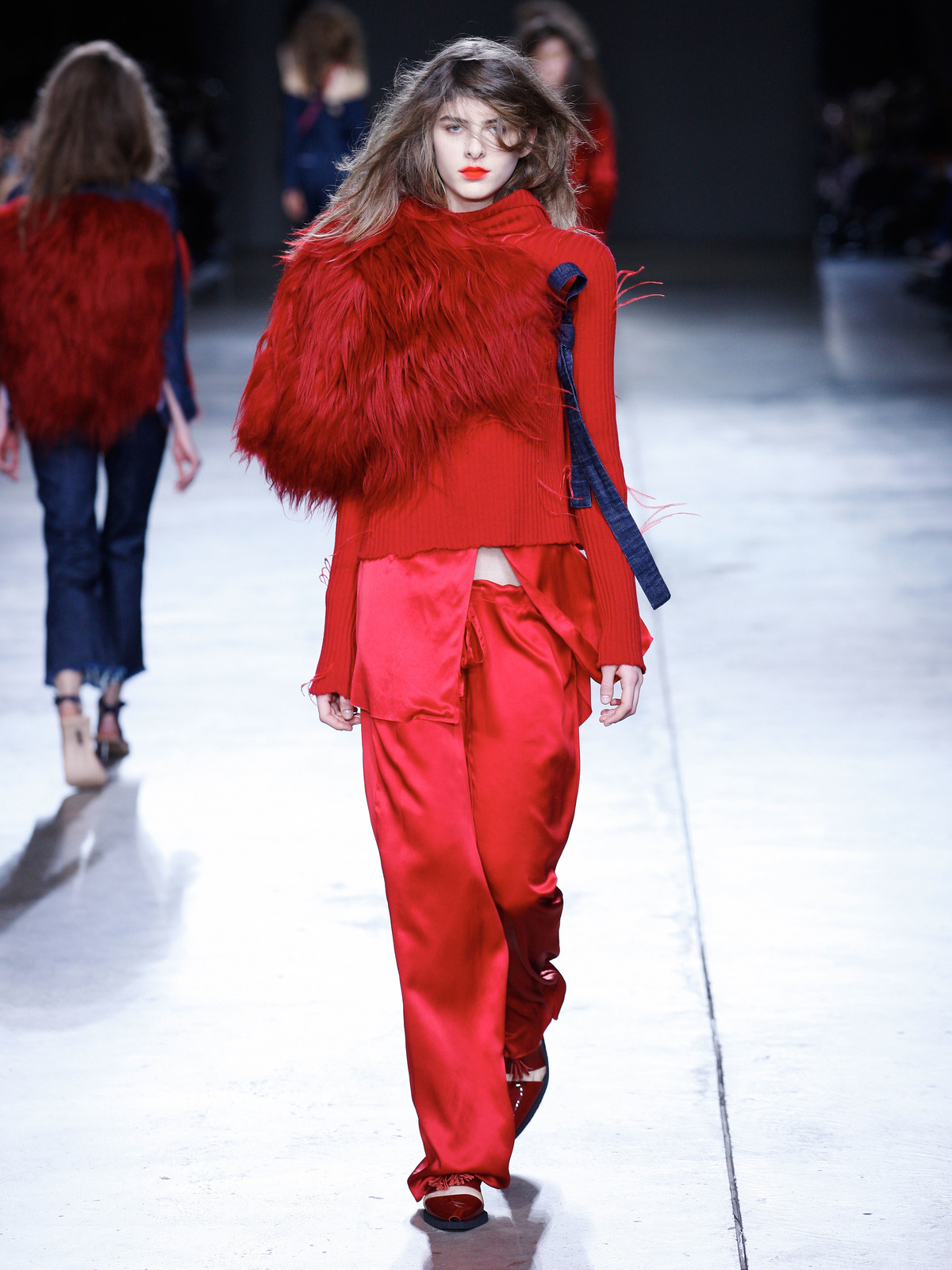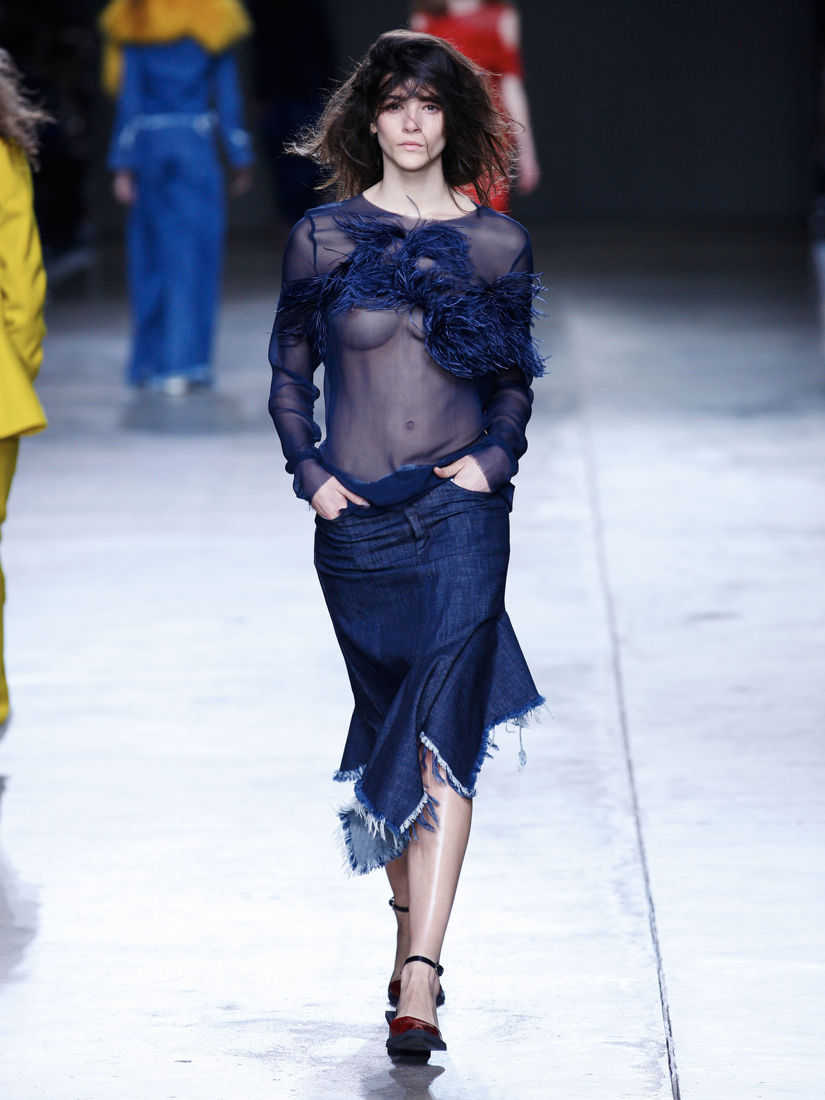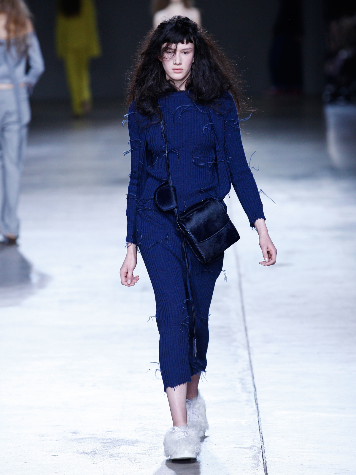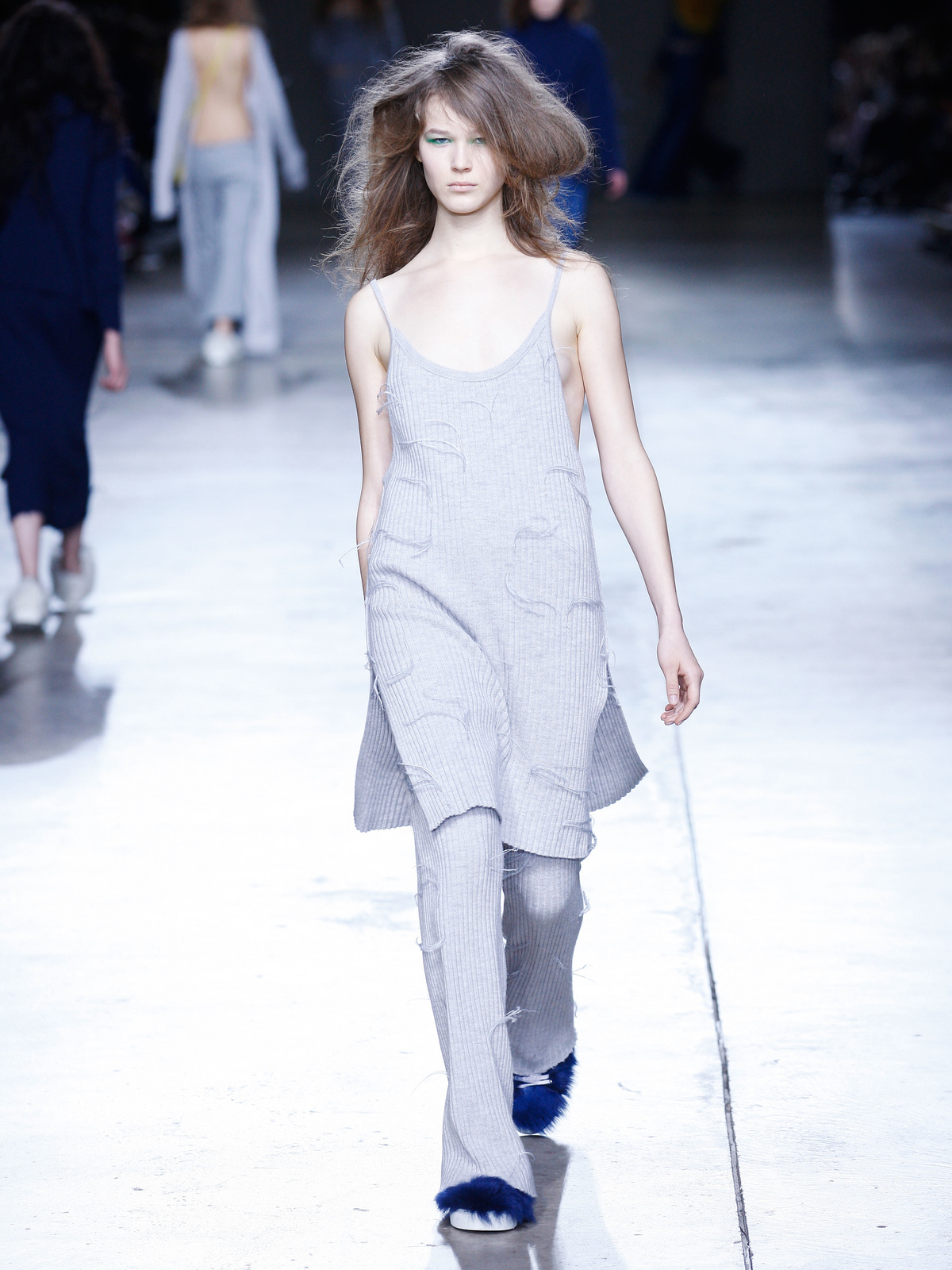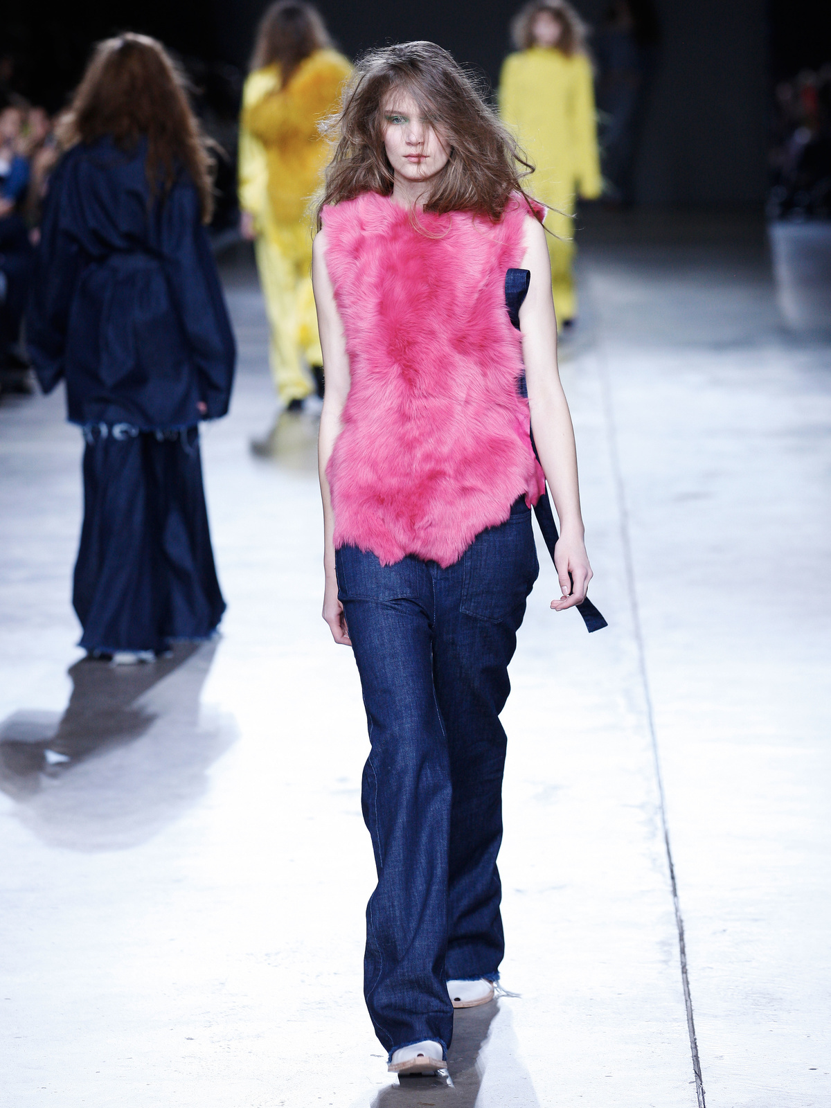 “Guitar bums and stoned-out beauties in Victorian dresses. Junkie poets, playwrights, broke-down filmmakers, and French actors. Everybody passing through here is somebody, if not in the outside world.” That was Patti Smith’s description in her book Just Kids, of New York’s Hotel Chelsea, where she lived with her boyfriend Robert Mapplethorpe in the 70s and again on her own in the 90s. The struggling artists, free minds, poets and musicians that passed through it’s doors are the inspiration for Marques’Almeida this season. Their trademark raw, frayed denim was mixed in with lush fur, crushed velvet and glamourous satin slip dresses. Trousers were hipsters and tops were off the shoulder. These are the world’s coolest new Chelsea girls…