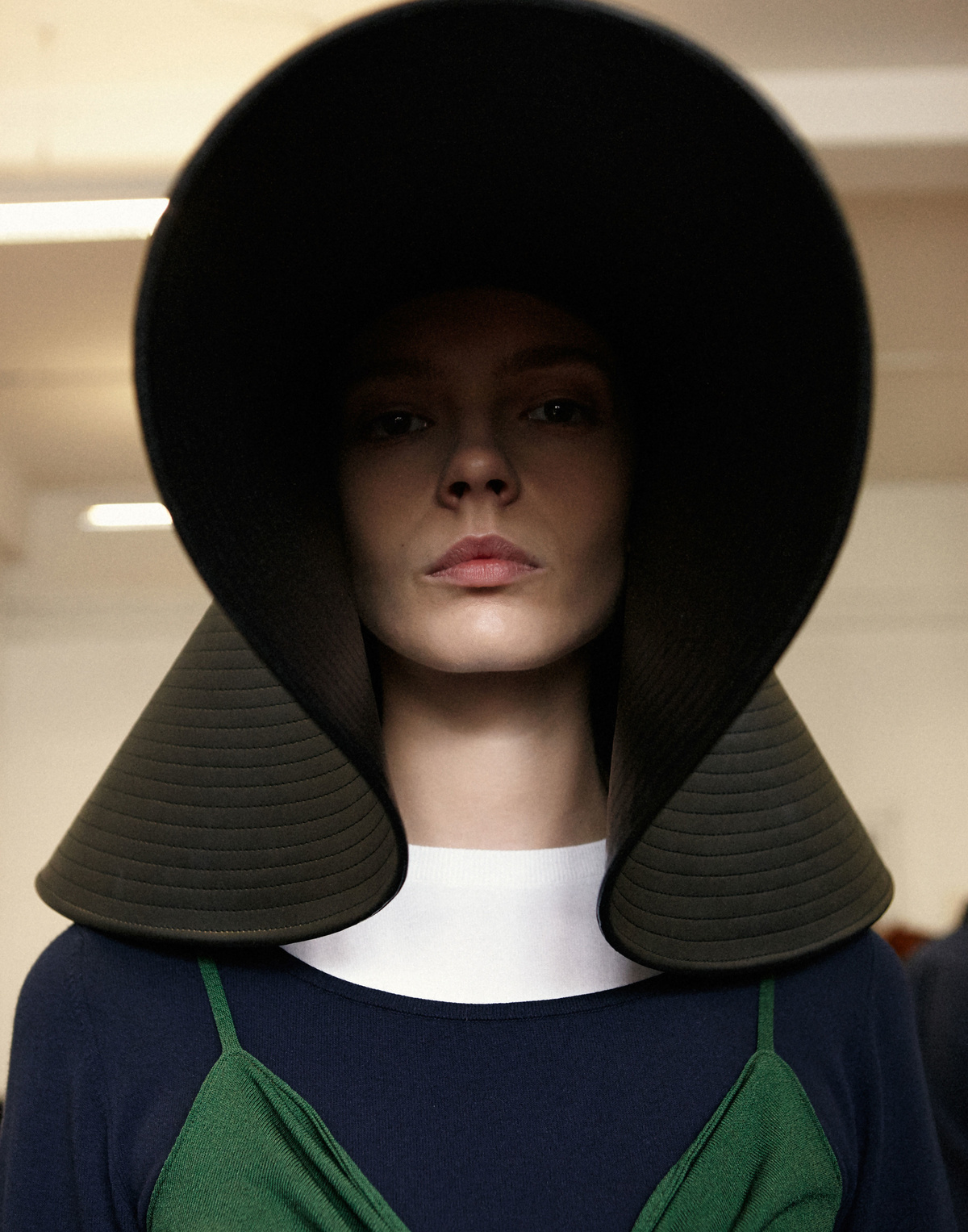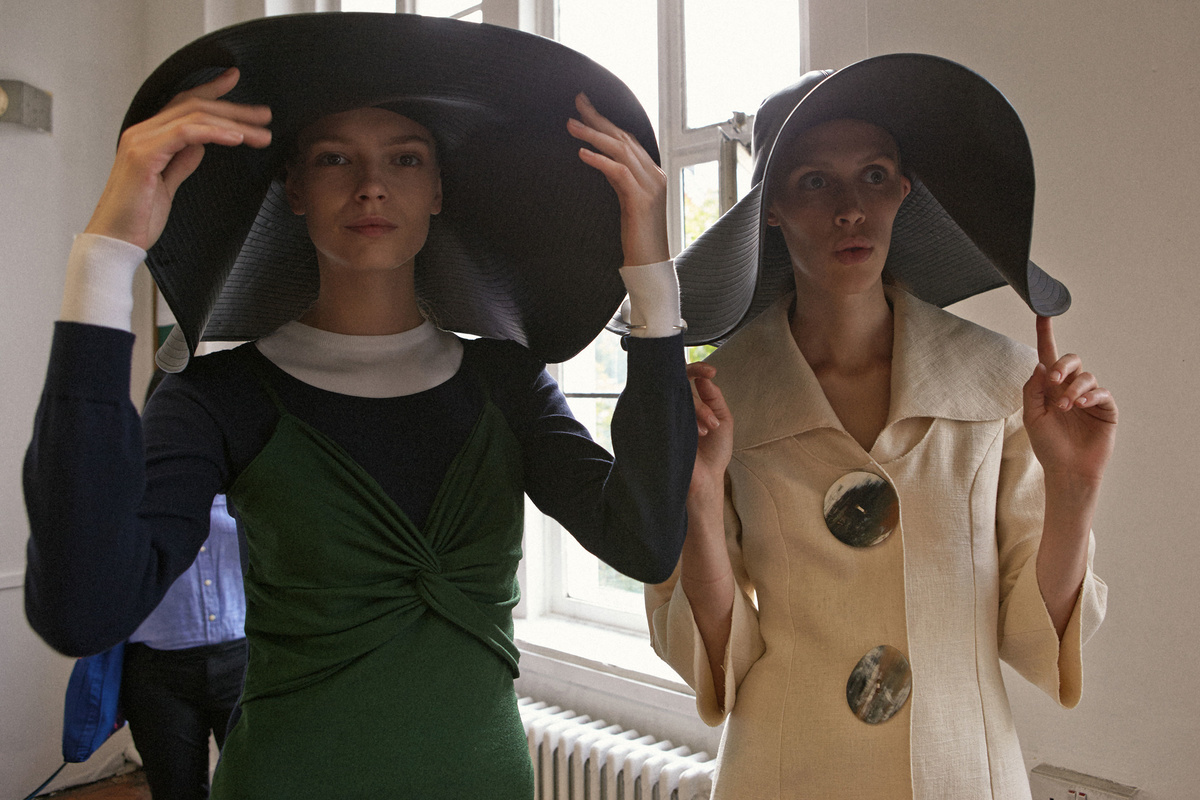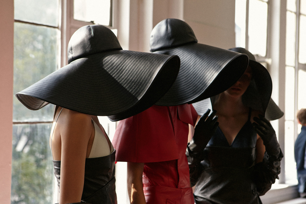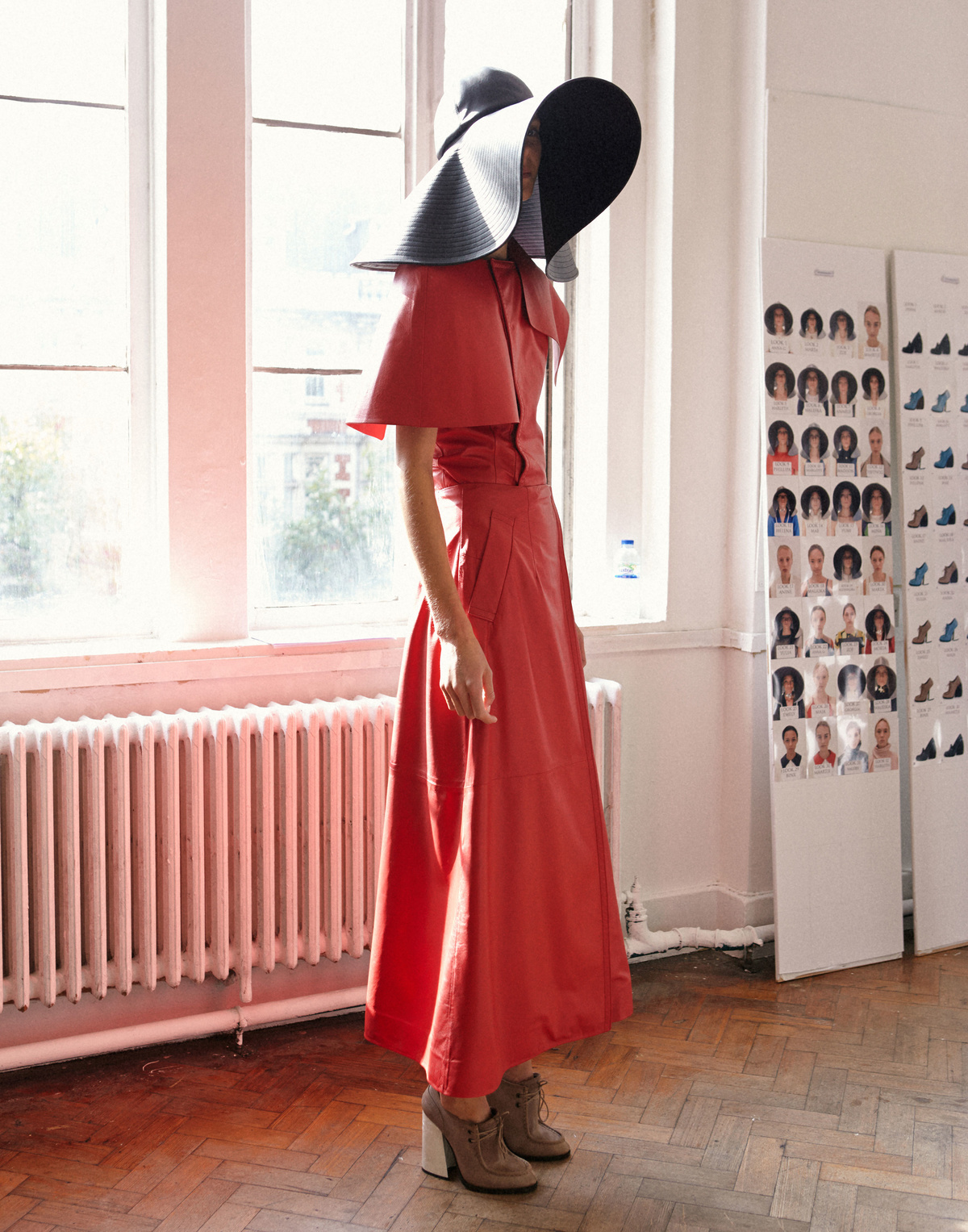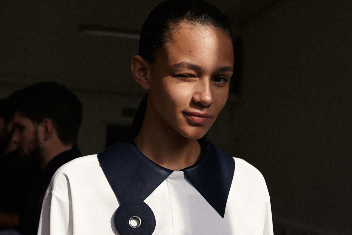 A light-hearted nautical theme prevailed throughout, with backwards sailor trousers – buttons on the back, pockets on the front – and stiff white sail dresses woven with rope. “We developed a lot of fabrics this season in Ireland,” Jonathan told i-D. “I think it’s impossible to make garments if you don’t know exactly what the fabric can do”. Things took a slightly darker turn with the thick yet loose leather gloves, reaching right up to the elbow and presenting themselves as the perfect murder accessory for his femmes fatales. Post-crime, the beauties donned their red leather geometric dresses and gold puzzle piece chokers and enjoyed being by the sea.