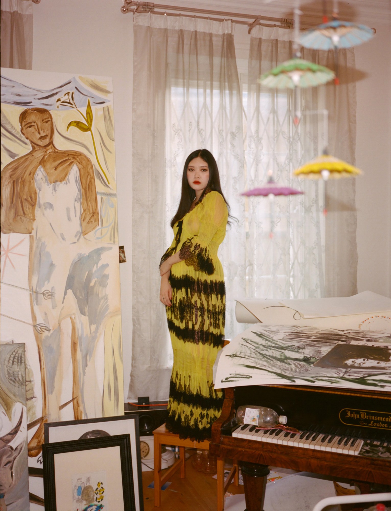 Faye Wei Wei was raised in the harsh grey of south London with, as she puts it, “nothing delicious for the eyes.” Perhaps that’s why she’s always been so obsessed with creation, so brilliant at dreaming up fantasy worlds in full colour. To a soundtrack of Arthur Russell, Björk and Mitski, the 24-year-old layers oil paints on canvas in a studio full of flowers, Japanese seashells and plenty of jasmine tea. The result? Beautiful dark fantasy tapestries shrouded in love, symbolism and poetry; black velvet flowers, mysterious women in great dresses, hearts, plants, devils, leopards, giant snakes and androgynous merpeople.