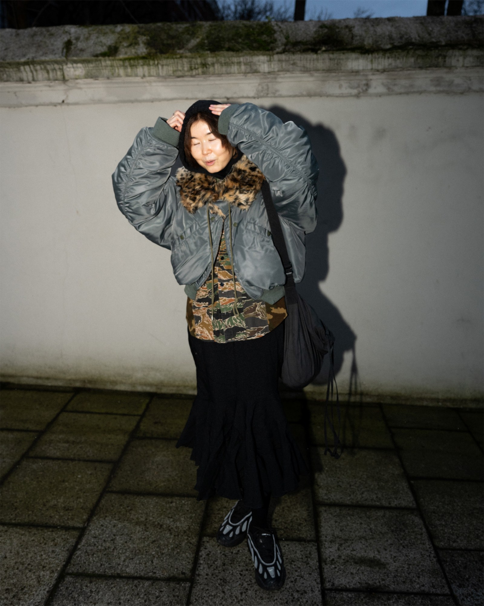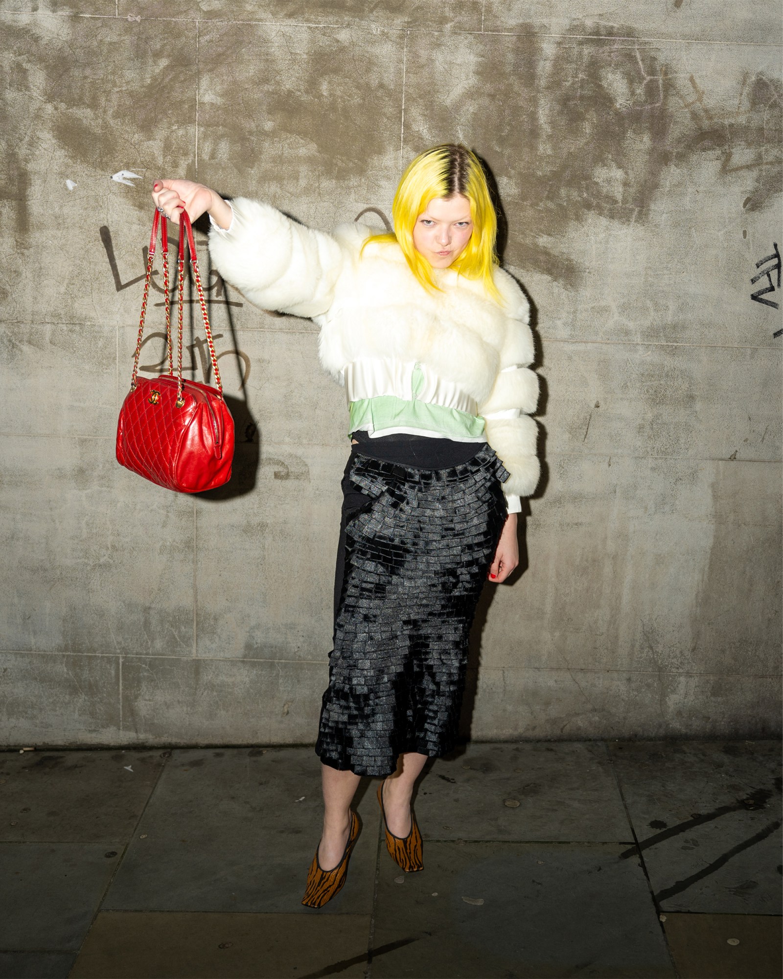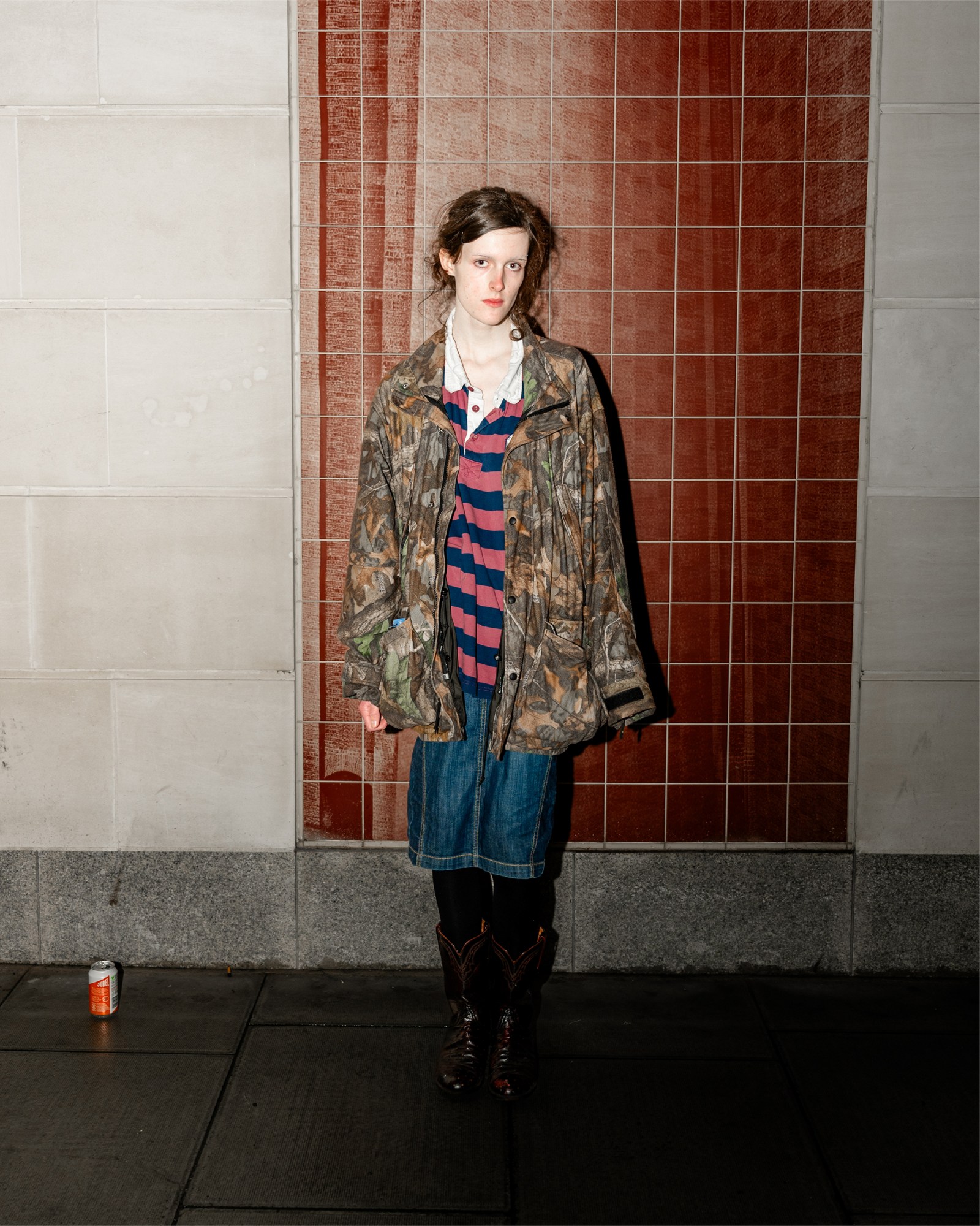 What do you do? Professional slacker/booker for @transgression.presents. Where are you from? Hertfordshire. What are you wearing? Camo hunting jacket, rugby shirt, denim skirt & ostrich leather boots. Favorite show so far? CSM MA Fashion alternate show. Where’s best to shop? Evil vintage. Who is your style icon? Lou Reid. Fashion week survival tip? One million cigarettes. Go-to snack between shows? Liquorice.