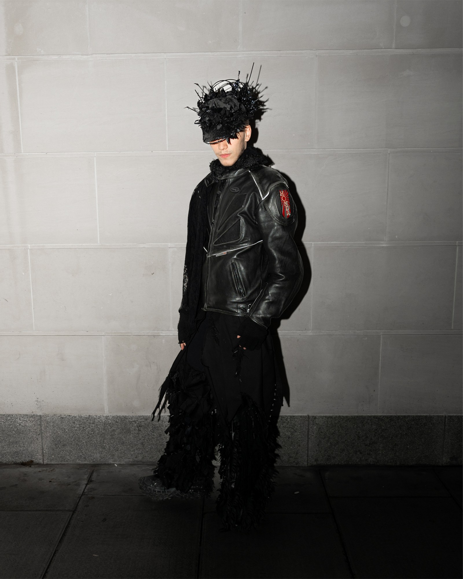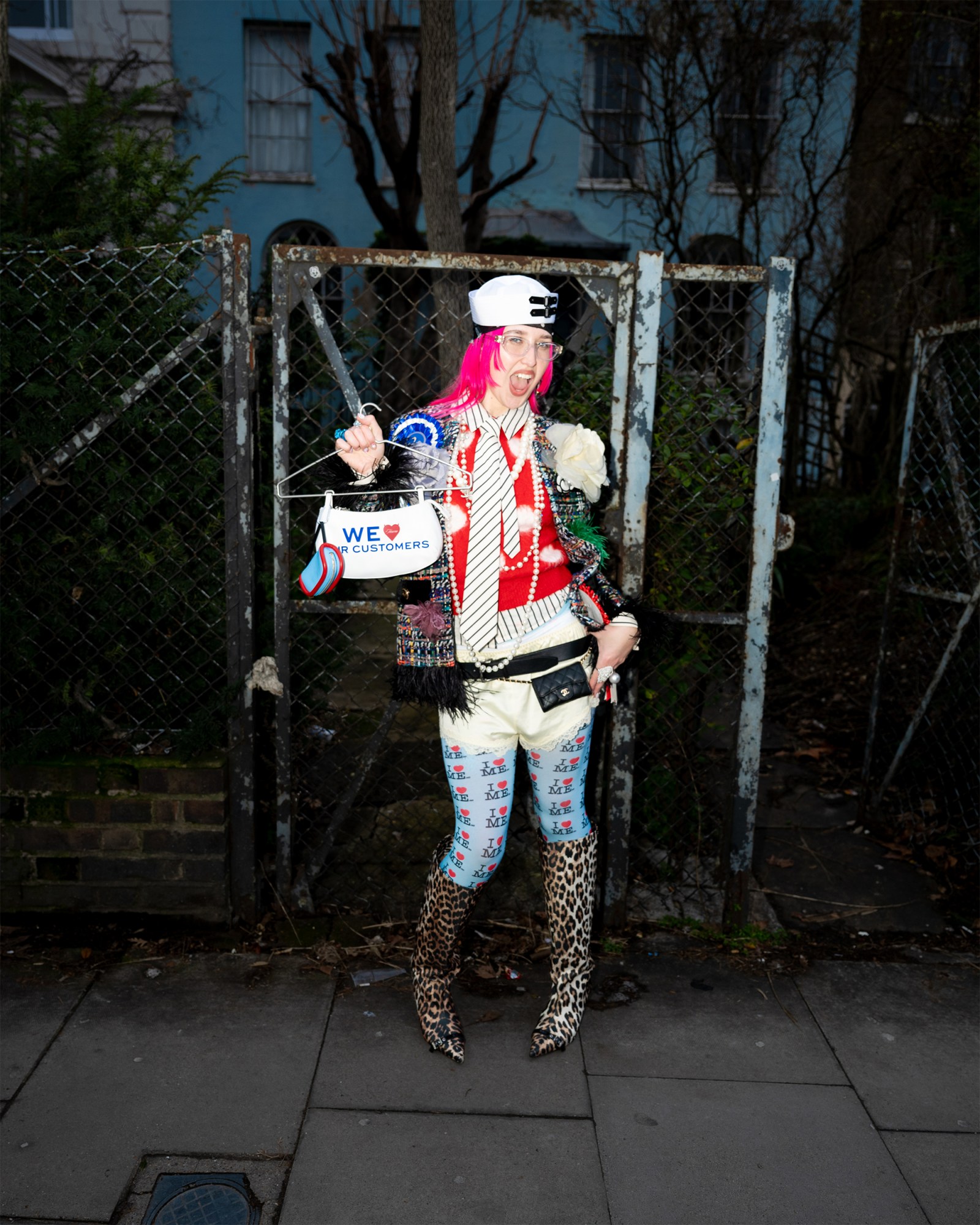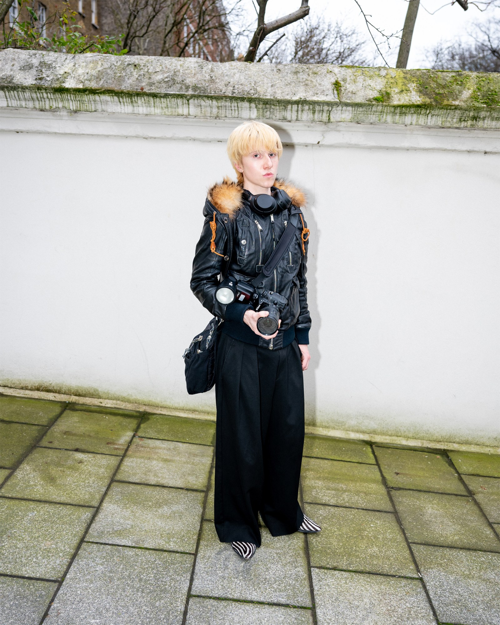 What do you do? Self portrait artist. Where are you from? London. What are you wearing? An antique bed suit slashed in half by yours truly. Best place to shop? Any charity shop north of the river. Who is your style icon? Kylie Minogue. Fashion week survival tip? Water and airpods. Go-to snack between shows? Greggs vegan rolls.