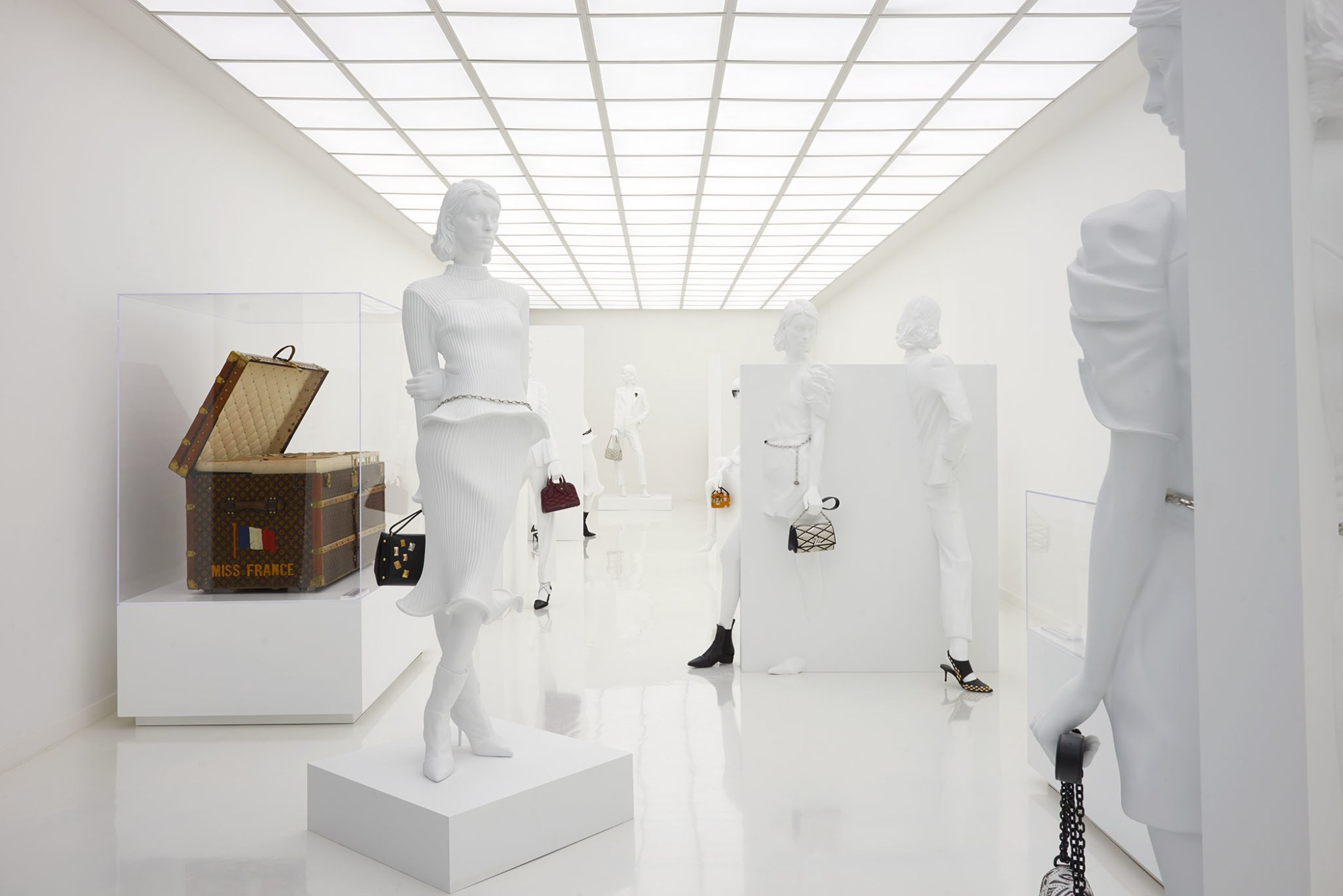 Roam from dark rooms of quiet creativity to blinding white spaces that present accessories from the oldest LV trunks to the latest bags. Since the show is a way of bringing Louis Vuitton’s Palm Springs show to life in London, there are references to the architecture Ghesquière was so drawn to in the modernism of the California desert town: the heavenly walk-in wardrobe with plush cream carpets and Perspex show boxes, as well as the seating that was used in the cruise collection show.