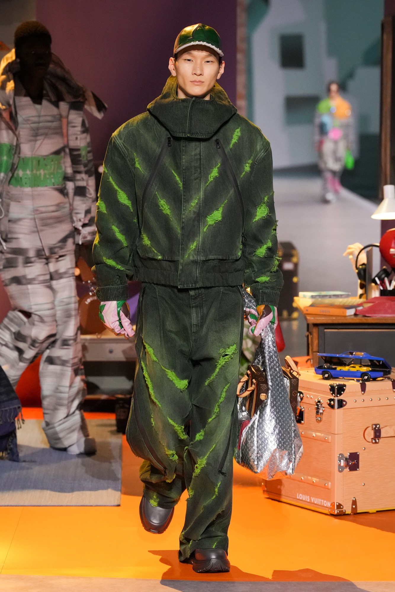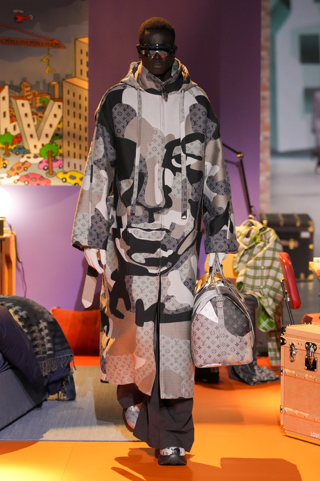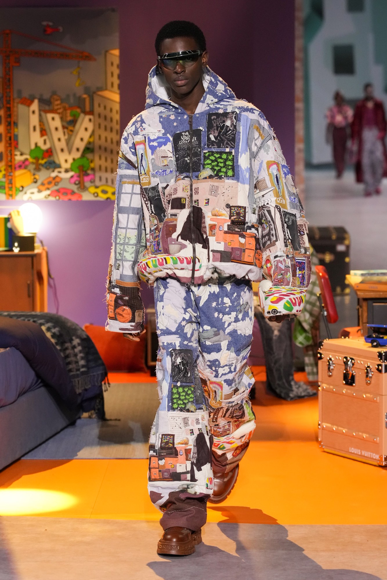 Outside Louis Vuitton’s AW23 menswear show, thousands of teenagers are cheering on the Essex guy from Emily in Paris as he jumps on top of a limousine. Inside, a maze of quintessentially adolescent bedrooms designed by the Gondry brothers, and Spanish superstar Rosalía staging a full-on pop performance that’s part vocal part immersive role play. Welcome to the Louis Vuitton circus, a kaleidoscopic universe, a sort of weird-and-wonderful playground where bright colours, countless celebrities and as many LV logos as possible come to life on a giant catwalk. Since the passing of Virgil Abloh, the house has been producing studio-designed collections that riff on the themes of his collections, ostensibly getting bigger and more spectacular by the season. This time round, the house announced the collection would be under the creative direction of KidSuper’s New York-born designer, Colm Dillane, as well as stylist Ib Kamara. Together, they developed a collection that continued on one of Virgil’s leitmotifs: the tropes of childhood, reimagined as kitsch luxury.