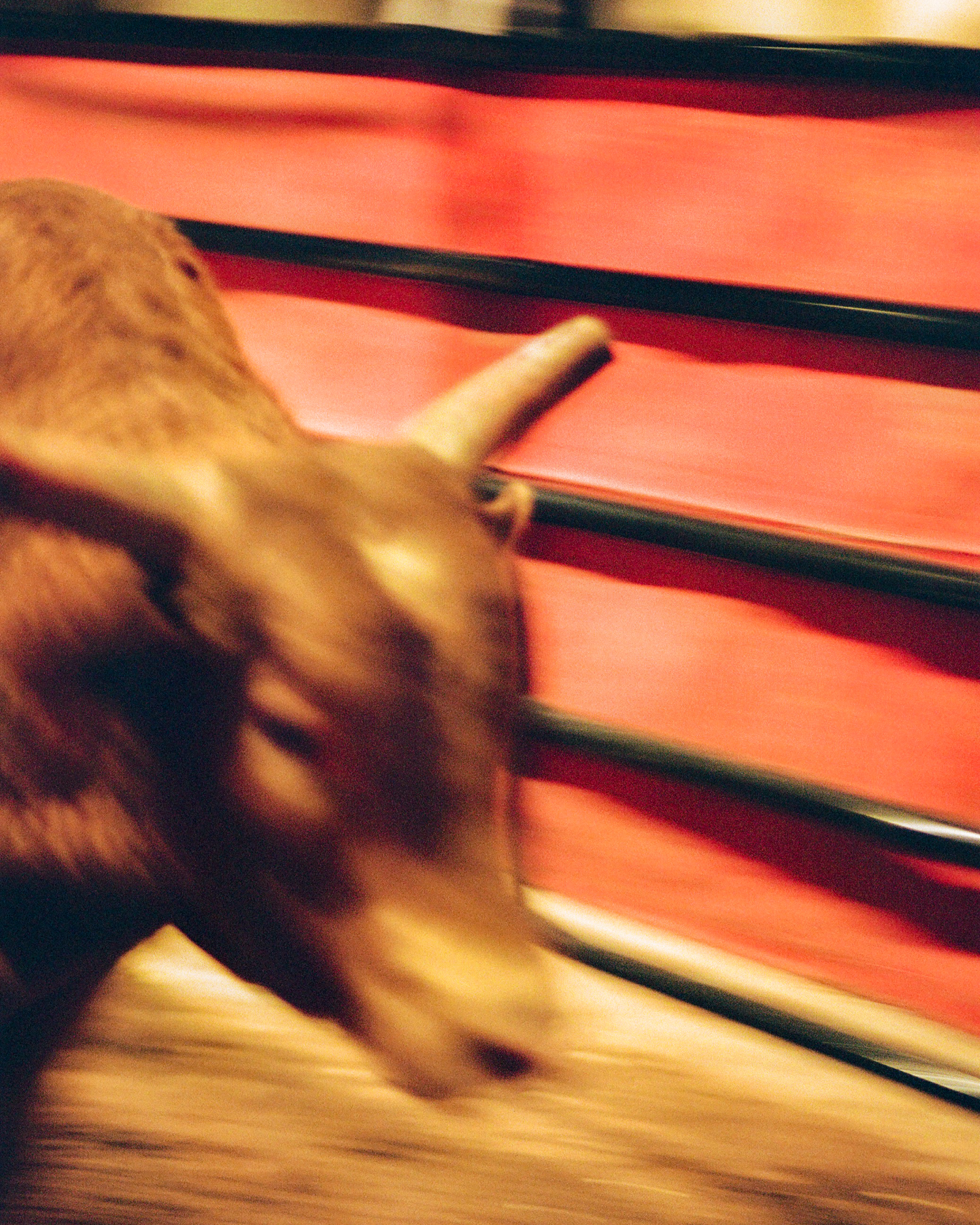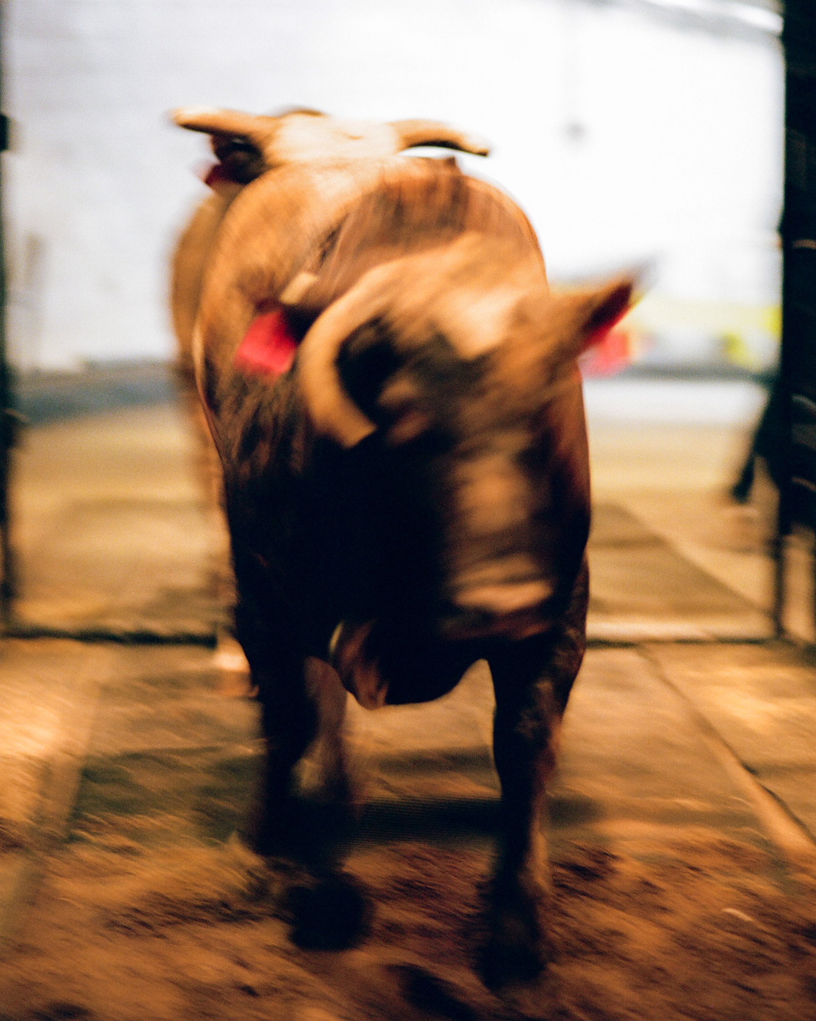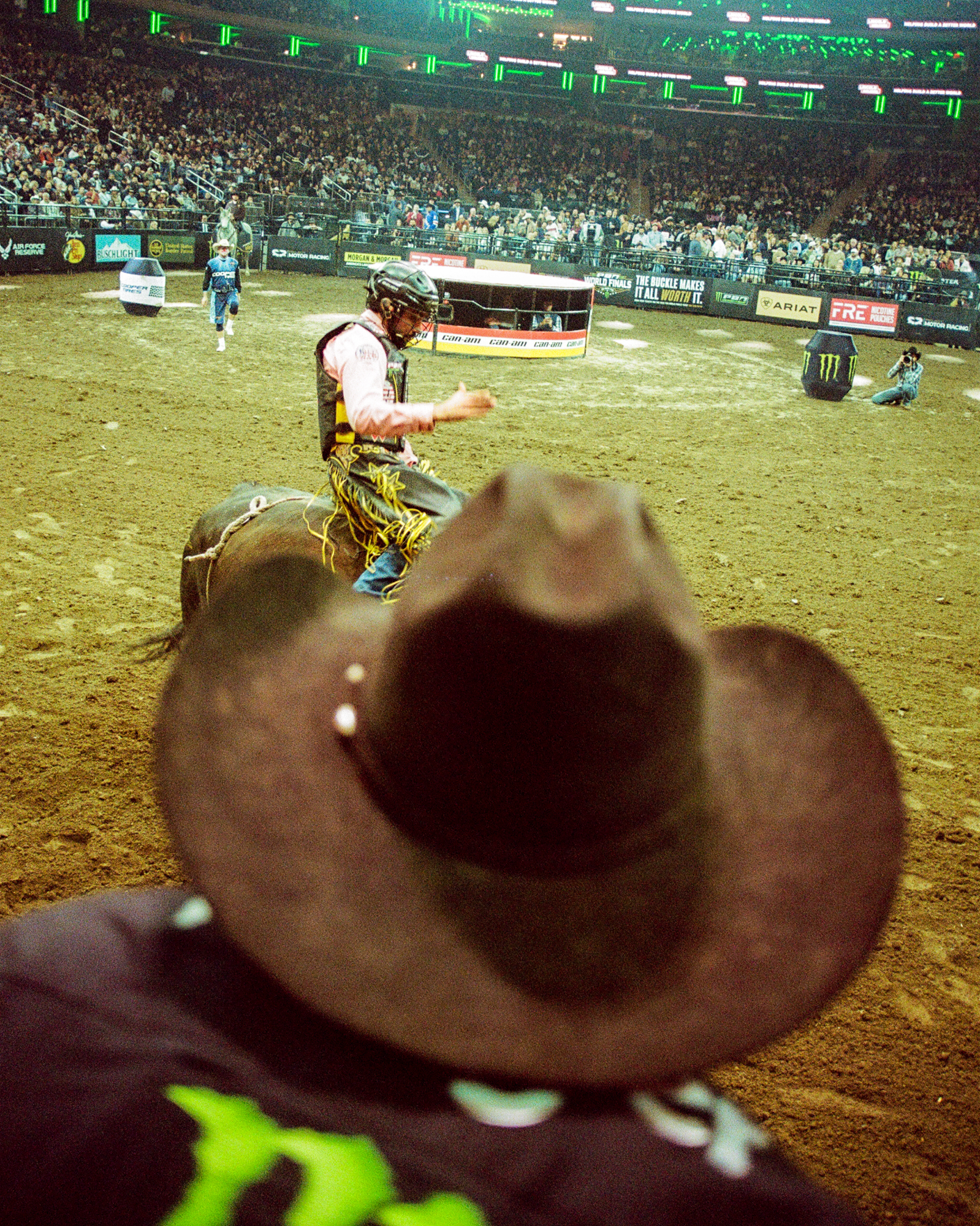 I arrive early and am greeted by the smell of manure as I make my way toward the press suite. Crew members in cowboy hats move across the space, adjusting gates and testing lights. The arena taking its new form. The day begins with the Running of the Bulls, late in their arrival after being momentarily folded into the Midtown gridlock alongside morning commuters and tourists alike. Each bull is guided up a winding five-flight ramp into the building.