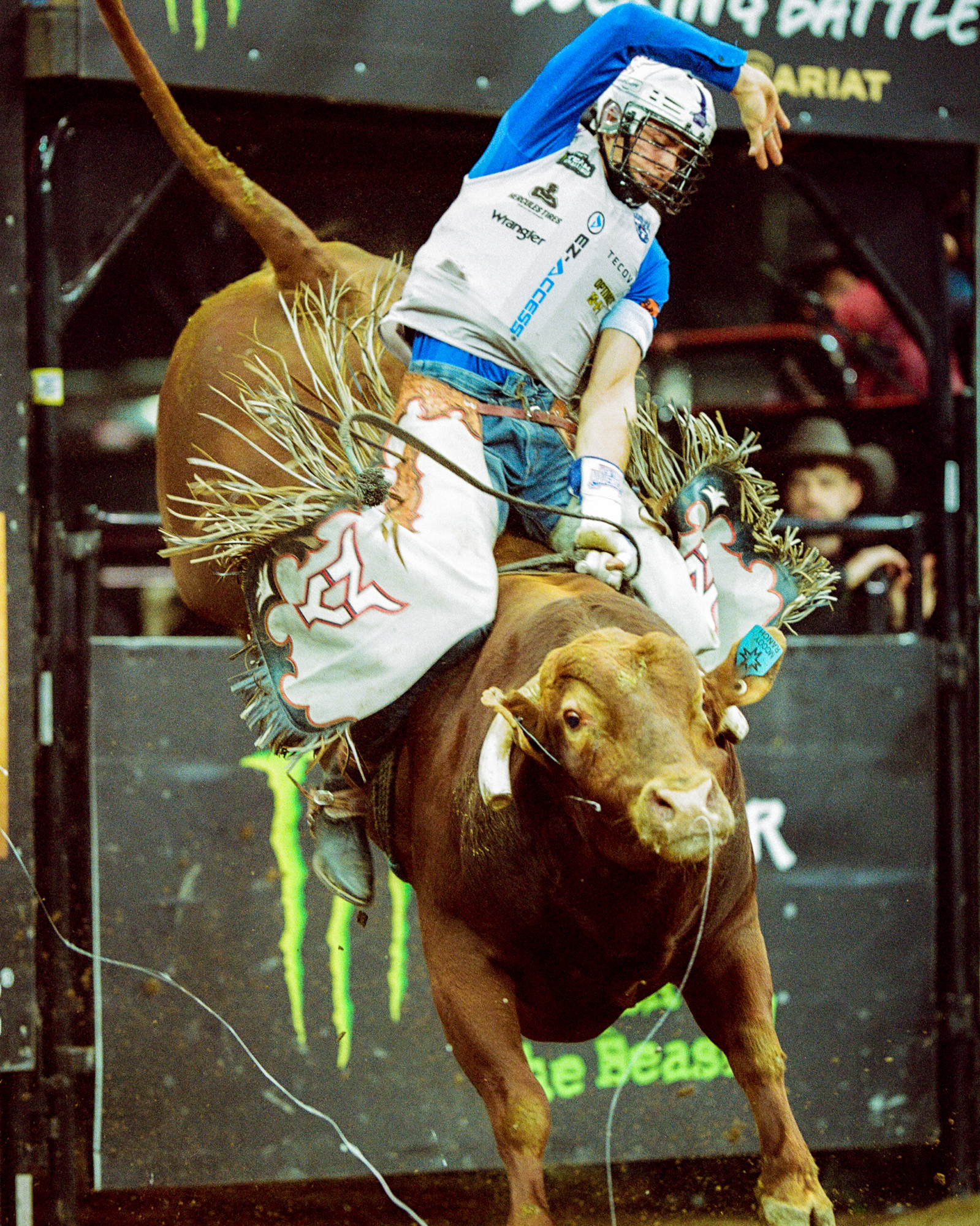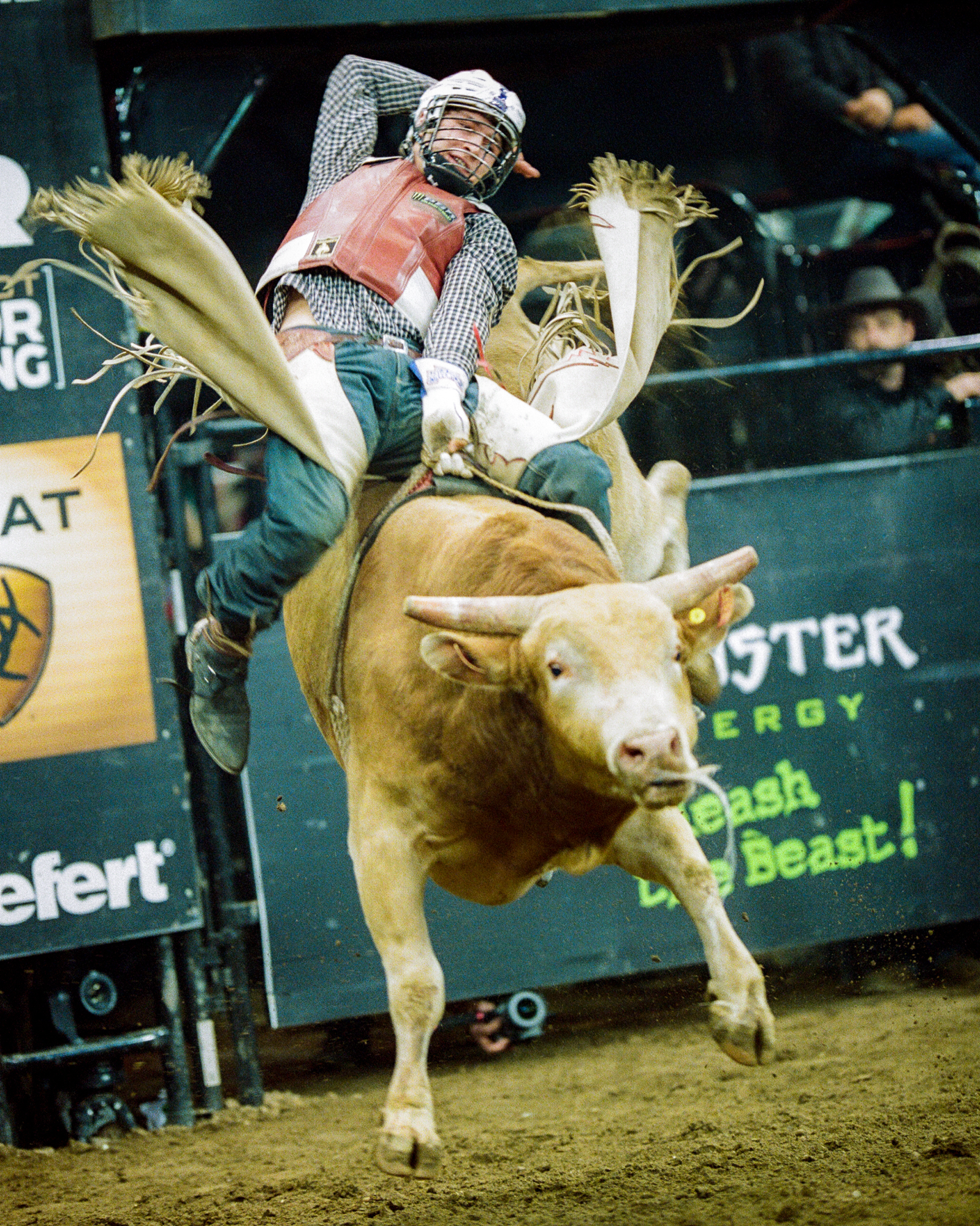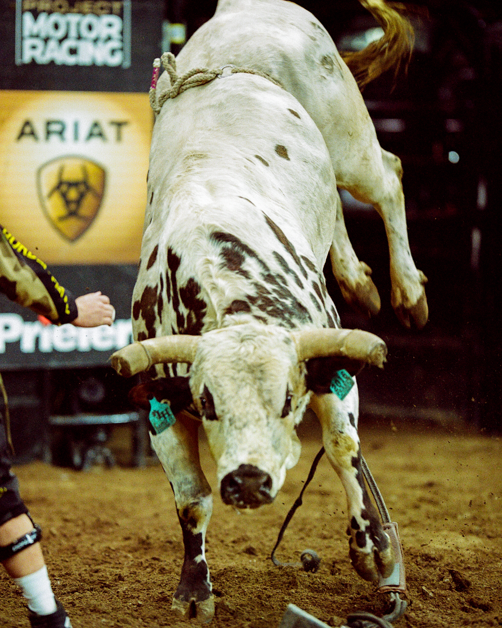 The top forty bull riders in the world are each competing for the weekend’s grand prize: forty thousand dollars and a sterling silver belt buckle. The rules are simple. A rider must remain mounted for eight seconds to earn a score. The relationship between rider and bull is not purely adversarial. There’s the careful touch of a rider’s hand against the bull’s back. The pause before the gate opens. The way the arena seems to inhale when man and animal meet. Despite the intensity of the spectacle, the crowd remains buoyant, there to experience the match of cowboy and beast, and to have a few cold beers while they are at it. The best rides require a strange, fleeting collaboration between rider and bull.