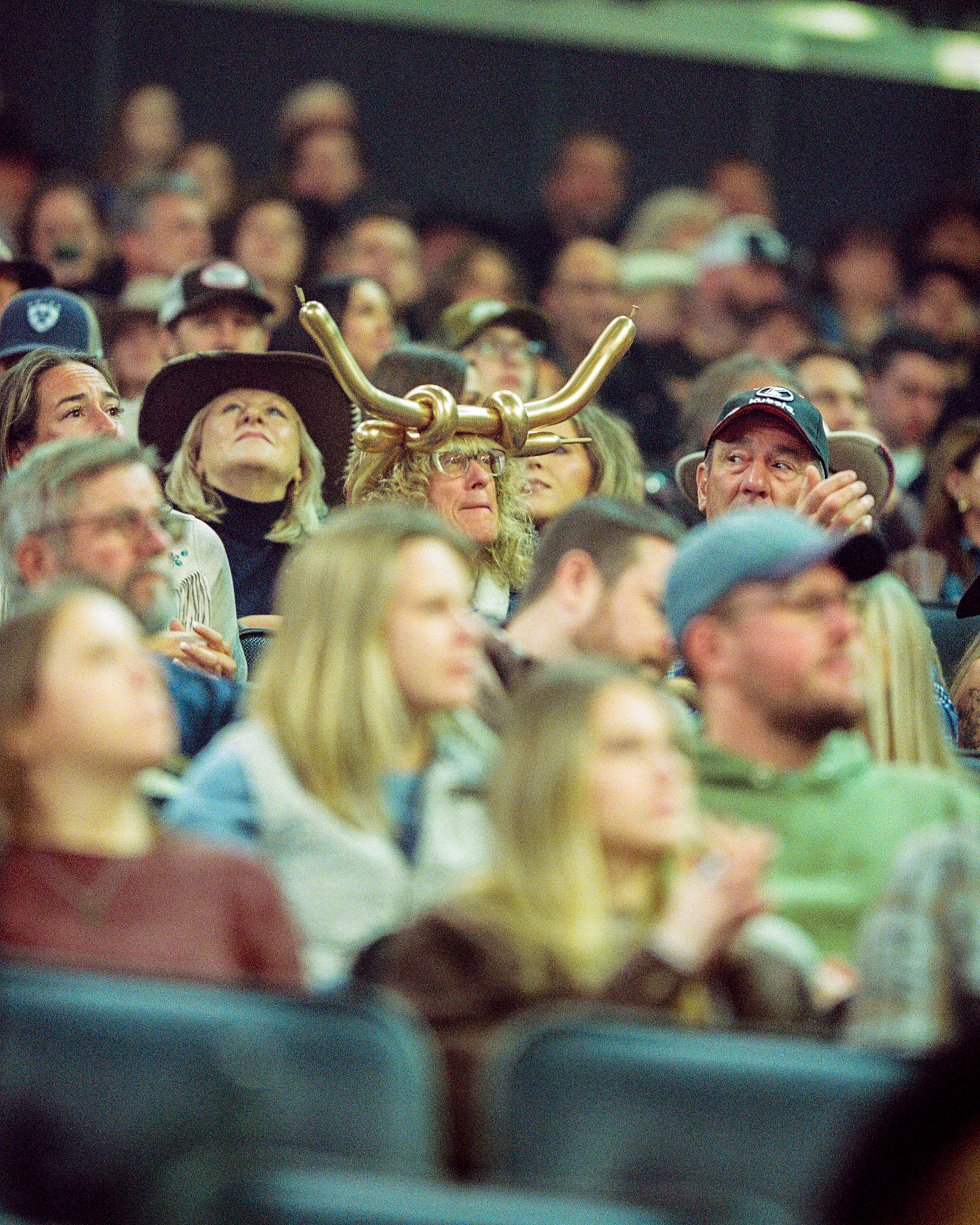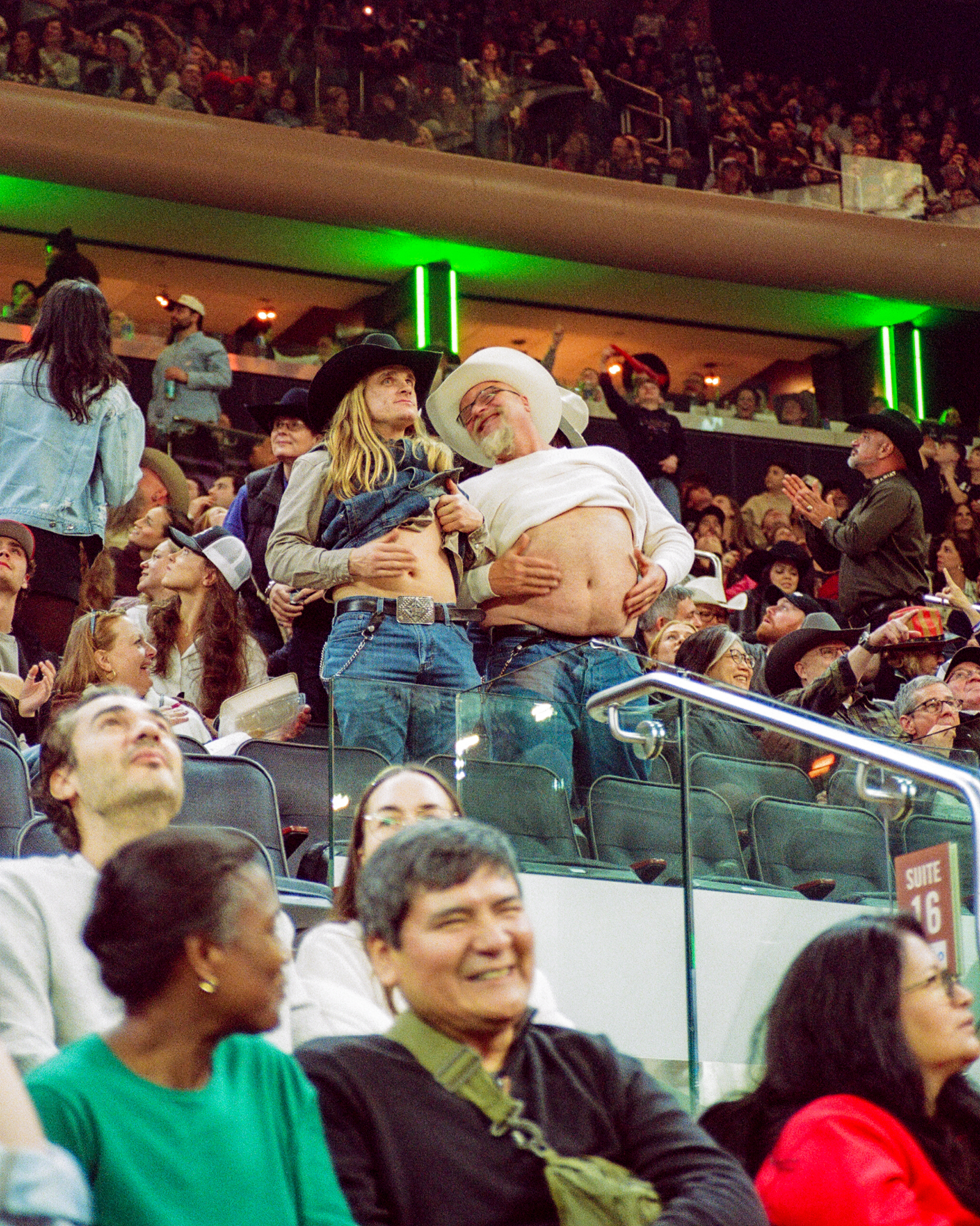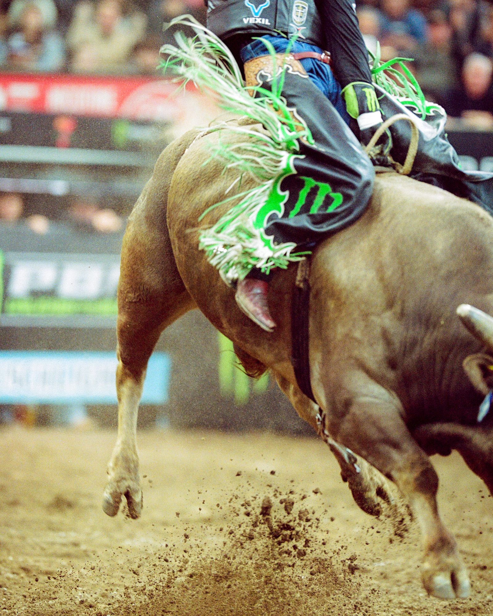 The top forty bull riders in the world are each competing for the weekend’s grand prize: forty thousand dollars and a sterling silver belt buckle. The rules are simple. A rider must remain mounted for eight seconds to earn a score. The relationship between rider and bull is not purely adversarial. There’s the careful touch of a rider’s hand against the bull’s back. The pause before the gate opens. The way the arena seems to inhale when man and animal meet. Despite the intensity of the spectacle, the crowd remains buoyant, there to experience the match of cowboy and beast, and to have a few cold beers while they are at it. The best rides require a strange, fleeting collaboration between rider and bull.