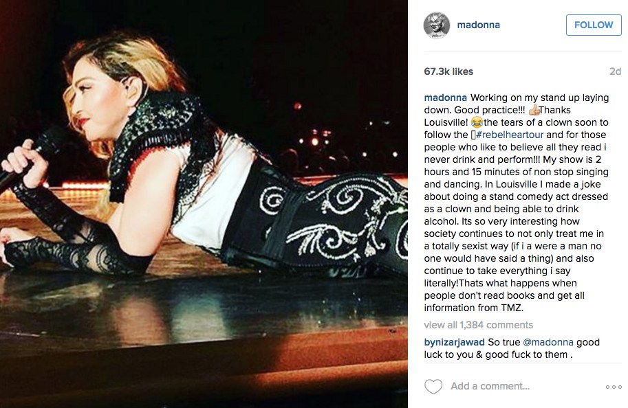 Madonna went on to point out the inherent sexism in these reports, explaining: “In Louisville I made a joke about doing a stand up comedy act dressed as a clown and being able to drink alcohol. Its so very interesting how society continues to not only treat me in a totally sexist way (if i a were a man no one would have said a thing) and also continue to take everything i say literally!”