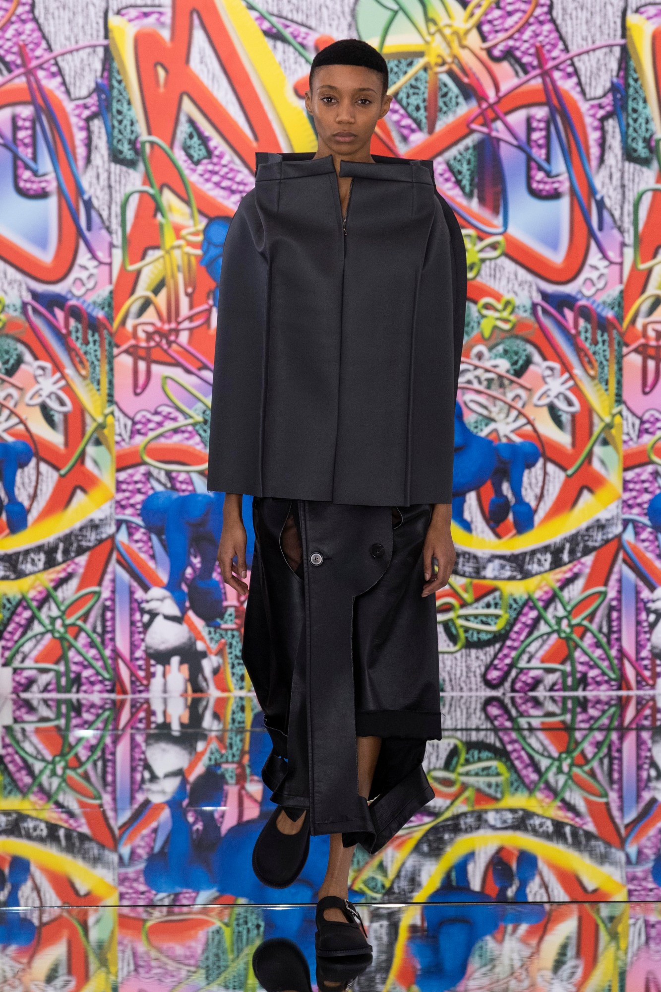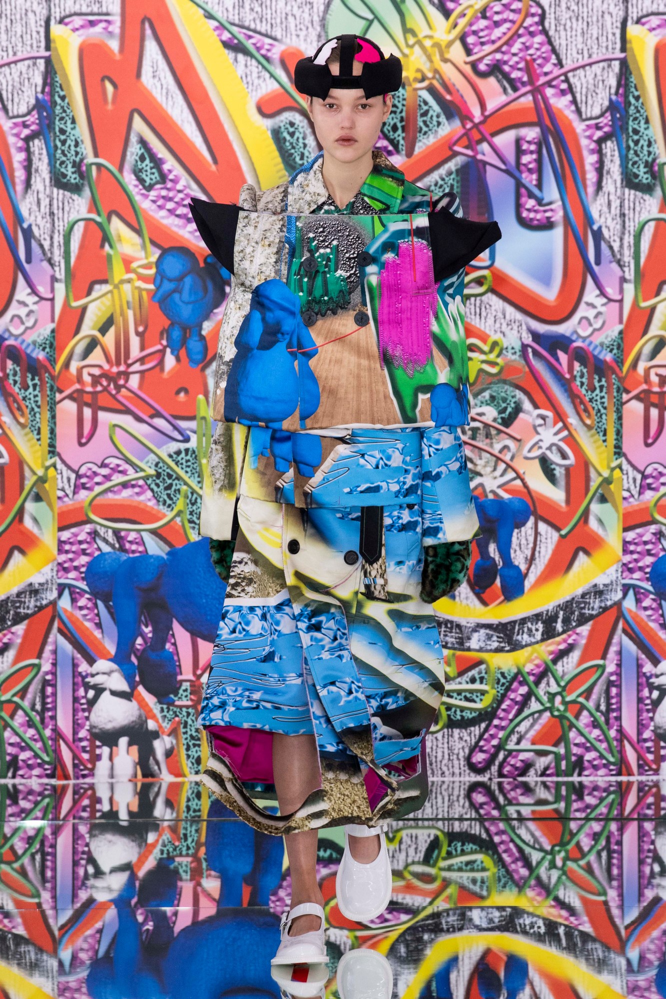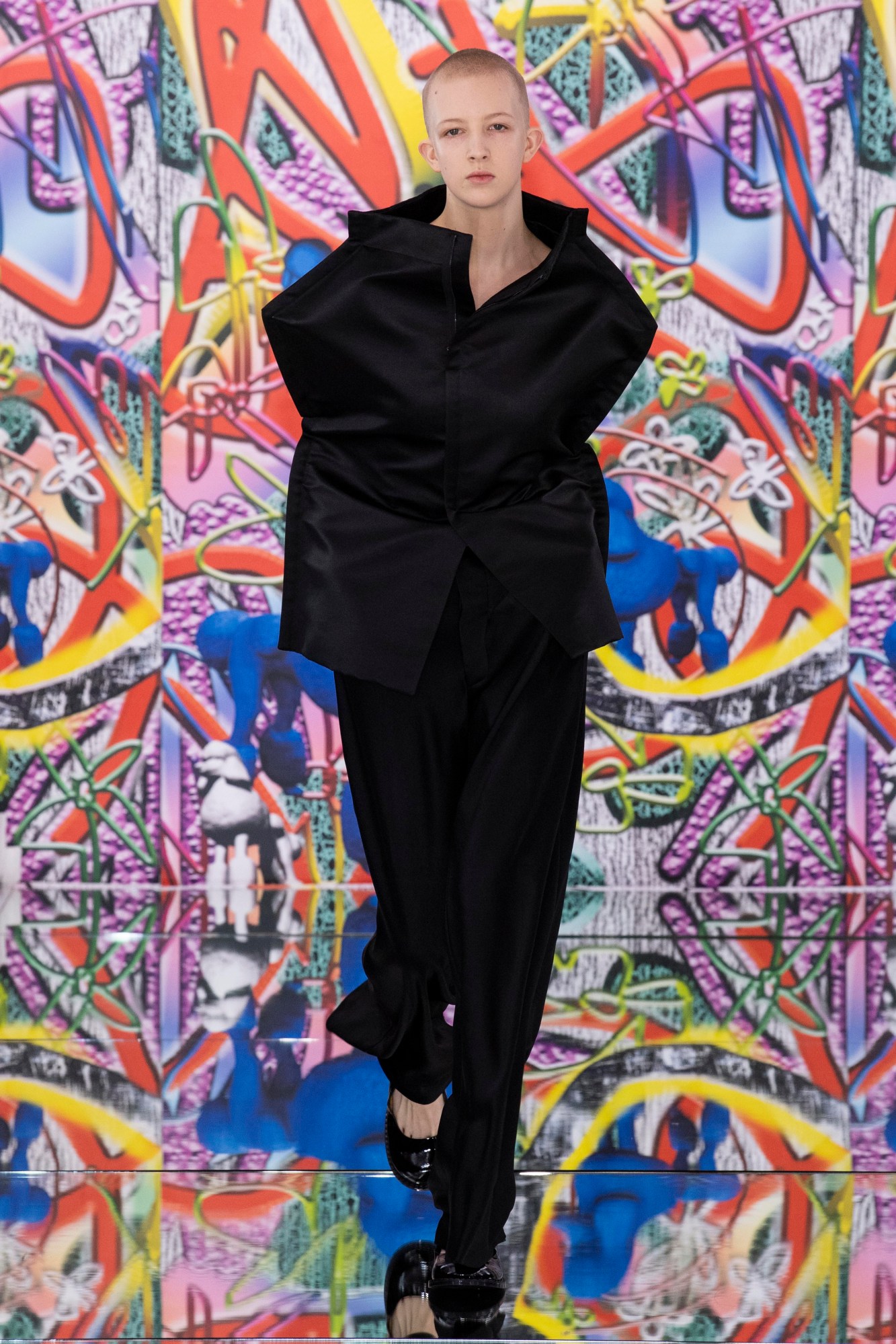 All this sumptuous fabrication was offset by chaotically printed duchesse satin — which Galliano referred to as the “sequence print” — all digitally-conceived freeze-frames, including a 3D rendered poodle. There were hints of the quintessentially decadent 18th Century, too: corstry ribbons; neon pink bag wigs; exaggerated cuffs. Why? Galliano said he couldn’t help himself. It proved that no one is better placed to make decadence so apt for today.