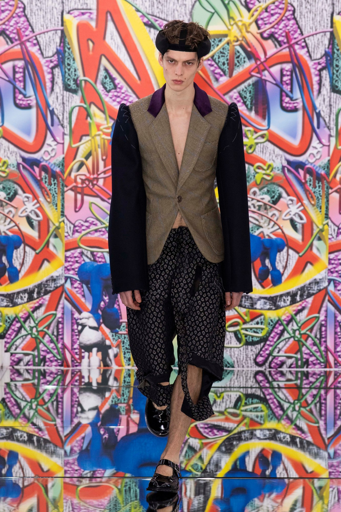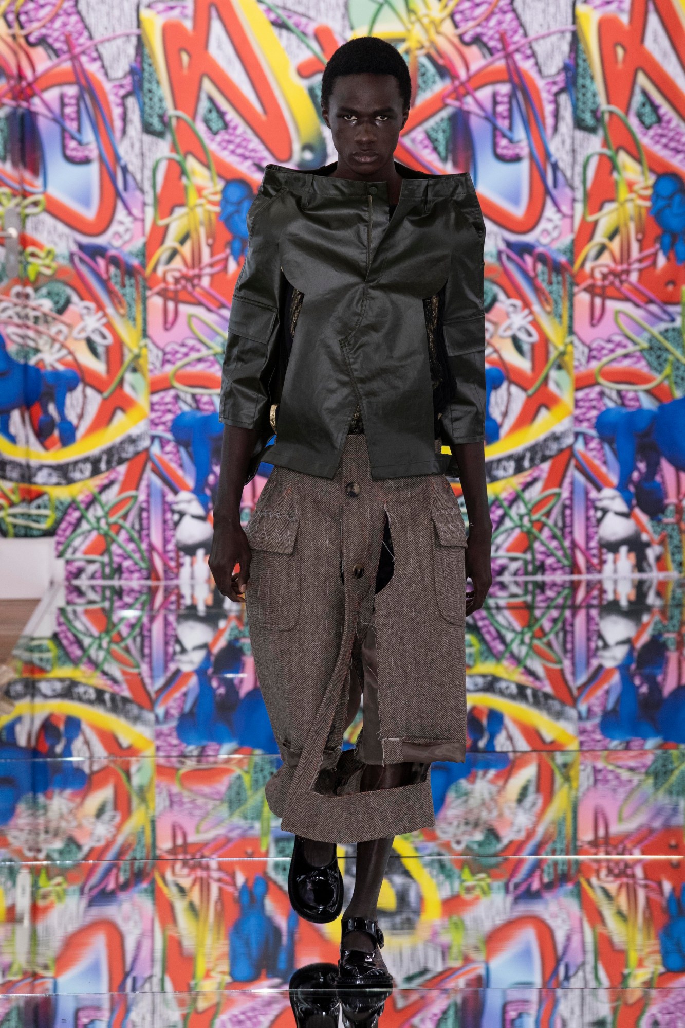 The show started with Galliano’s vision of cultural couture chaos. “It was the idea that inverted excess could lead to something a little more minimal,” he said. “To get to that I felt I had to emotionally create this chaos that we’re living in now.” Look closely and you’ll notice that so many of the looks centred on the combination of a trench coat and skate shorts, artfully hybridised as one with the lining of the latter opened up on the thigh so the seams of the inner leg become the silhouette. Many were given the house-classic décortiqué treatment, which Galliano uses to imbue the ‘memory’ of new garments upon familiar forms, toying with the original Margialisms of deconstruction and reconstruction.