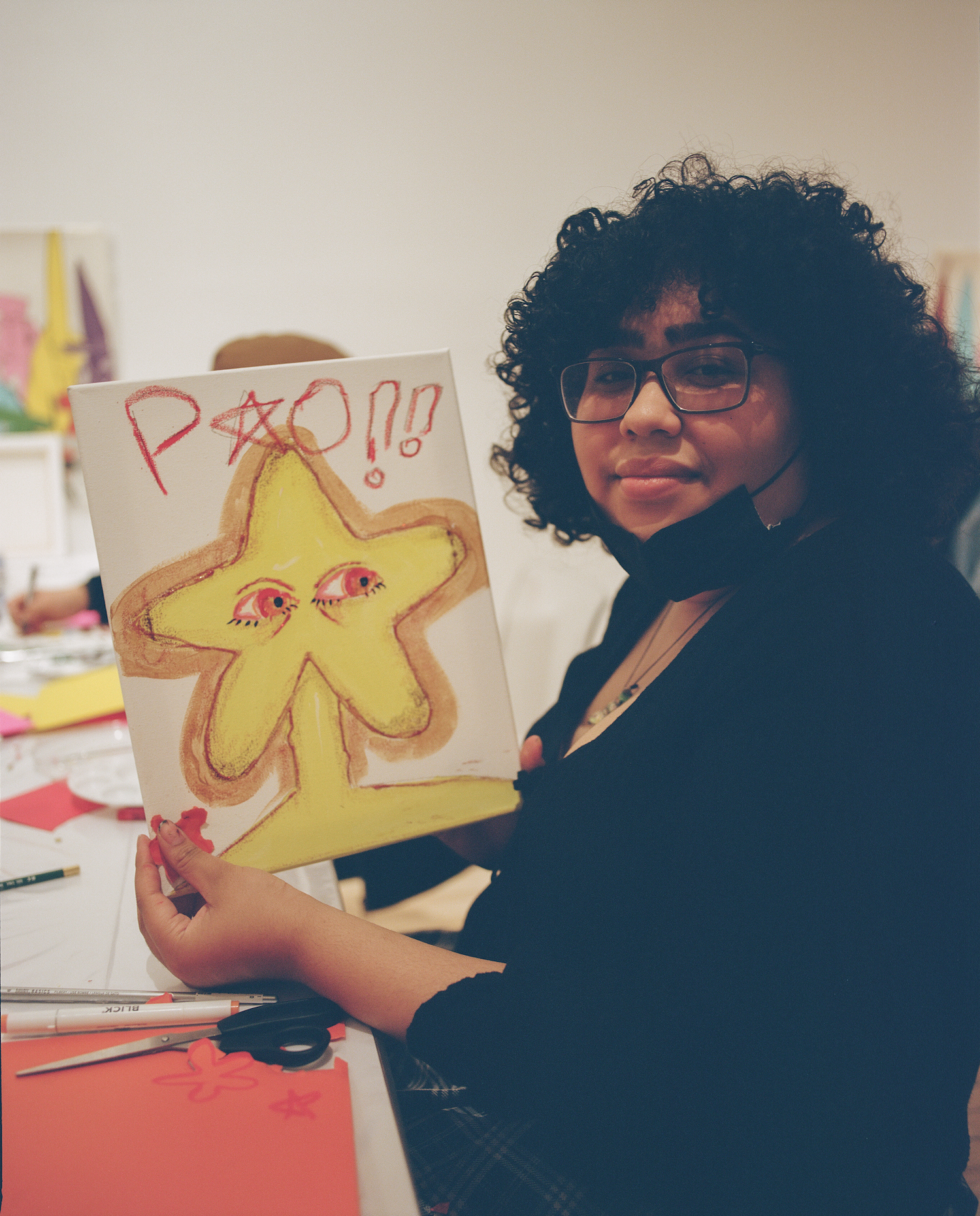 “I like stars,” says a student named Paola, who has been in the Teen Arts program for two years, since she was 14. “I’ve always liked the idea of yellows, and warm colors”, she continues, holding up a small canvas featuring an anthropomorphic yellow star with a long neck and red eyes covered in red glitter, gazing pensively off to the right. “People call me Pao, or Pao-Pao,” she says, explaining the combination of letters and symbols that run across the top of her piece. “Recently, whenever I sign one of my works, I’m finding that I’ll replace my ‘A’ with a star. I like experimenting with my name.”