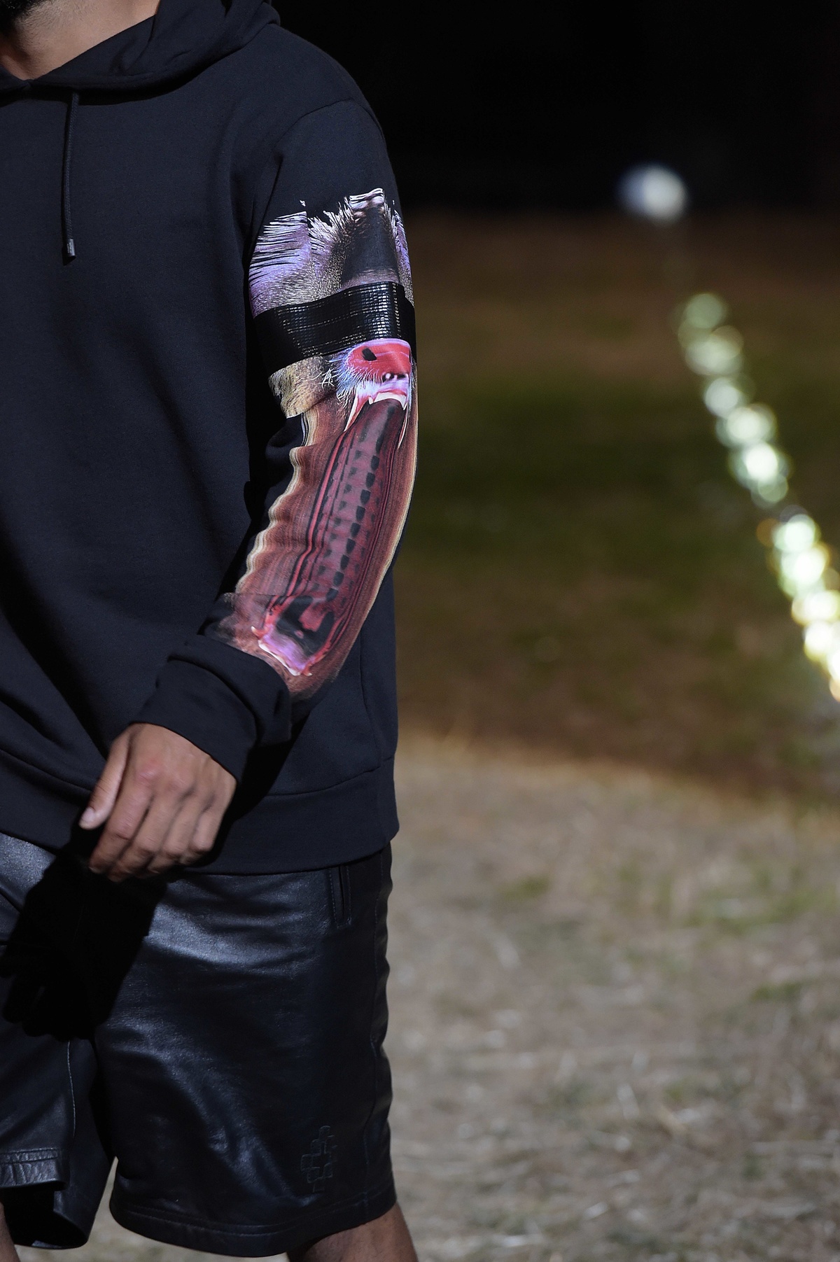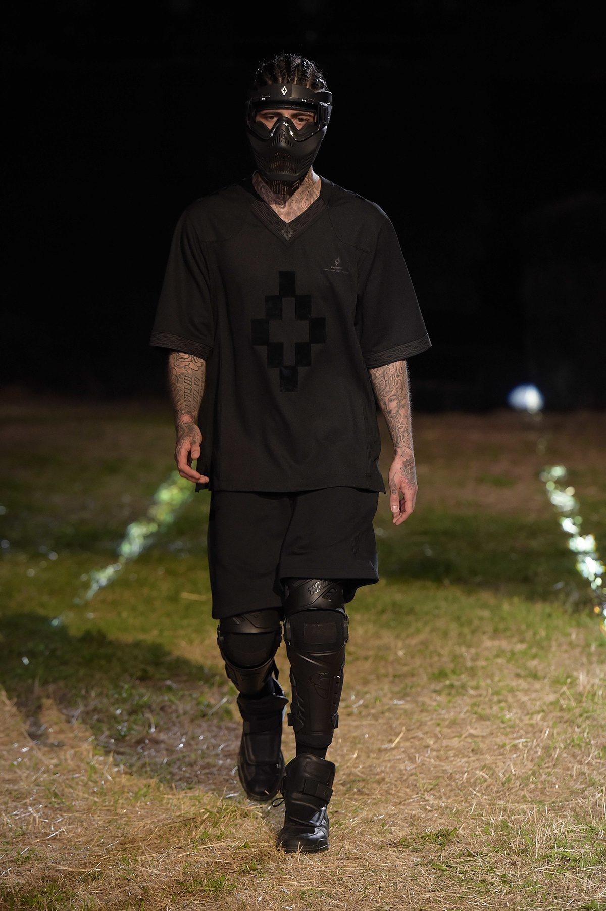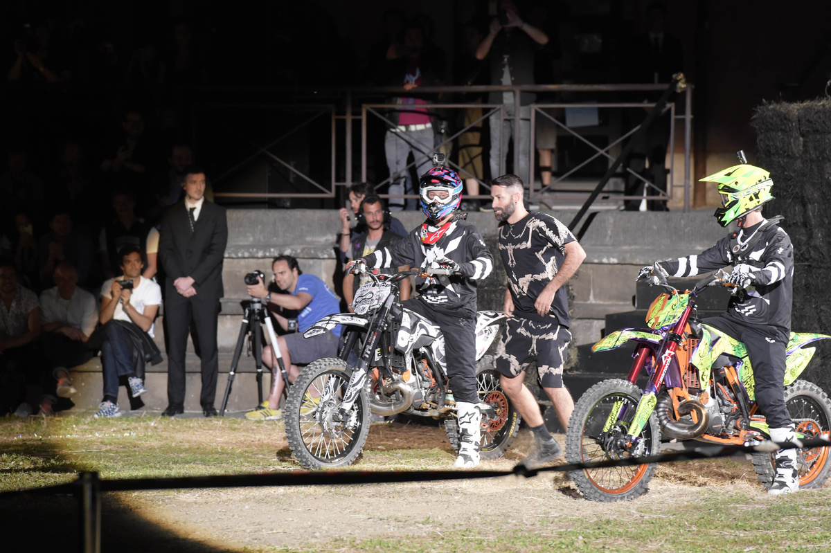 Burlon wasn’t playing around. Inspired by his childhood growing up with a race erector father in Patagonia, the blacked-out 10 PM show kicked off with a series of motocross jumps, guests gasping around the outdoor ring catwalk which had been fitted with a giant ramp. “It feels so sexy. It’s so sexy, right?” Burlon insisted after the show, his signature charm intact. And while there’s no denying the allure of petrol fumes and the sound of wheels accelerating in the dirt, more than sexy the show felt incredibly honest. For a while, Burlon had been hanging out with the Italian motocross champions, who opened his show, and his appreciating for their passion and aesthetic was undeniable.