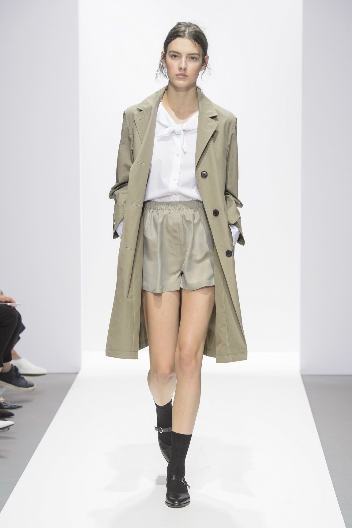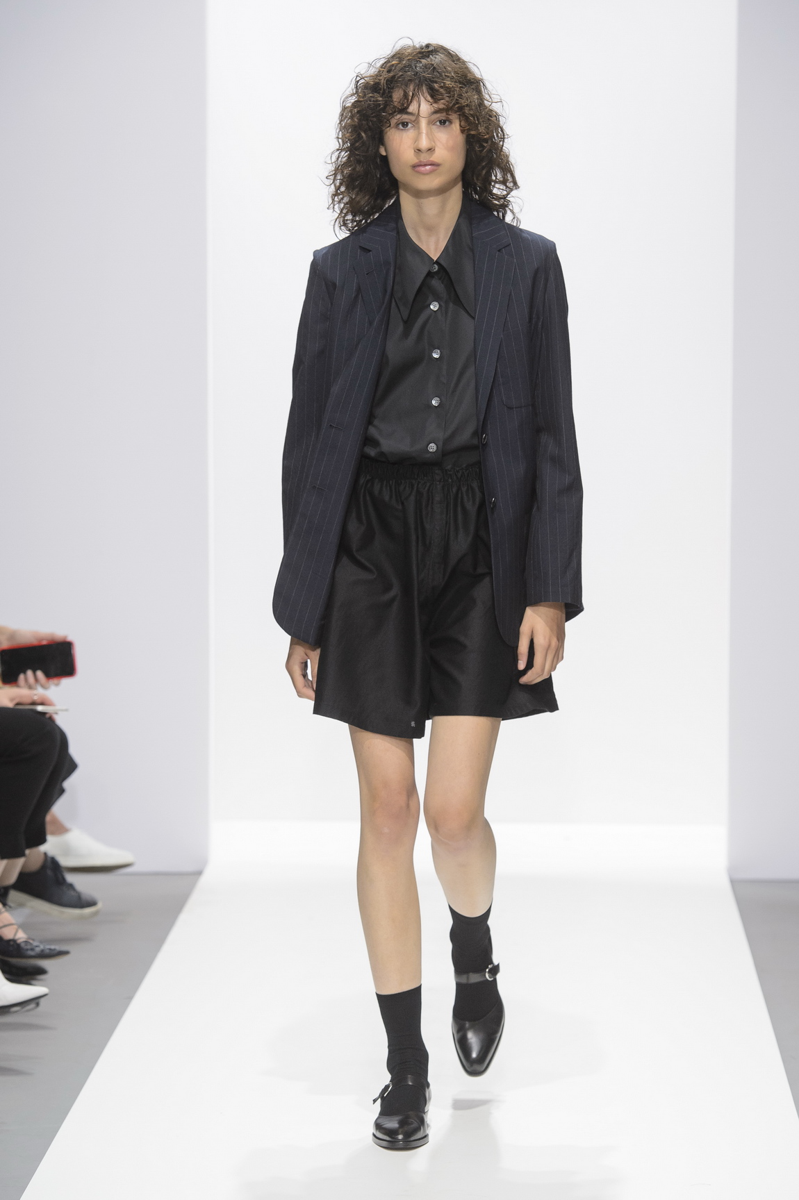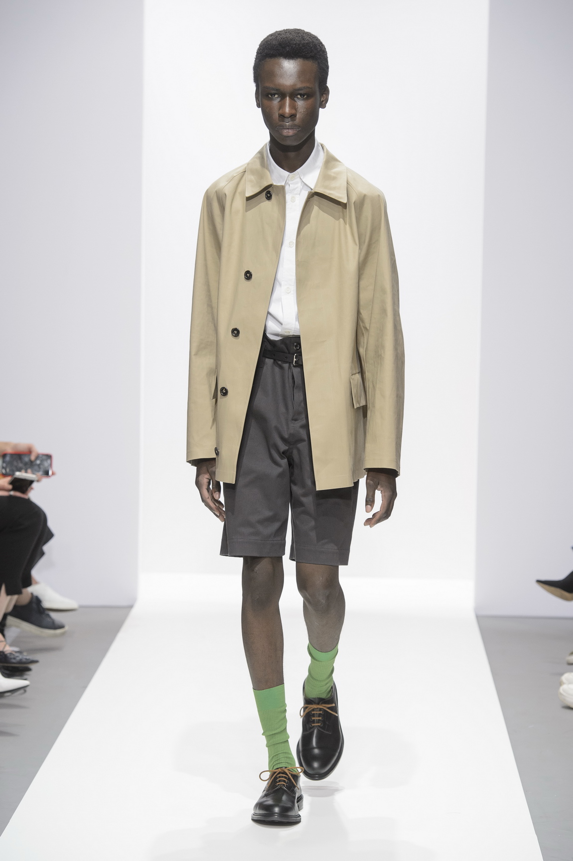 So comprehensively, in her 40-plus year career in the industry, has she built her world and defined her aesthetic, that it feels harder and harder to find new superlatives to extol her eminently wearable pieces with. She is incredibly good at the things she is incredibly good at (and why try and be anything else) so she makes a beautiful white shirt (and we should let a beautiful white shirt be just a beautiful white shirt) the opening look here, presented with a slightly oversized collar, that made you simply think, well, I would like to own one. She’s got the cosy perfect proportions of trousers down, baggy shorts stop just at the right spot on the knee, a flash of colour in jade green socks or neckerchiefs.