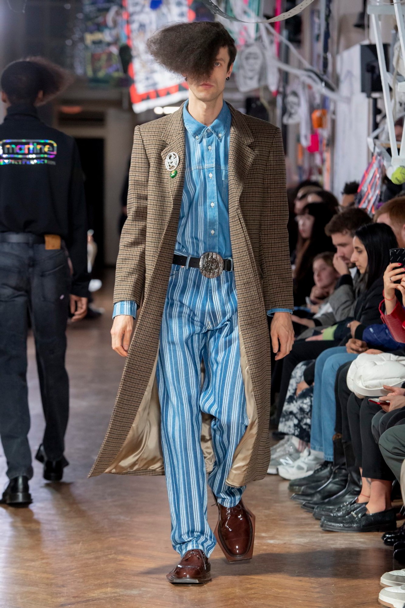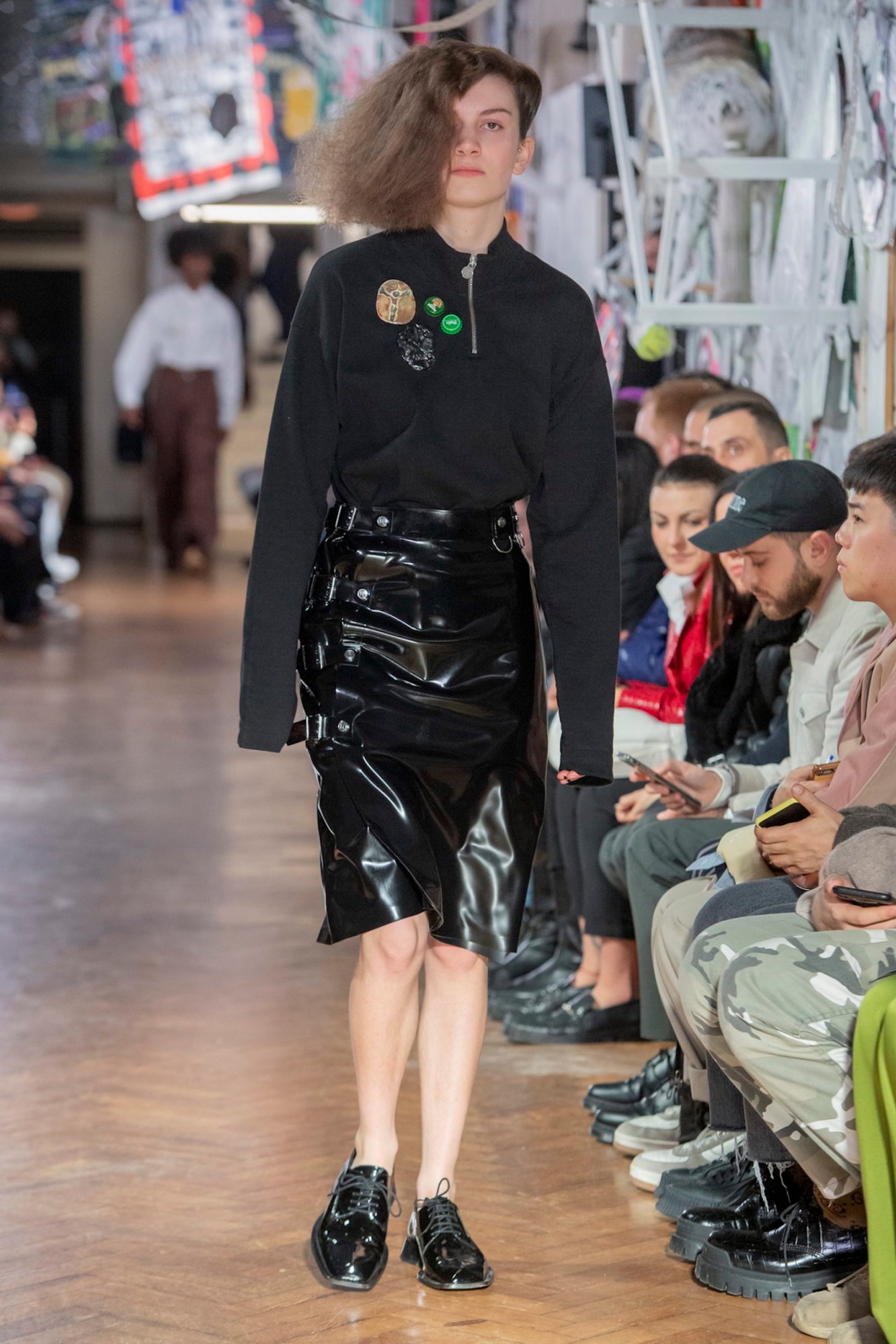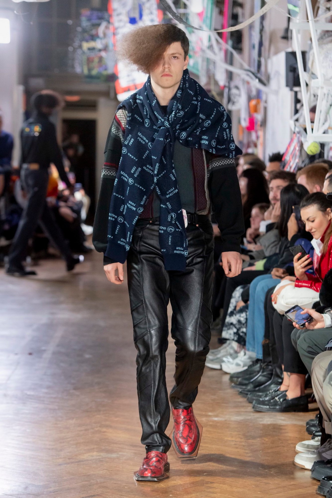 The walls of the school hall were still adorned with the artwork and projects of the children at Torriano Primary School, providing an incredibly surreal backdrop to the parade of looks; iconography from Martine’s past resurfaced but was constantly remixed into new silhouettes. There was plenty of latex, thigh-high cowboy boots, duster coats, jackets and knitwear morphed into scarves, tailoring printed with London place names Martine has a connection to — Clapham, Tottenham, Croydon, Tooting.