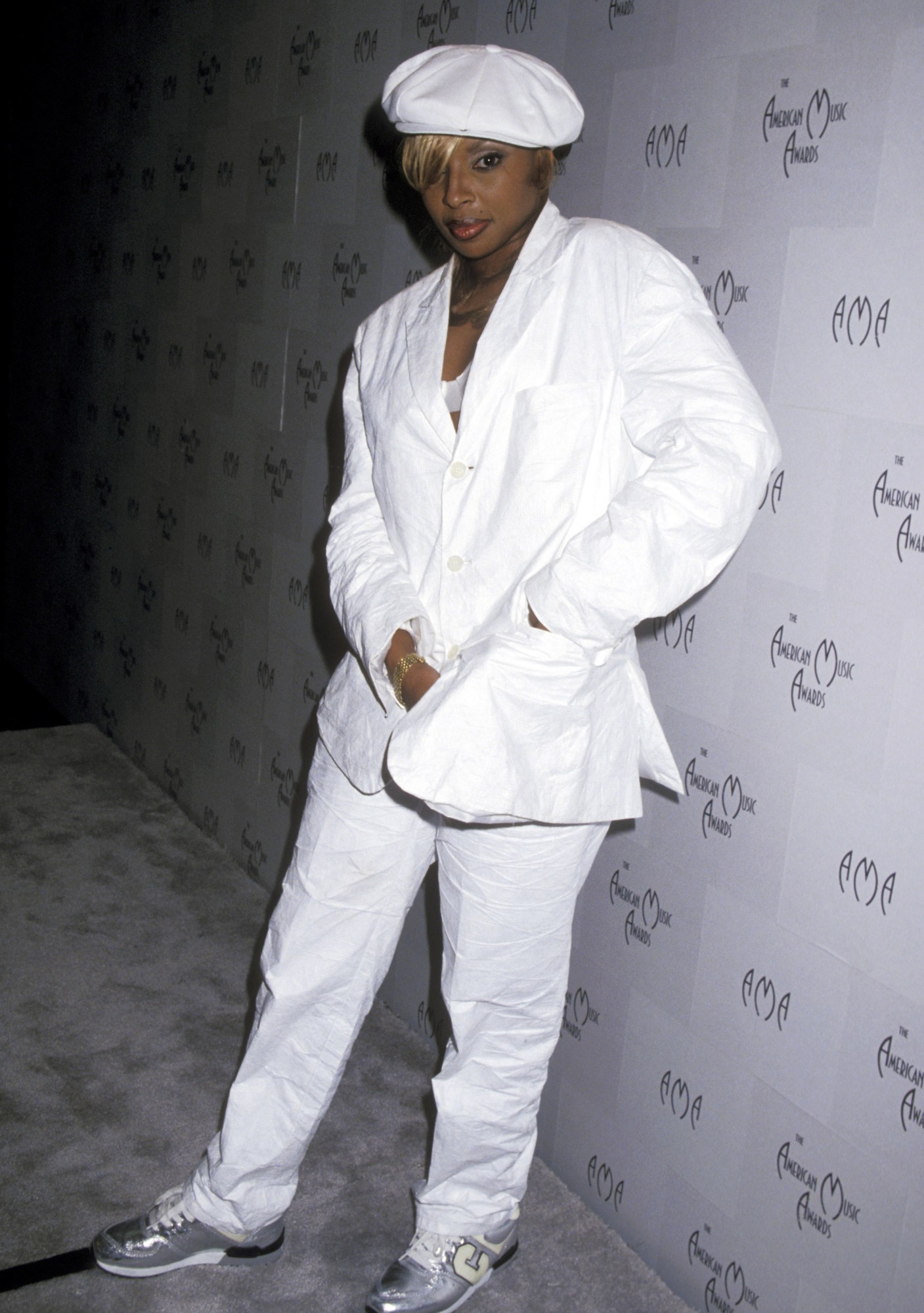 Born in the Bronx and raised between Savannah and Yonkers, Mary got her first record deal as a backing vocalist at age 18. Three years into her contract, in 1992, she began work on her debut solo album with producer Sean Combs (aka Puff Daddy). What’s the 411? — the album in question — went on to sell triple-platinum and poised Mary — both critically and commercially — as the 90s’ breakthrough R&B artist. Off the massive success of her debut, the singer released her now-iconic sophomore record My Life in 1994. Unanimously regarded as Mary’s masterwork — the album is listed on both Rolling Stones’ and Times’ “Greatest Albums of All Time” lists — My Life cemented Mary’s unique take on the R&B, one that infused the genre with a hip-hop edge and the singer’s unique narrative lyricism. Here, a few months after its release, Mary attends The American Music Awards in an all-white get-up: oversized cotton suit, newsboy cap and silver sneaks.