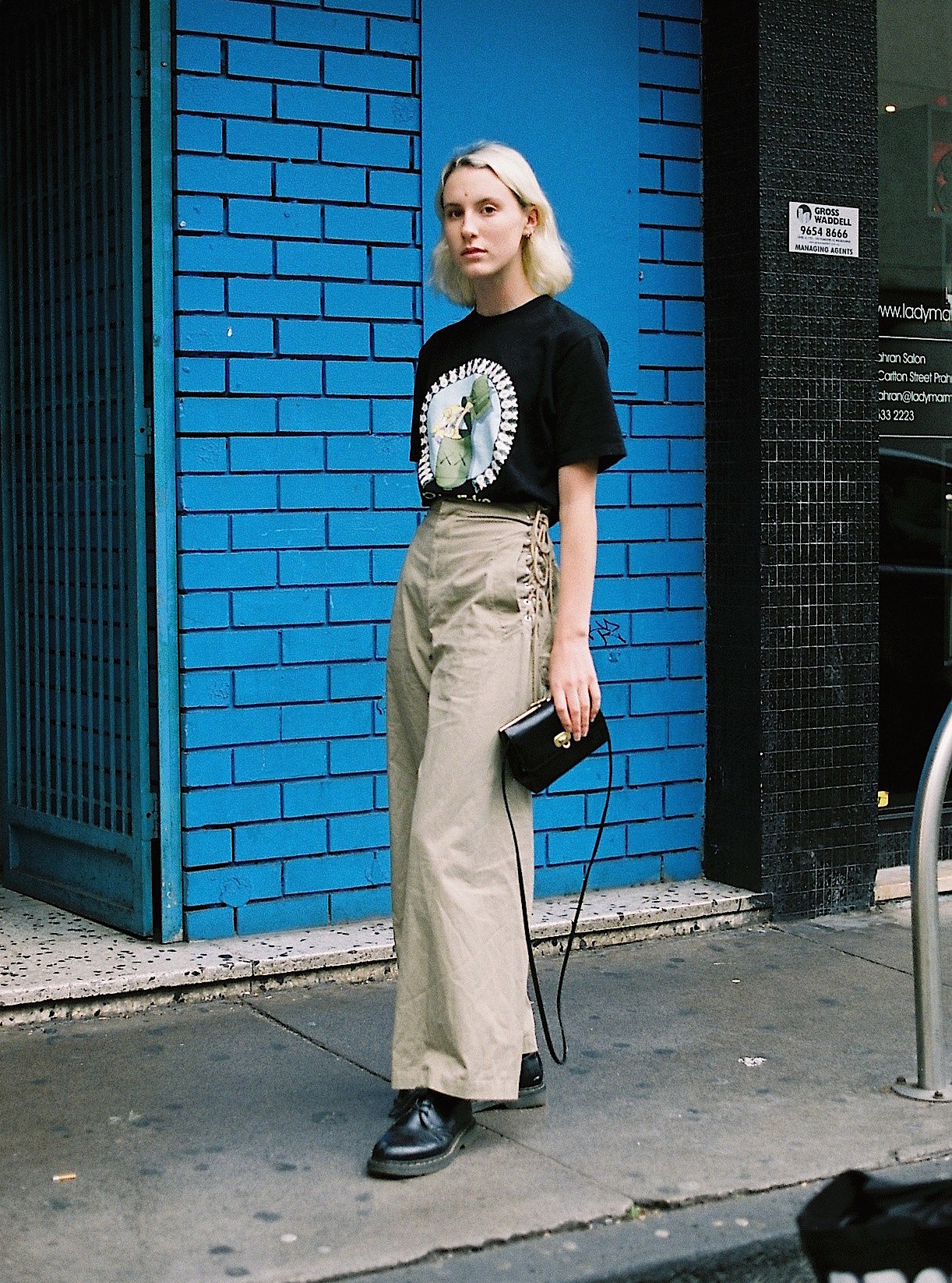 Original Fake tee, second hand pants, Doc Martens and my Grandma’s bag.