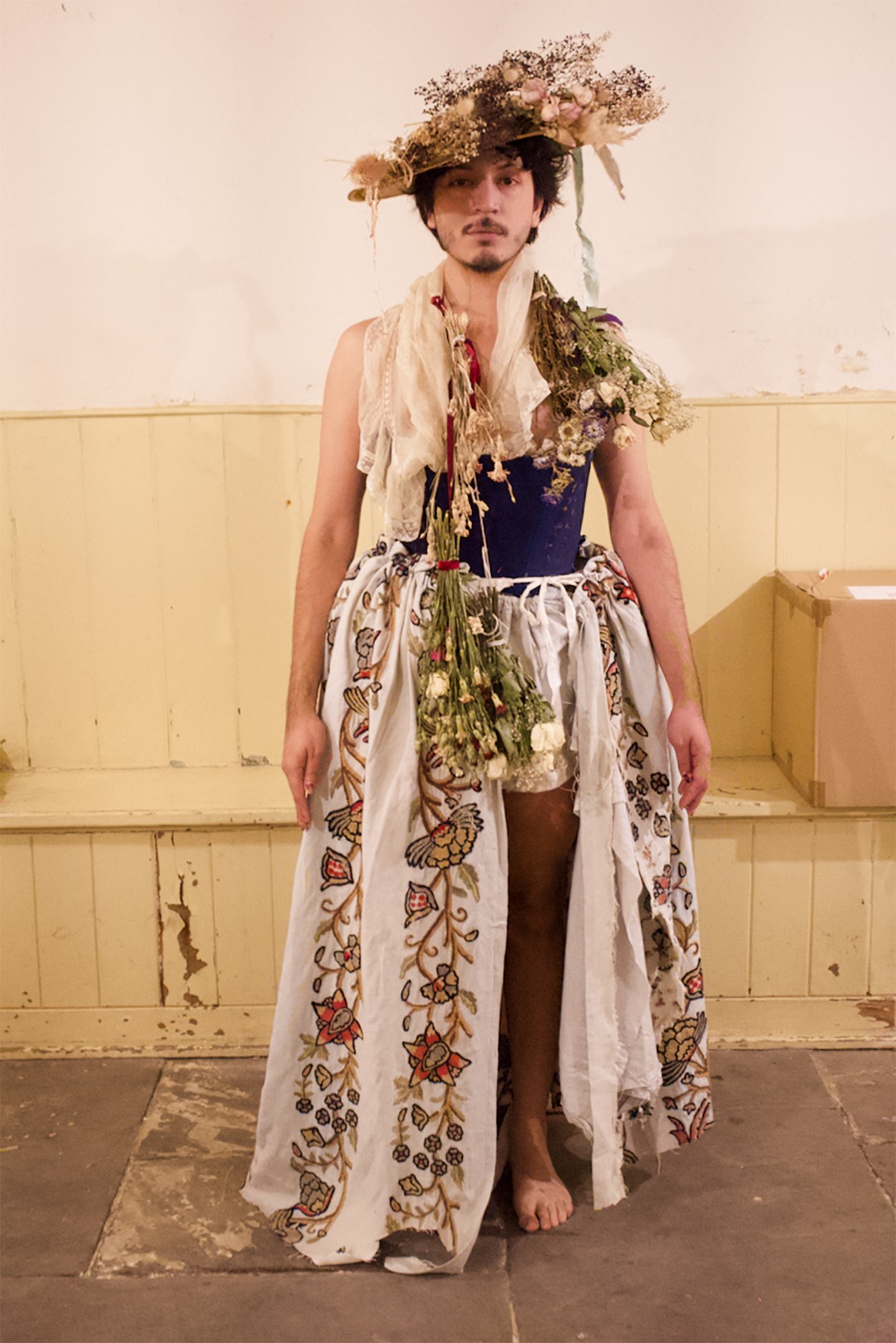 One character is a sheep-herder, complete with real fleece, still pungent with lanolin. “It stank,” Allen laughed. “But it was right: Historically accurate and totally queer.” Others include a flower vendor, a print seller, a basket weaver. “It wasn’t drag as we think of it now,” Adcock said. “It was surrealism through poverty.”