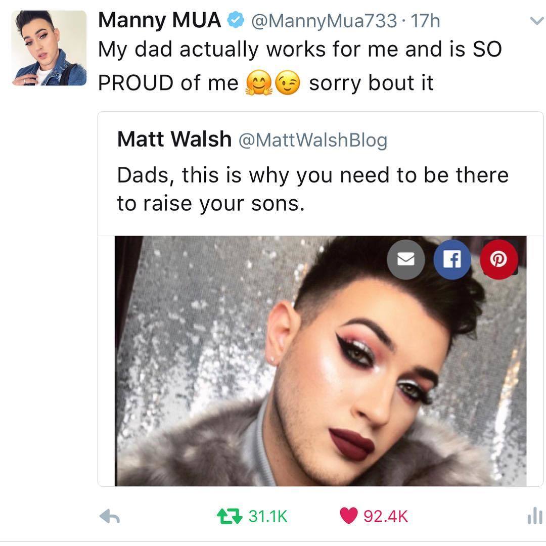 American Christian conservative blogger and very mean person Matt Walsh (his latest article misgenders Chelsea Manning and brands her a traitor) tweeted a picture showing Manny perfectly made-up in matt claret lips, with silver, pink and black cat eyes, along with the spectacularly unpleasant and bigoted caption, “Dads, this is why you need to be there to raise your sons.”