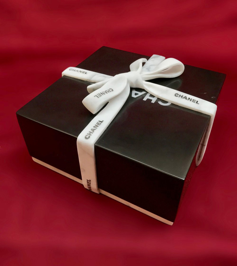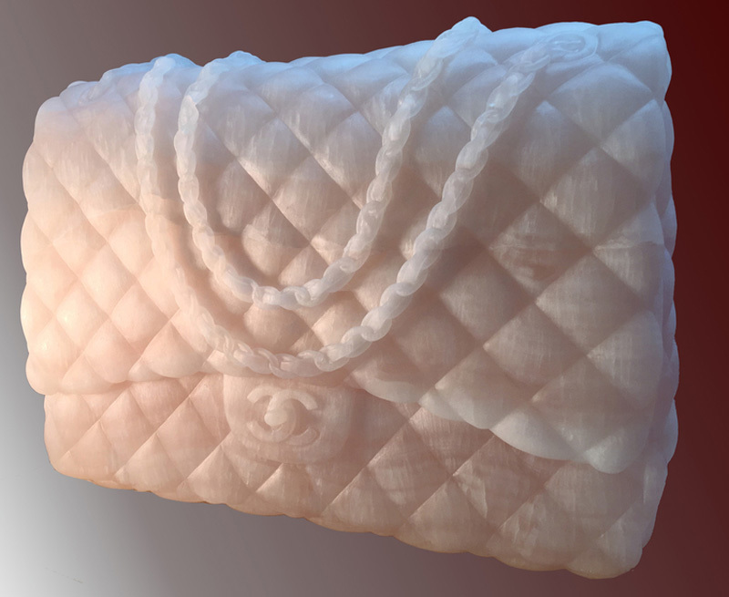 The work was one of many from the American stone carver. Other offerings include Chanel pieces, Hermes boxes, “leather” jackets, lingerie and children’s dresses — all formed from marble, onyx, smeraldo, sodalite and other beautiful minerals. We called her up to talk about why fashion is worth its weight in marble.