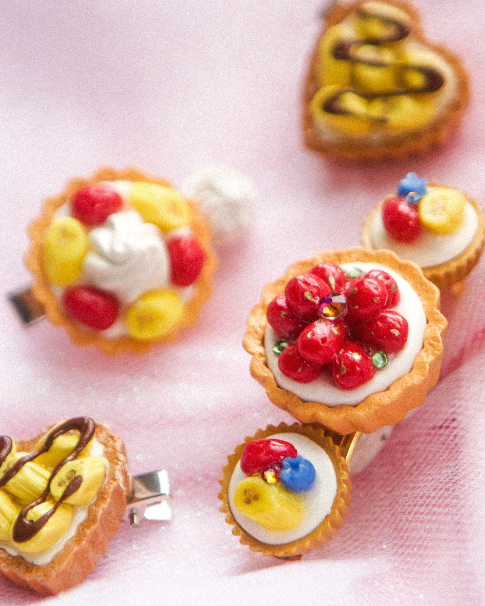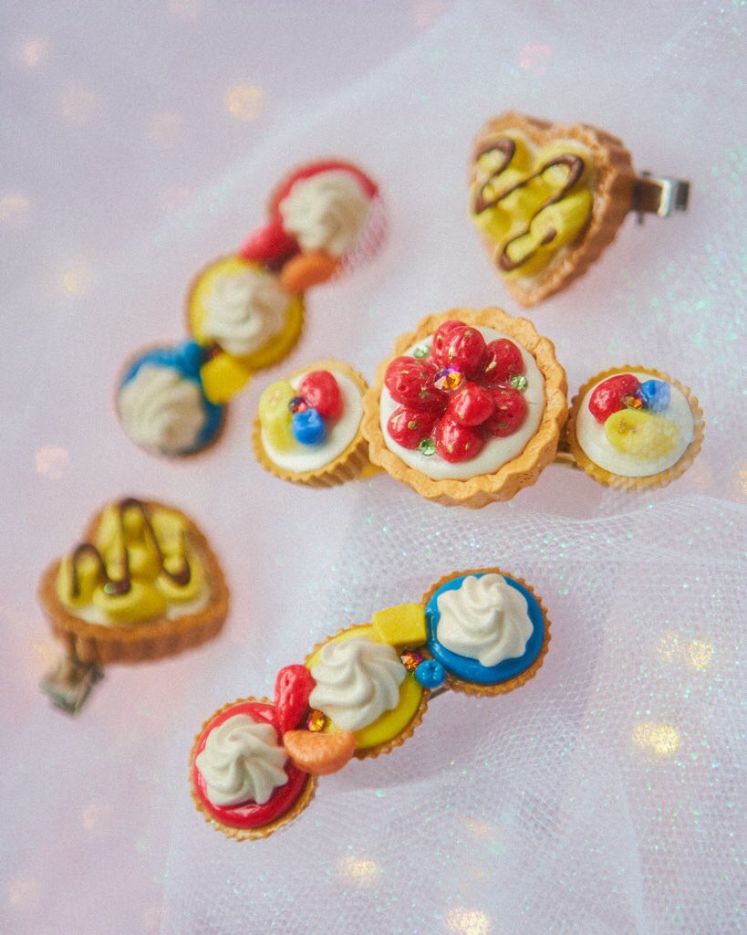 Sometimes I would see these objects and it would remind me of a time I yearned for, like unity and family and a time when I felt super safe, but then I would look at the same things but see them in a negative way and think, I don’t have any of that anymore. So I thought, how do I honor what used to make me so happy and what I hold so dear to my heart? I decided to combine that with my daytime job as a professional baker (I went to pastry school) and make wearable accessories that resemble toys and pastries. I’m also inspired by Japanese fake food art.