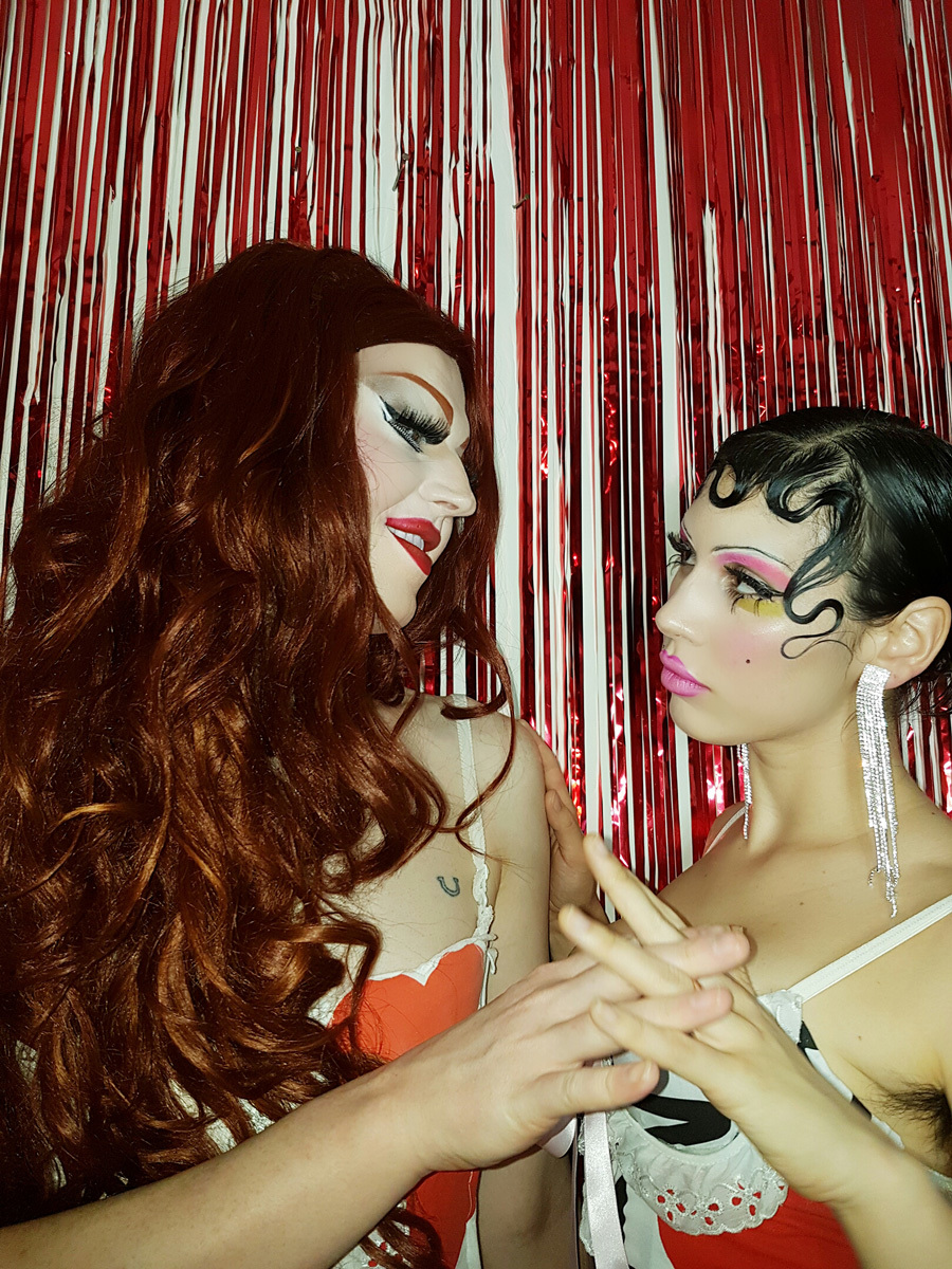 Queen Sateen and Exquisite first met on OKCupid, while Sateen was looking for a musical collaborator, but it didn’t take long until their romance blossomed. Then after hibernating one winter, a few years ago, and watching every John Waters movie and Nelson Sullivan video, reading every book ever written by RuPaul, and listening to nothing but The B-52s, they became obsessed and possessed by the notion of drag, so they decided to give it a try.