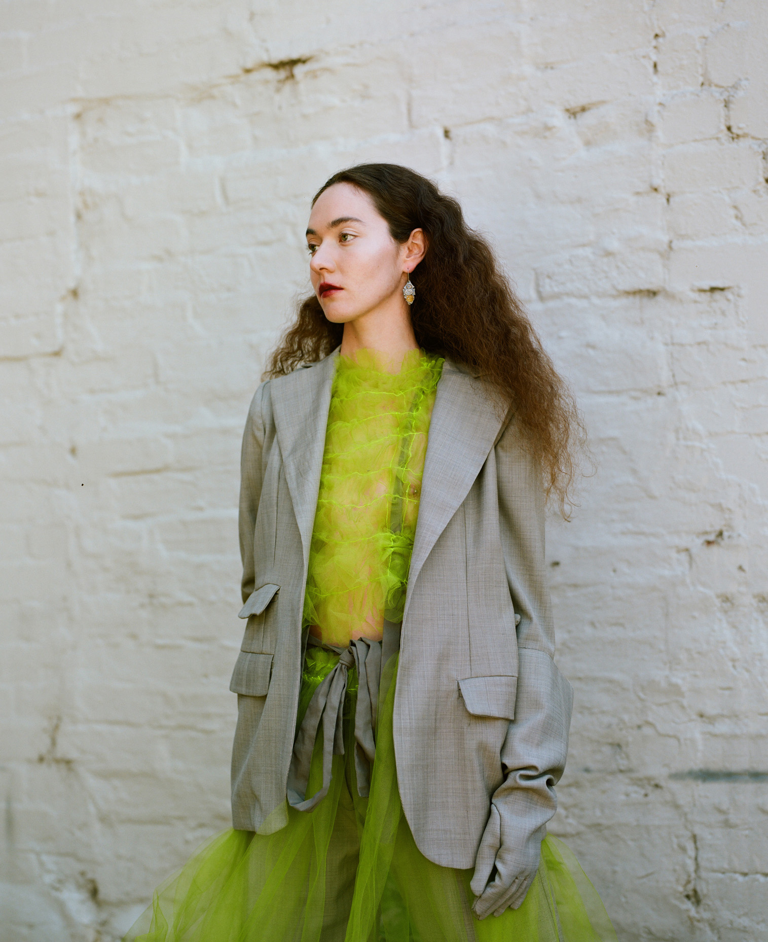 Mia Schaumann’s graduate collection is a satisfying medley of textures and shapes; fluorescent tulle and muted puffer jackets meeting oversized suiting and pleated dresses worn over sheer tops. Floral prints add a soft contrast to the range, tied together by the plethora of straps that reoccur through the collection — a motif that adds a sense of coherence and Her Own-ness to the garments. Mia’s most interested in creating clothes which evoke emotion, and which the wearer can interpret in their own way. We sat down with the promising maker to find out more about her ideas and what she plans to do next.