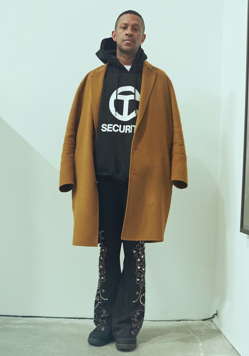 Acne coat, Telfar sweatshirt, bedazzled bell bottoms from Patricia Field, Nike’s
