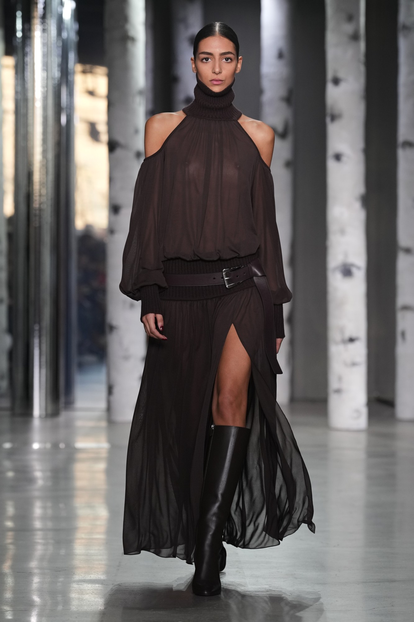 The collection presented yesterday, in a mirrored hall close to the Hudson, iterated the foundational values on which his mighty empire is built. Opening with a suite of elegant, long-lined herringbone coats and slinky jersey dresses; a-line capes and louche suiting that pooled in taupes, creams and soft greys; the subdued refinement that has always defined the brand was adamant from the start. Far from fusty or conservative, though, it felt eminently contemporary. Those jersey dresses, for example, were slashed up to the thigh, with panels flickering about the models as they walked, and styled with wide belts with glinting buckles. And the seams of the sleeves of crisp blazers were opened, allowing for a look that struck a clever compromise between the insouciance of a jacket slouched over the shoulders and the exacting fit of a well-tailored garment.
