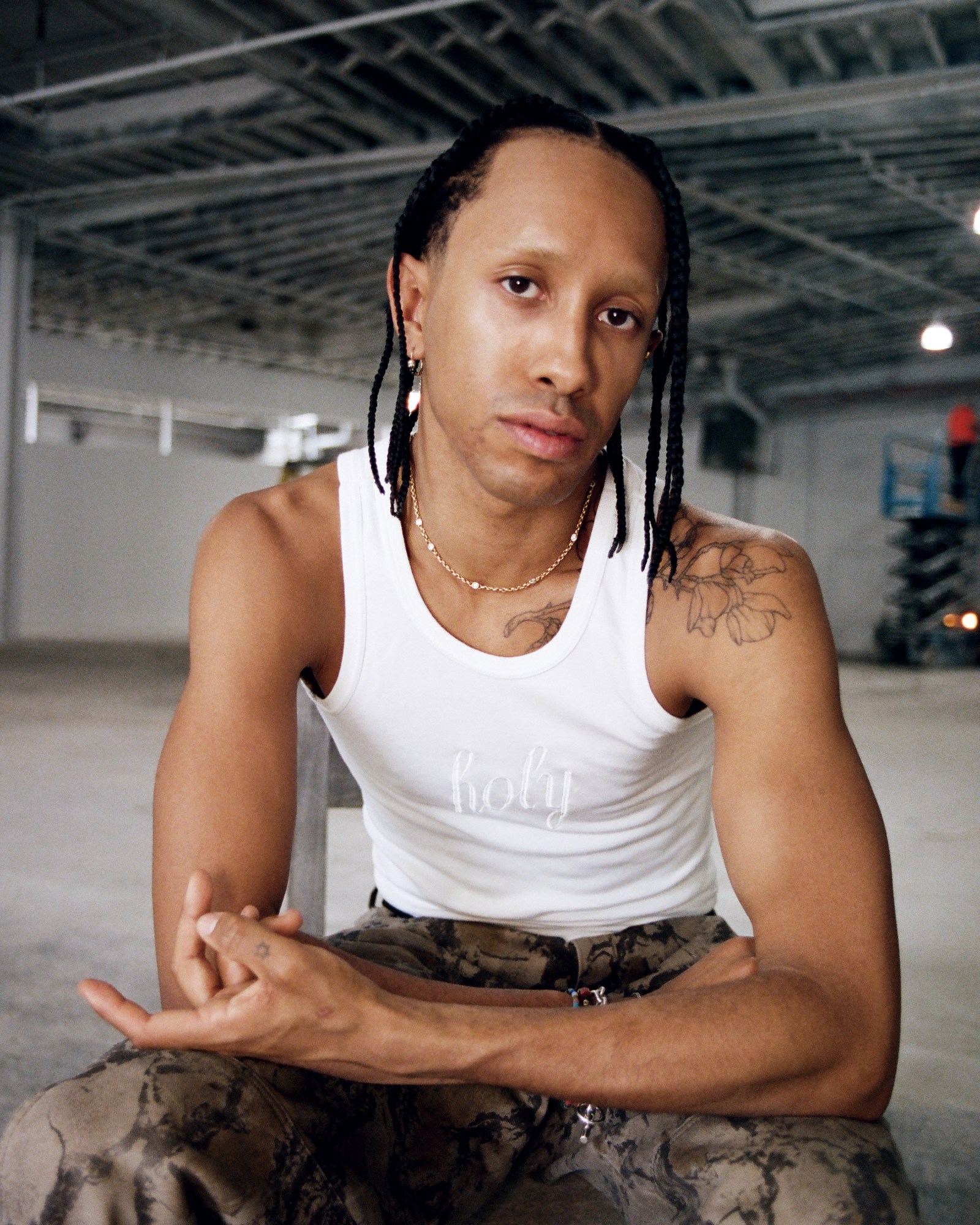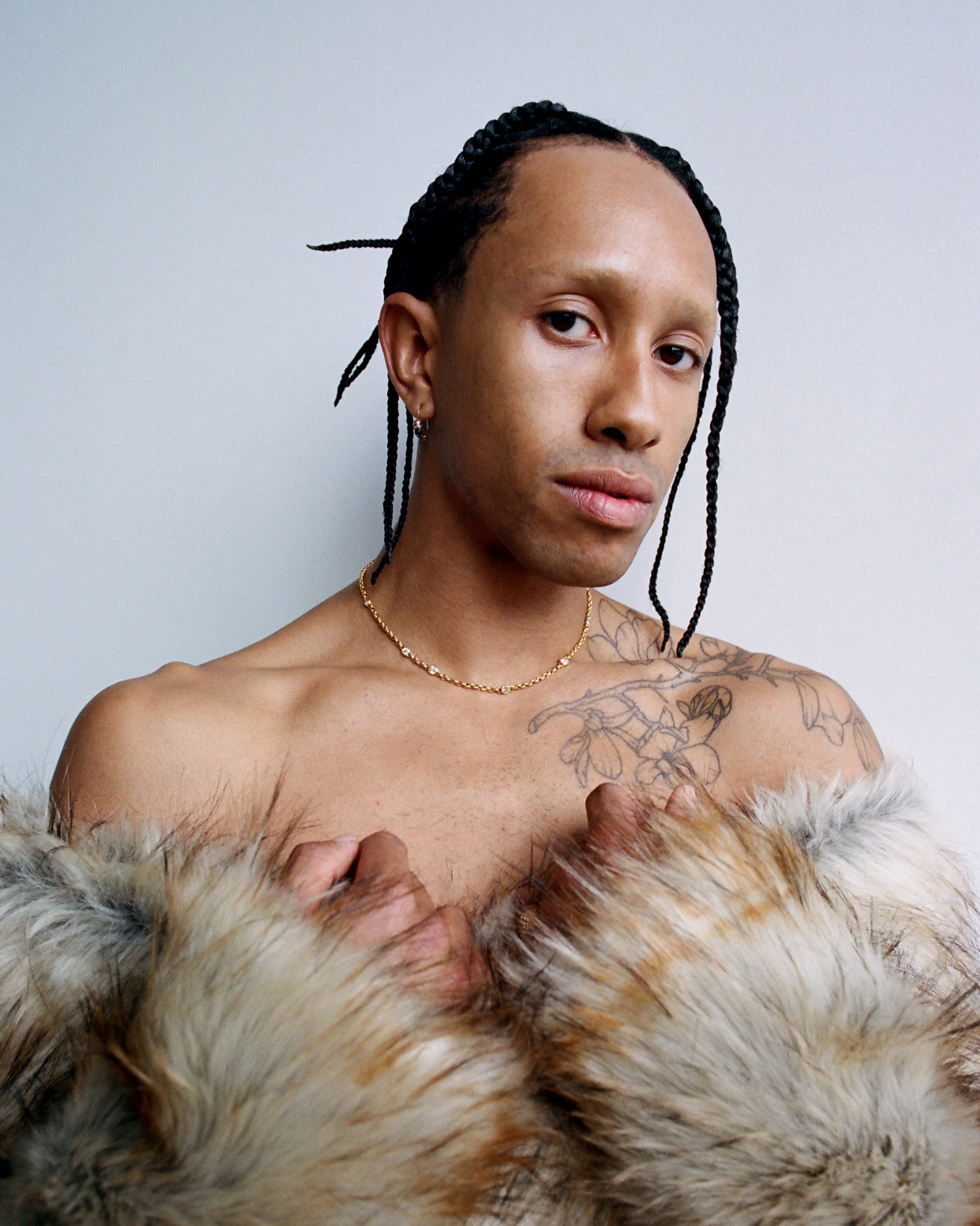 Inspired by performance artists like David Hammons and Senga Nengudi, he’s interested in inverting whiteness and heteronormativity as cultural defaults. “I’ve spent my entire life looking at white bodies and making a translation to my own in order to understand narratives and conversations around, heartbreak, around ecstasy, around joy, around love and queerness.”