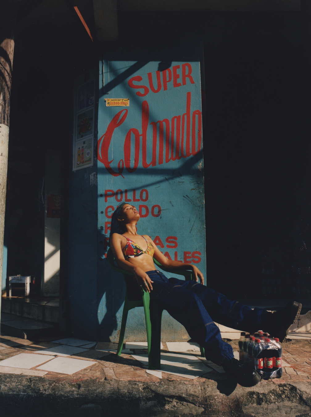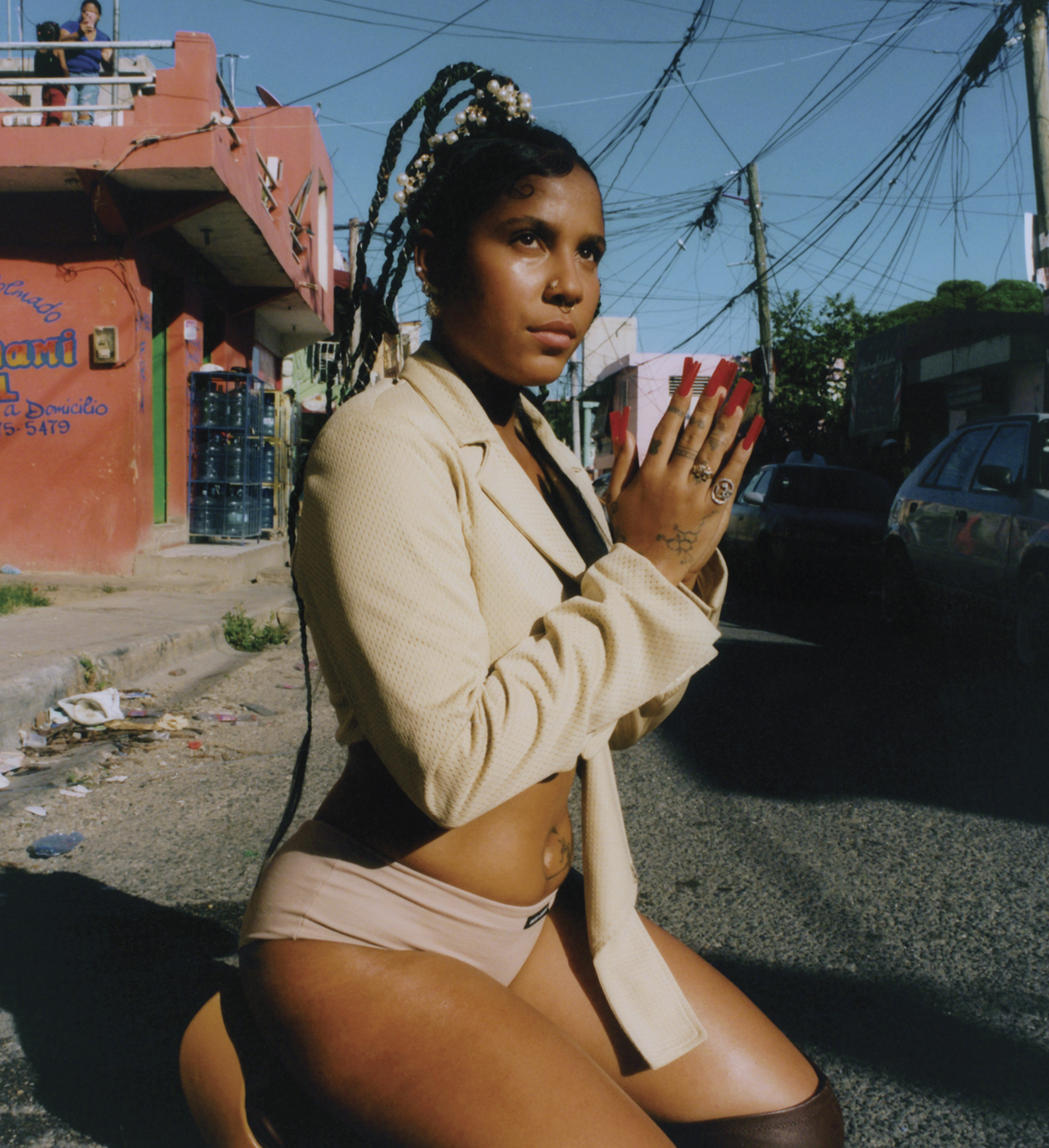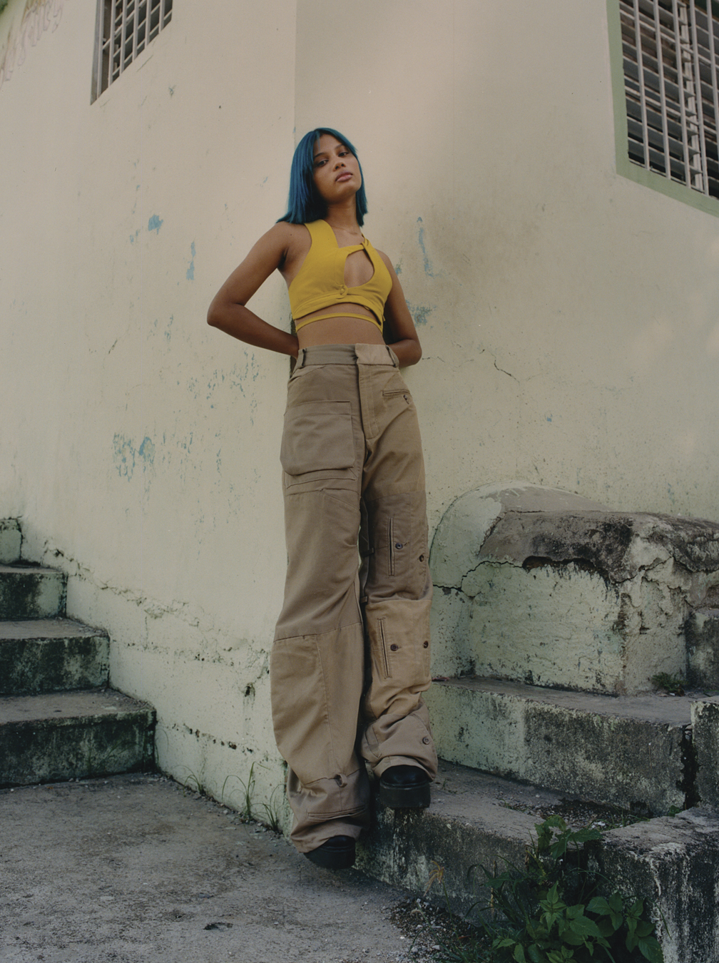 I started researching the barrios I used to visit as a kid and learned about teteos – clandestine street parties that began after the pandemic. We discovered Tokischa and her music, and I was instantly drawn to her. In many ways we share the same scars, and it’s healing for me to see her shine despite her lived experiences. I feel pride when I see her challenging everything that is expected from a Dominican woman. Tokischa introduced us to a design collective named Tiempo de Zafra, founded by a couple who returned to the Dominican Republic after growing up in the US. Their studio was teeming with artisans of all trades making one-of-a-kind sustainable garments by upcycling second-hand pieces. Several pieces we shot were made by them, and it was there we also met Railin, who ended up doing everyone’s hair for the shoot.
