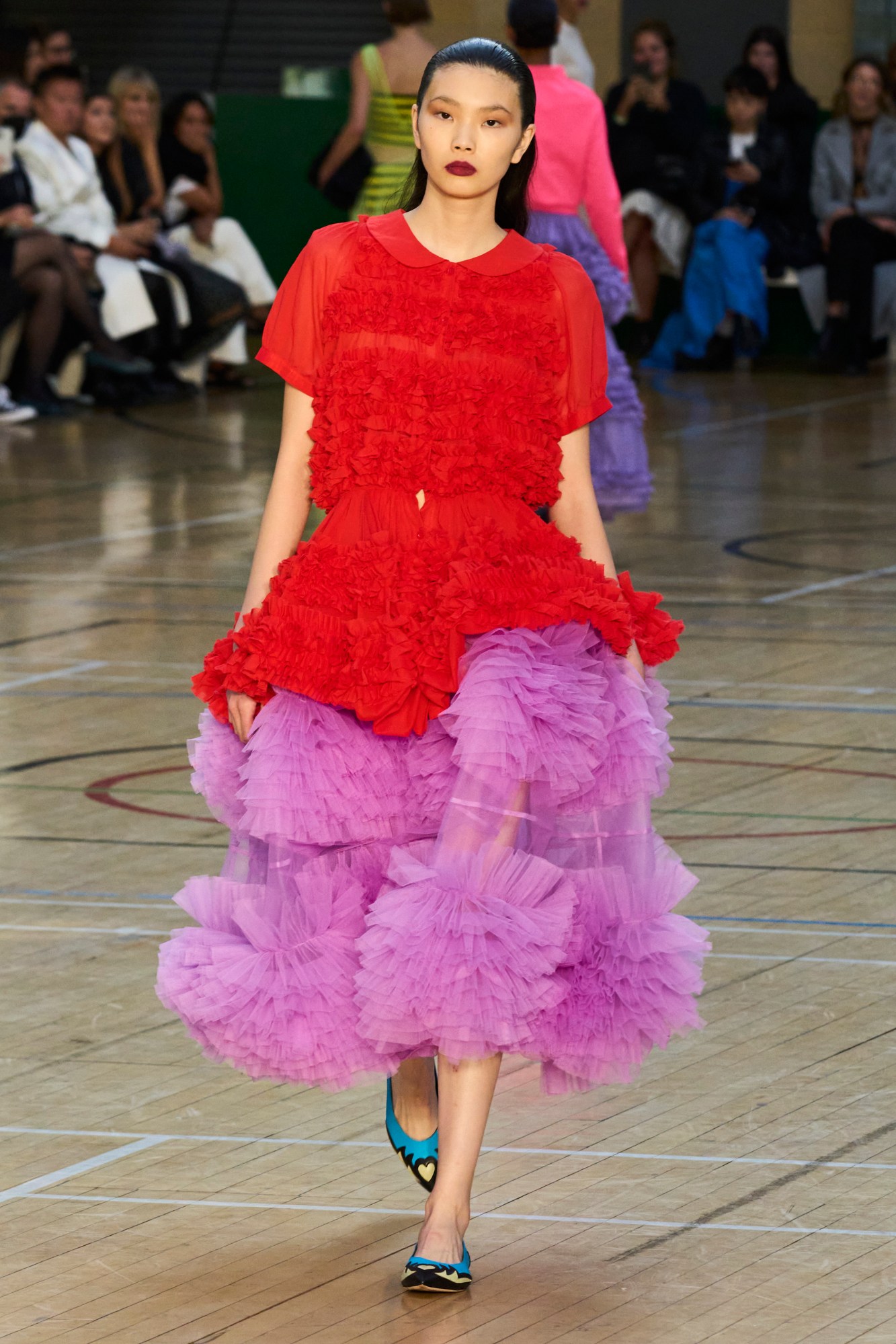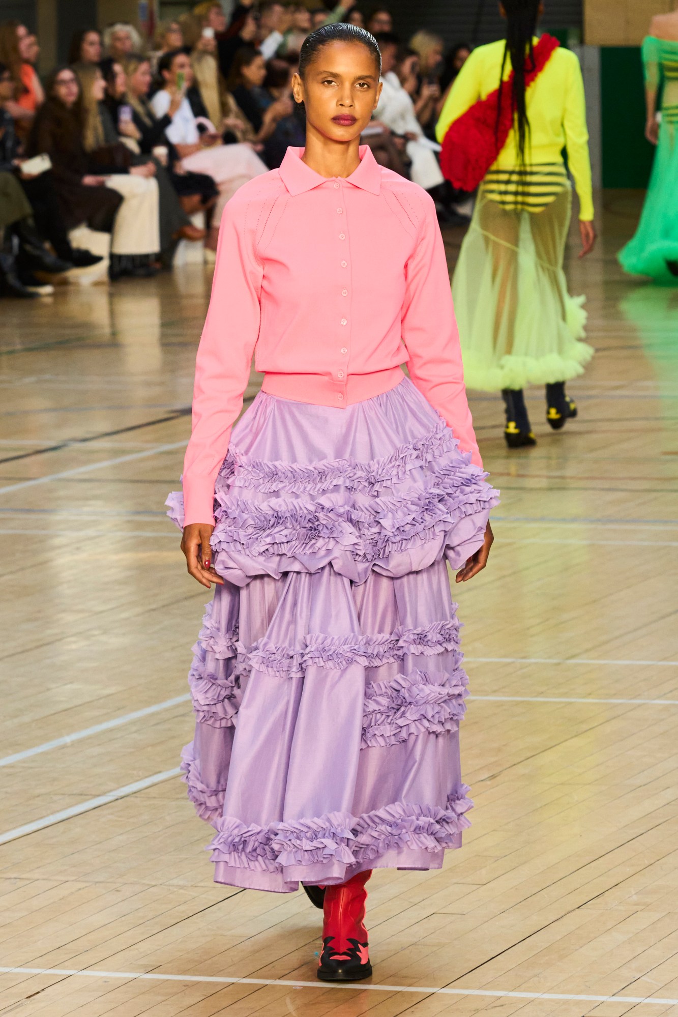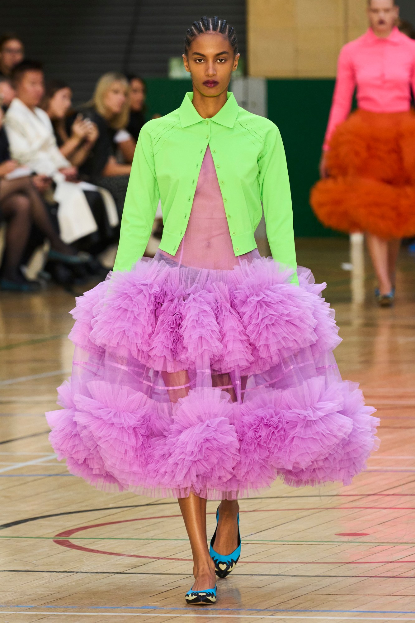 But really the standout was the colours, and the construction of the garments in service to them. “Colours are not kind of something that comes later. It’s very much at the beginning of the design process,” Molly said. A series of sheer neon slips were one highlight, a layered luscious red tulle top over a soft lavender tulle skirt another, the silhouette had an echo in another look, this time paired with a bright neon green cardigan.