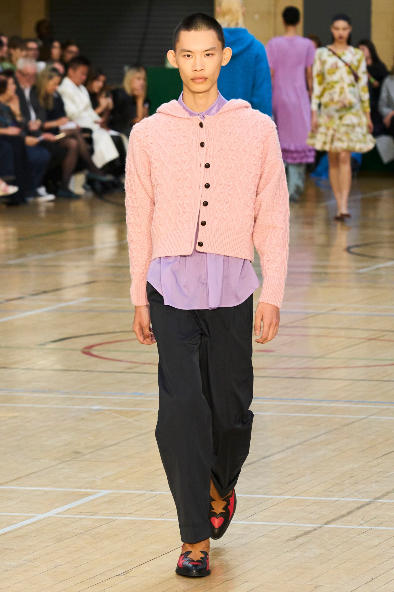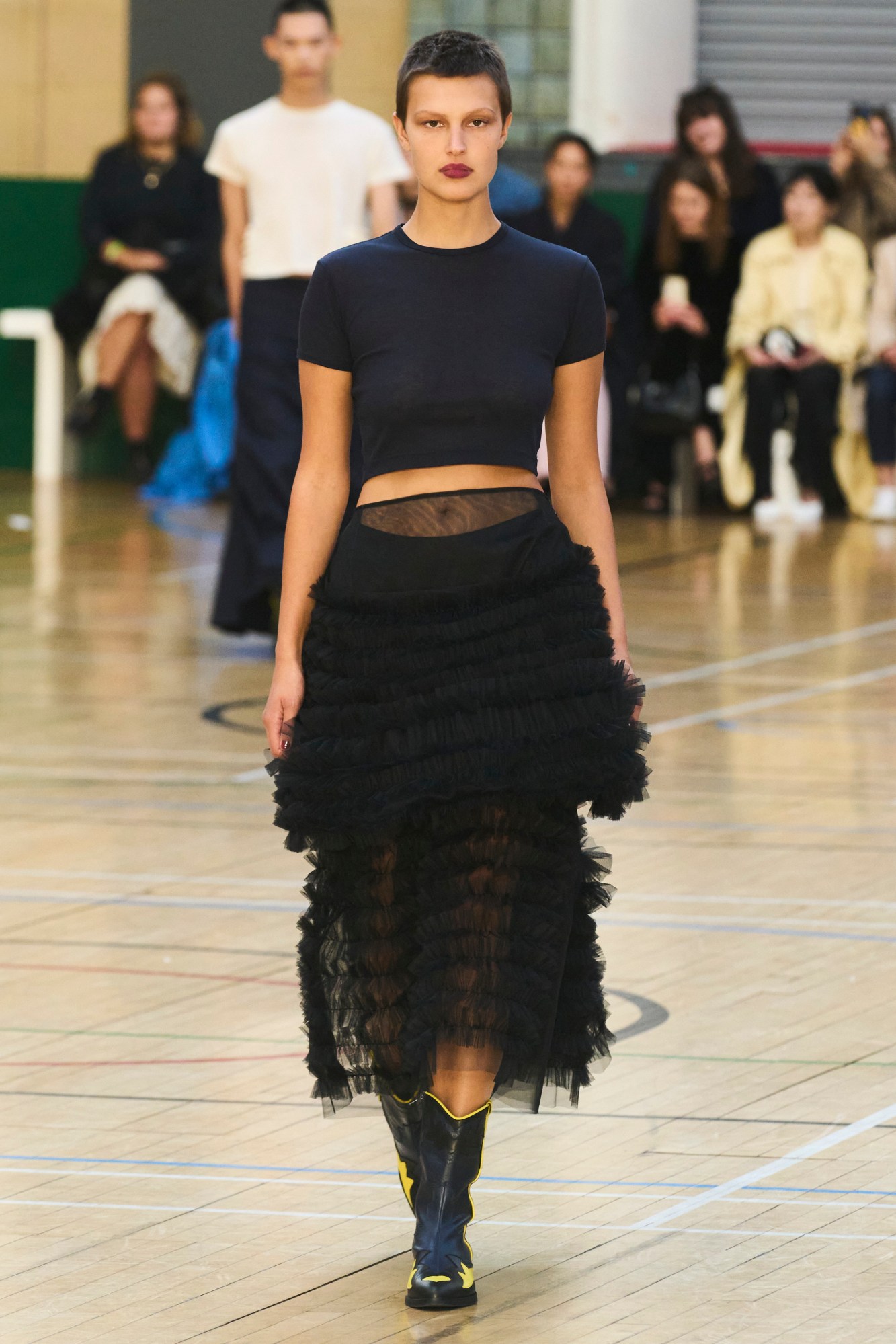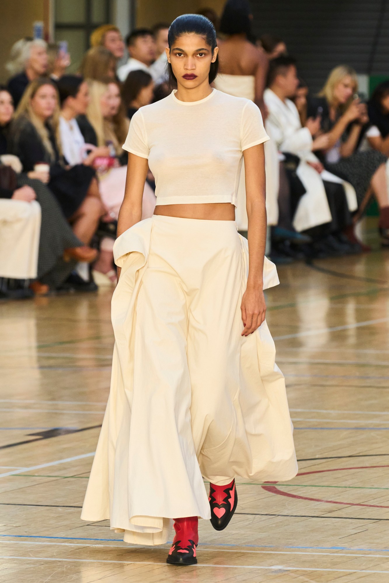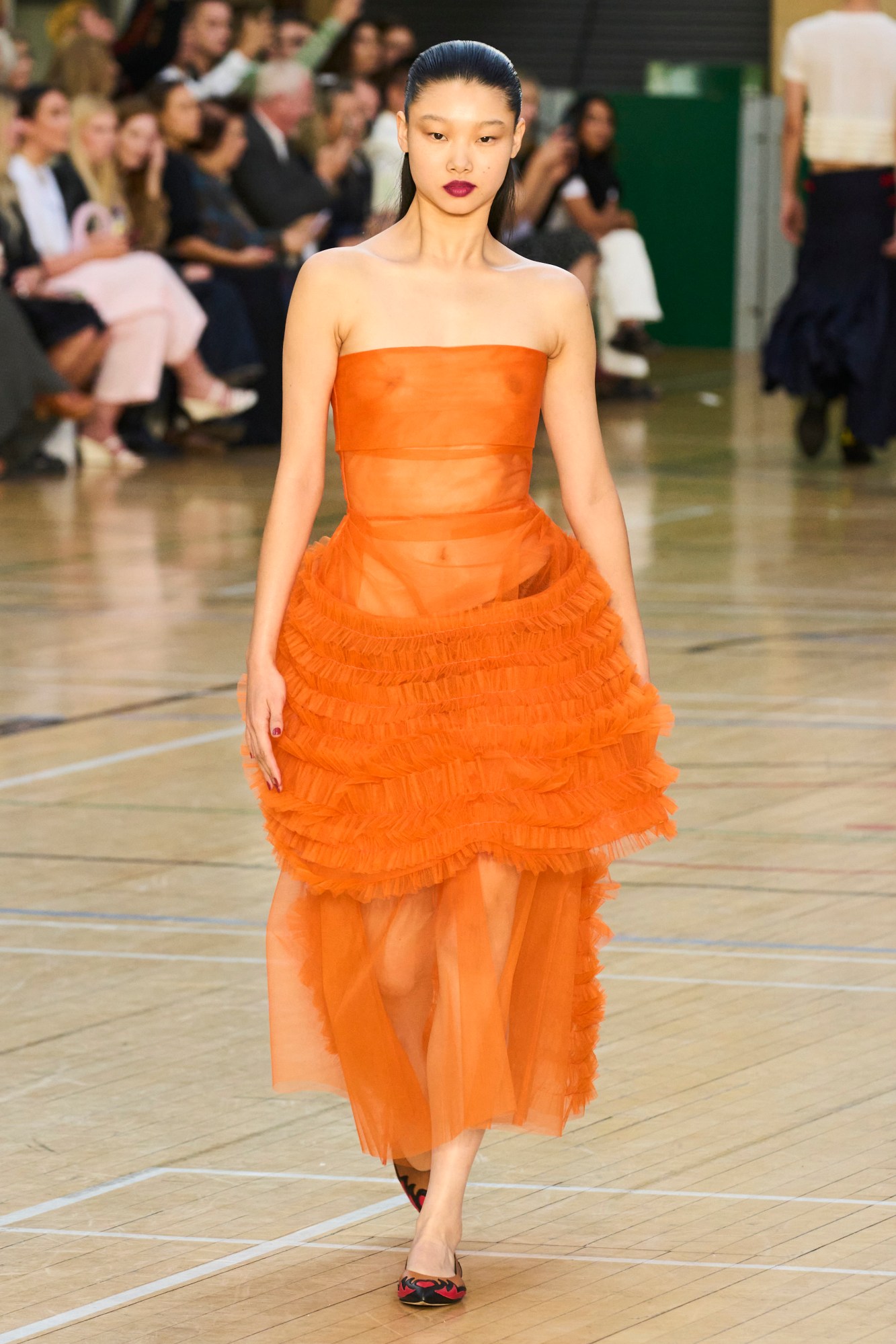 But really the standout was the colours, and the construction of the garments in service to them. “Colours are not kind of something that comes later. It’s very much at the beginning of the design process,” Molly said. A series of sheer neon slips were one highlight, a layered luscious red tulle top over a soft lavender tulle skirt another, the silhouette had an echo in another look, this time paired with a bright neon green cardigan.