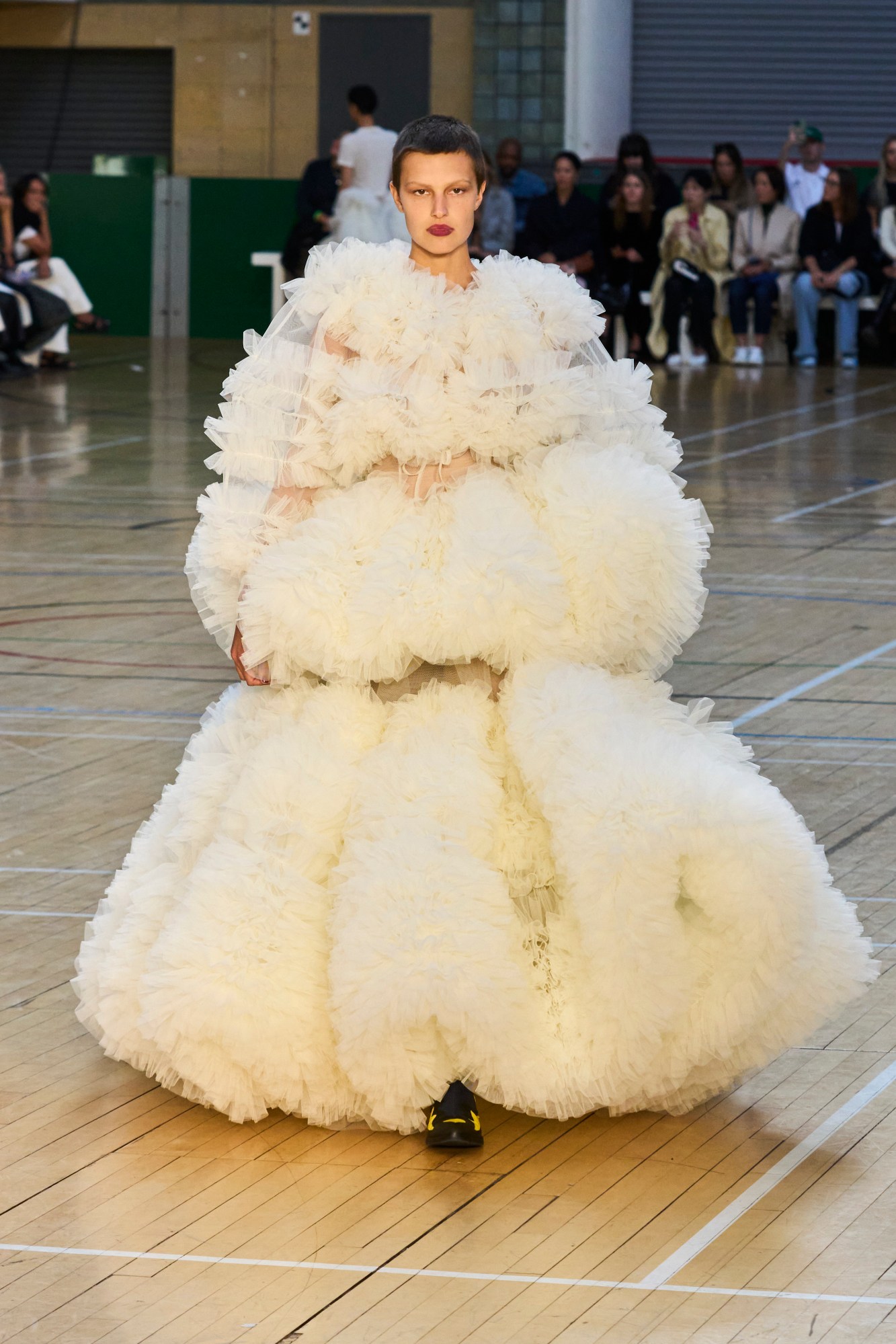 The show was roughly split into four sections, demarcated by changes in music and subtle shifts in the silhouettes and colour, with each section the dresses getting bigger and brighter, culminating with a huge, white dress, so voluminous it was almost spherical.