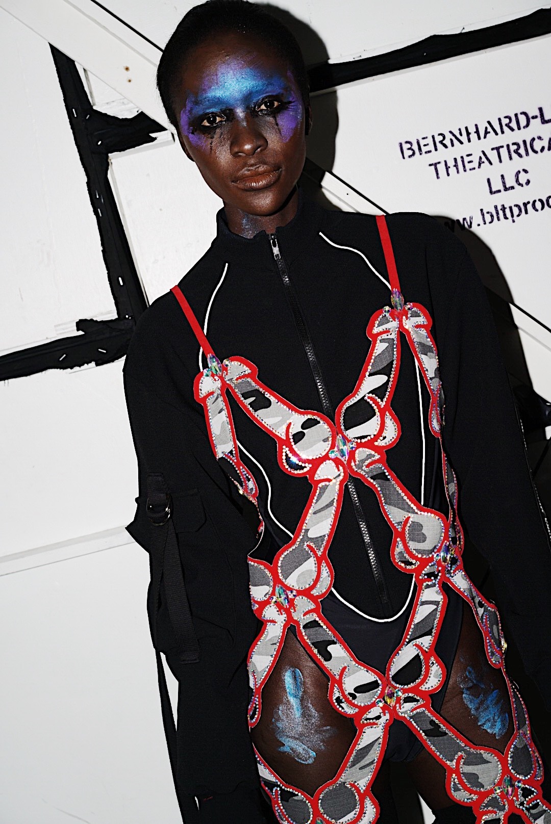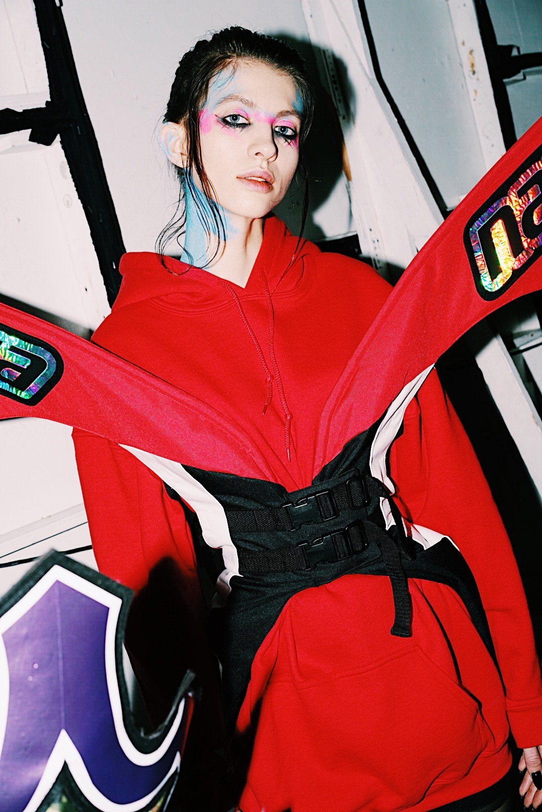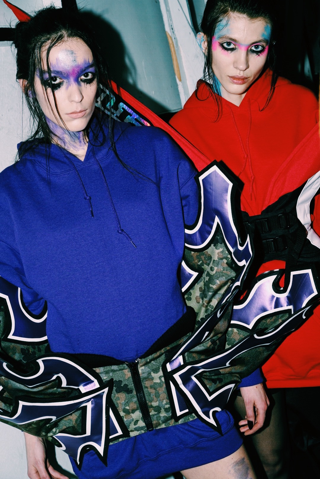 Berlin brand Namilia has been outspoken about reclaiming female sexuality ever since its 2015 inception (and its spring/summer 16 VFILES Runway debut). But with the label’s fourth collection, that message rang out loud and clearer than ever. The printed “Runway Manifesto“distributed to attendees spoke of “Warrior Queens” in military garb and trompe l’oeil wings of fire, and of “Post-Apocalyptic Rave” culture — said apocalypse being of the Trumpian variety. There was an emphasis on “power-dressing,” and mermaids mixed with motocross, in a collection that felt larger than life, like an action movie à la Mad Max.