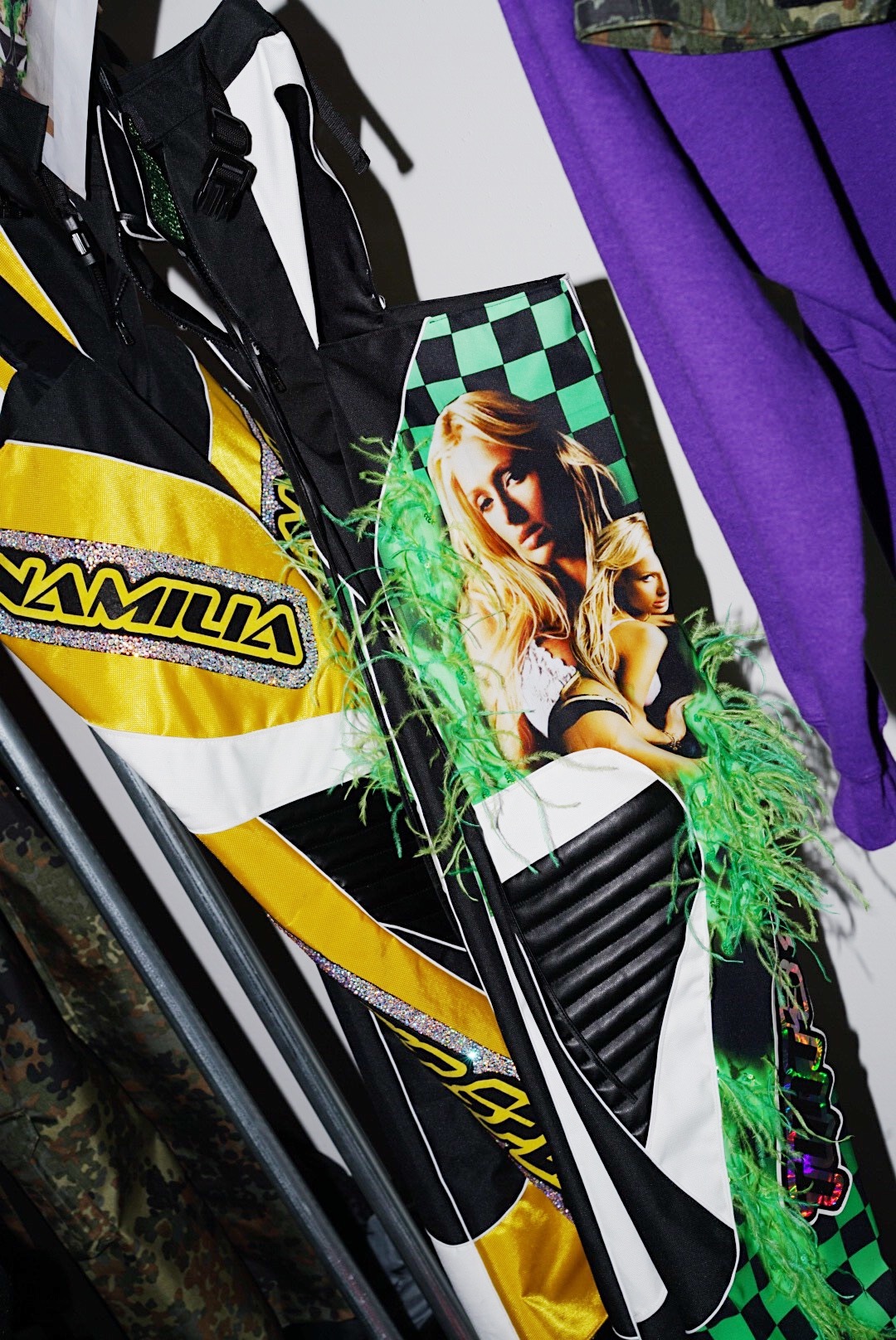 One kelly green Barbie-esque motocross-inspired dress was so majestic it proved too difficult for even a reigning goddess to walk in, forcing a model to desert the runway, kicking up feathers and tulle as she went. Easier to maneuver were similar feather-riddled pant-tails that began at the biker kneepad and trailed behind for feet. Camouflage tool belts and seatbelts that clipped around the waist held in place butterfly wings and flames. Elsewhere, that flame motif — scraped straight off a Harley-Davidson sticker — protruded from the sleeves of hoodies and igloo-esque puffer jackets.