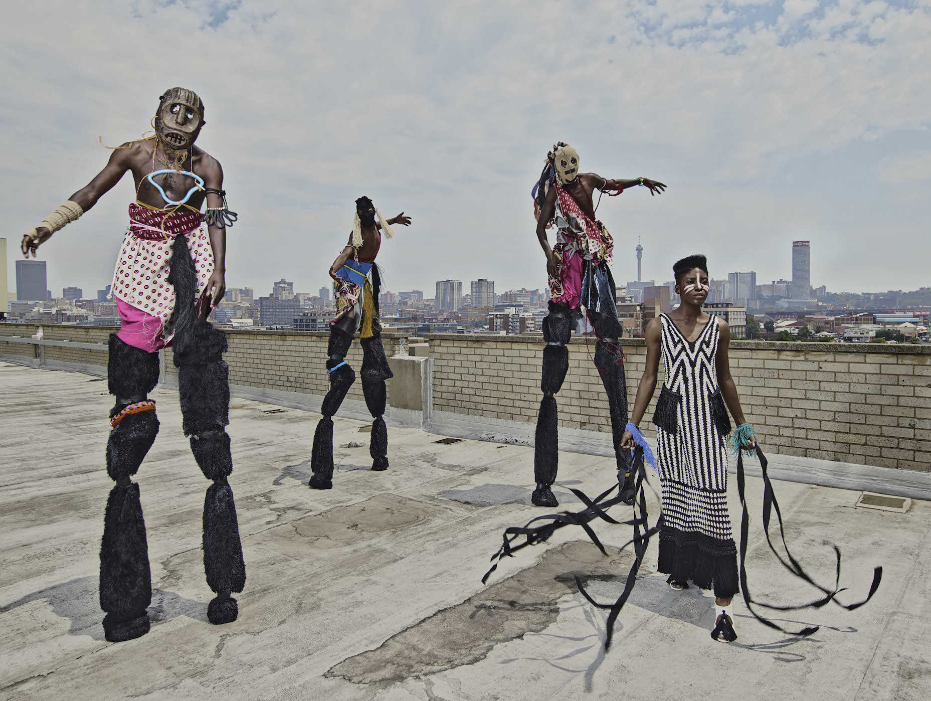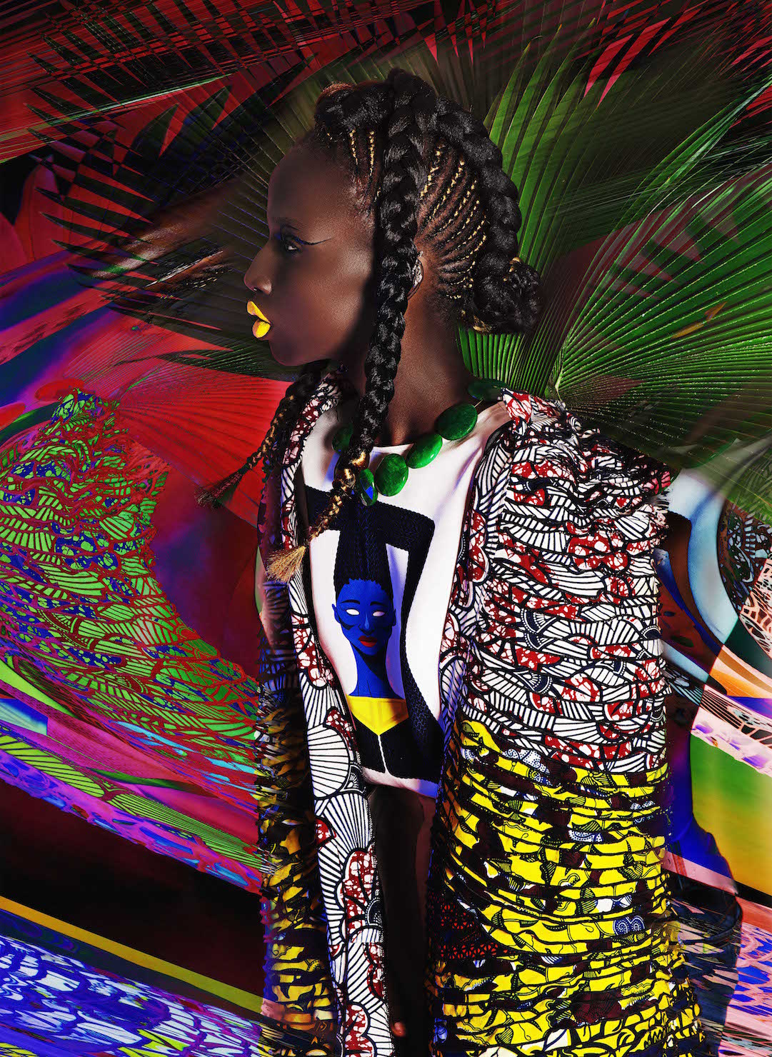 The series NGL, and Tonköma, were made in 2015. NGL, an acronym for “Next Generation Lagos,” explores the creativity of Nigeria’s youth culture through a surrealist and psychedelic filter. It was produced during an artist residency there, and features Nigerian fashion designers (I.AM.ISIGO, Tzar Studios, Maxivive, Tokyo James, Adeju Thompson, Re Bahia, Torlowei, Deco). Tonköma, which translates to “people stand up,” was produced for Edun, a fashion brand founded by Ali Hewson and Bono that focuses on sourcing production and encouraging trade in Africa. In the images, a group of masqueraders on stilts pose with fashion models on a rooftop in Johannesburg. It was inspired by the Nyamou in Guinea, believed to be the “devils” in the holy forest that protect it from bad spirits, who communicate with ancestors in the sky and the earth. I incorporate West African masks, pieces of wood, fake hair and African jewelry alongside Edun clothes. Many of the fabrics are similar to those found in the forests of Guinea, where the Nyamou are from.