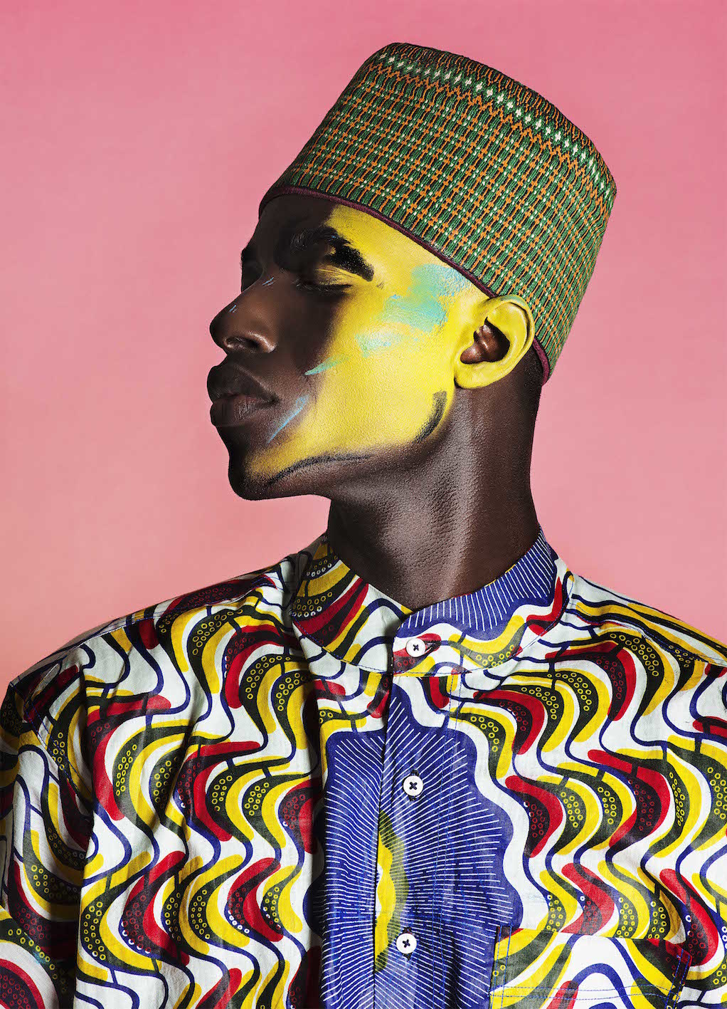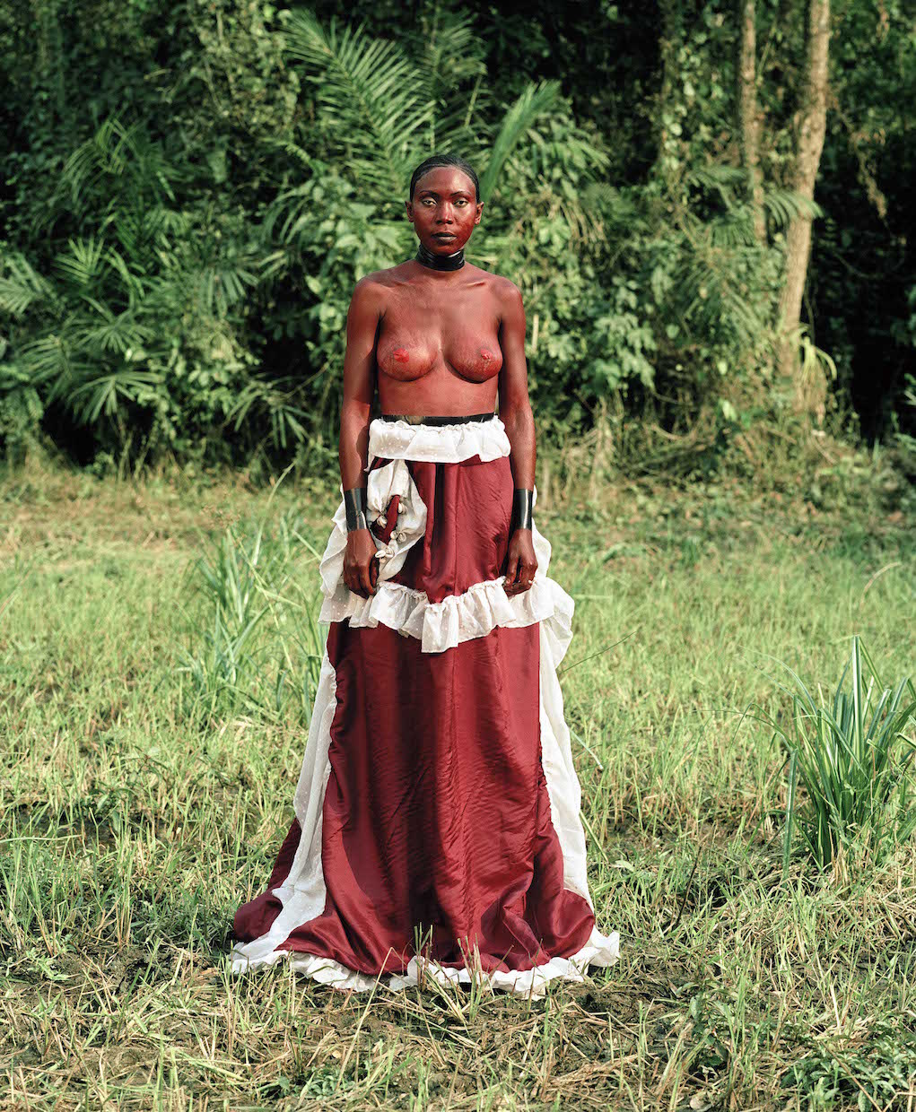 Namsa Leuba grew up in a Muslim and Protestant household in Switzerland with a Guinean mother and Swiss father. Her mixed background led her to pursue the cross-referencing she was accustomed to through photography. She focuses on African identity and practices filtered through her own Western-bred perspective. Leuba infuses local animist culture (researched during travels to Guinea) with a fashion photography bent, influenced in part by the aesthetics of Nick Knight and Kourtney Roy. Having visited “marabouts”–a type of witch doctor–in her youth, Leuba further immersed herself by taking part in ceremonies and rituals related to the world of spirits. Straddling the embodied and the intangible, her street-cast models channel the meeting point between her two realities. Some Guineans regard the images as a violation of well-defined tradition, sparking questions of whether differing cultural tropes can, in fact, harmonize.
