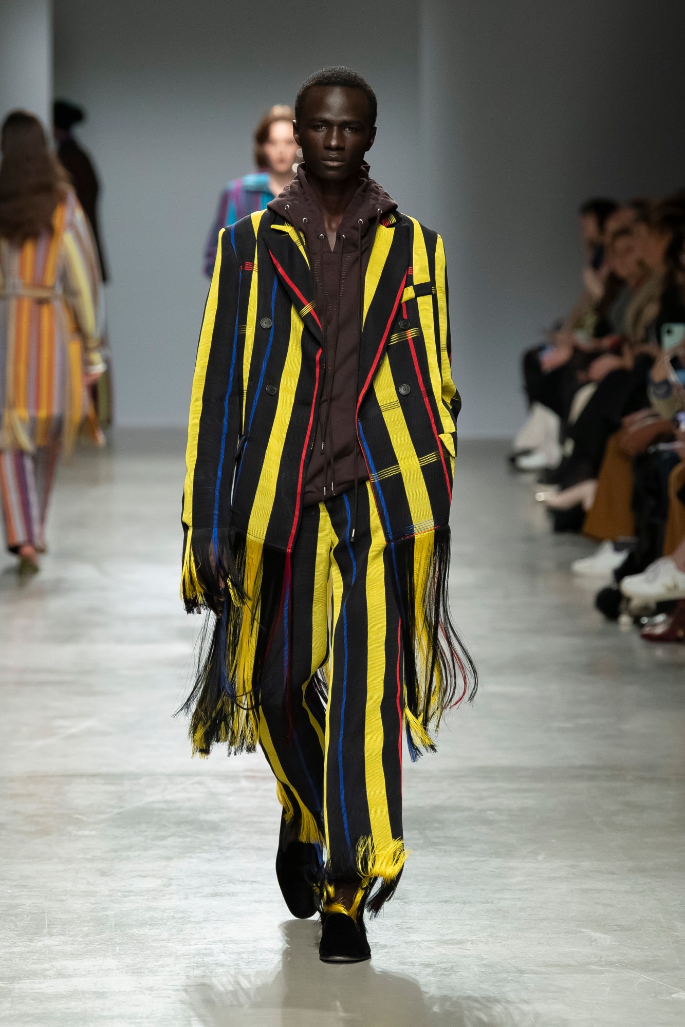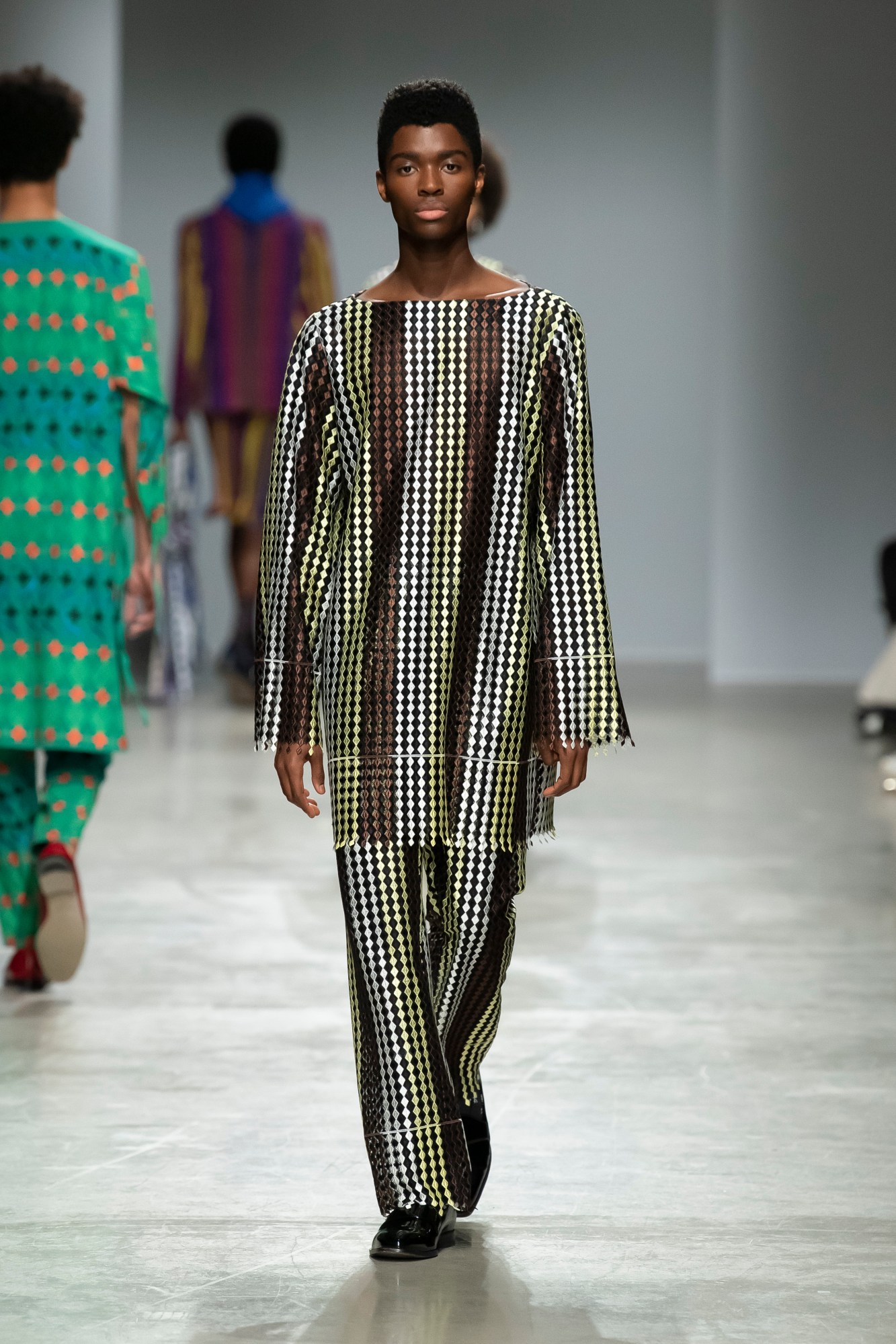 A who’s who crop of editors and buyers turned up to see the young Austrian-Nigerian designer’s homage to his childhood memories of dressing for church, a co-ed collection of breezily tailored pieces cut from handwoven aso oke cloth. It’s brightly-hued stripes and geometric patterns have swiftly become the unmistakable signature of his artisanally-focused practice.
