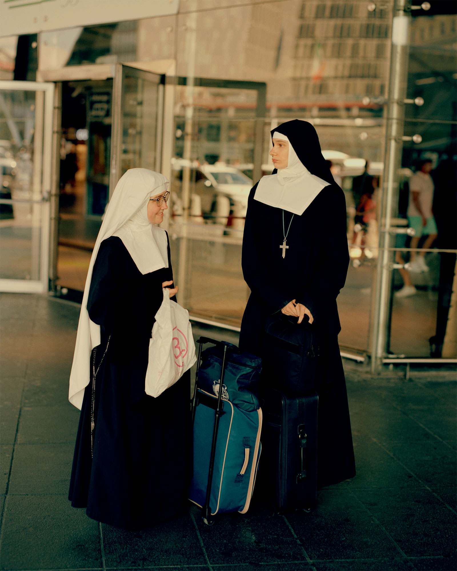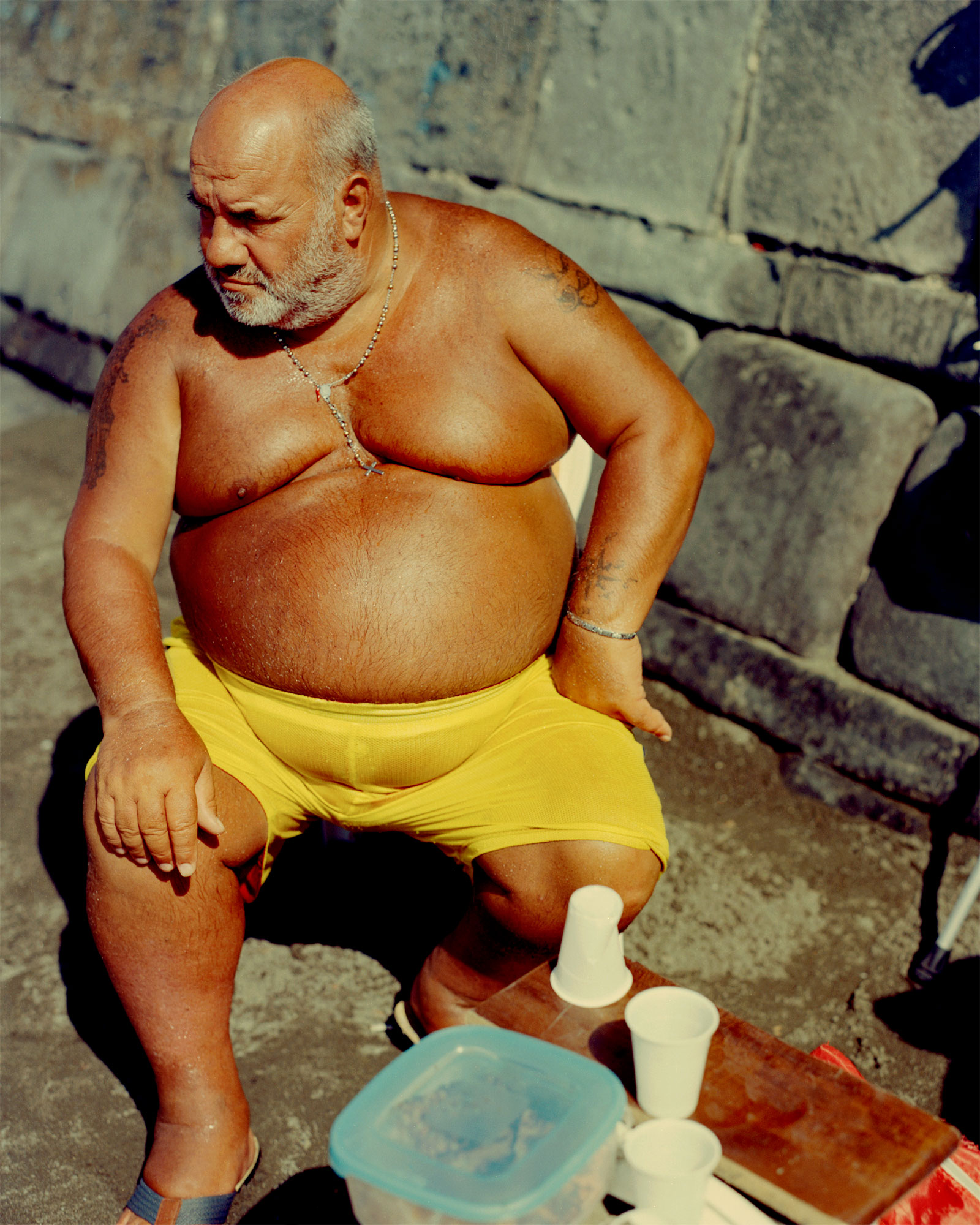 The resulting photographs Sam shot make up The City of the Sun, his new photo book which will be unveiled at Photo London 2023, published by New Dimension. It captures bare skin and sea — embodying the “calm and tranquillity” of the city — as well as the “die hard character and devotion” of football fans and Catholic followers who both share the Italian coastal spot. There are those aforementioned teenagers crawling over rock faces and bronzed older men sitting on deck chairs soaking in the sun. But as Sam explores the inner city’s geography, we catch glimpses of the frantic streets too: women on vespas, market stalls and nuns shielding themselves in the shade.