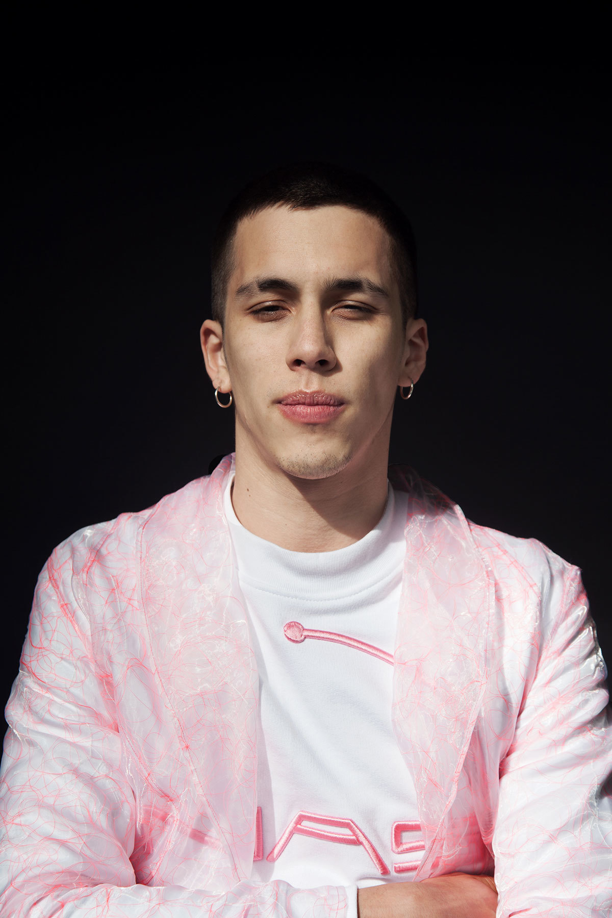 Mazhar’s new style NAS logos are embroidered in black and pink on T-shirts and sweaters, sweat pants, and Nasir Mazhar logos run around the waistbands of black and white boxer shorts. Blending hard and soft elements, the collection includes both sheer pink and white chiffon long jackets and black strapped holsters, like those seen in the spring/summer 16 catwalk collection.