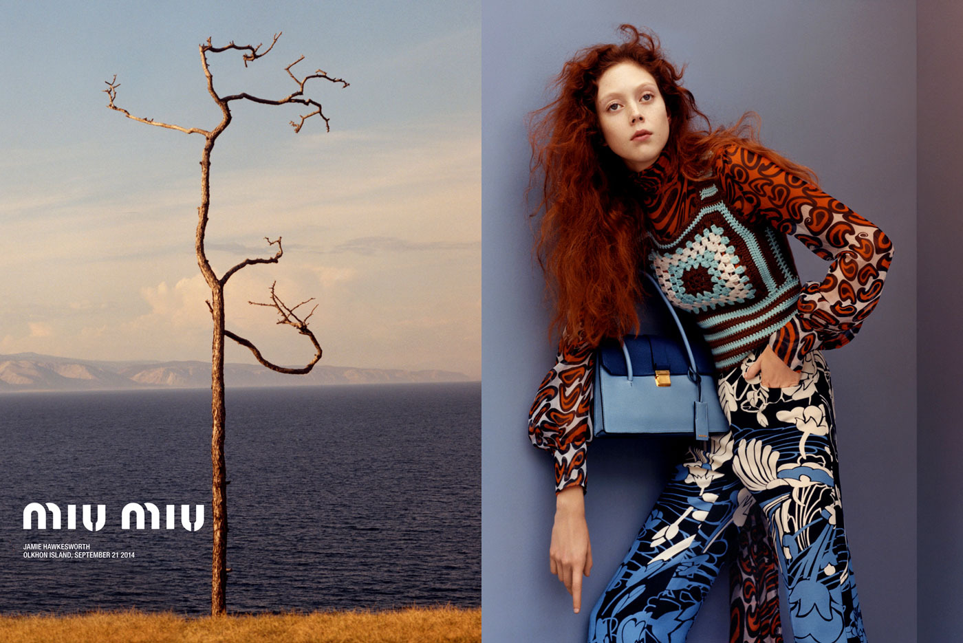 Shot by Jamie Hawkesworth, the brand calls the beautiful campaign “a lesson in the poetry of juxtaposition, the campaign images conjure an imagined narrative between the Miu Miu woman and her surroundings.”