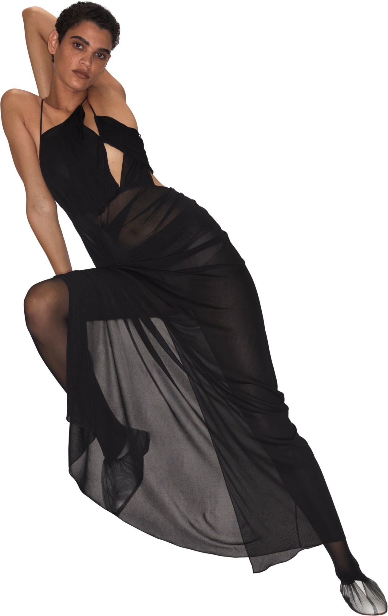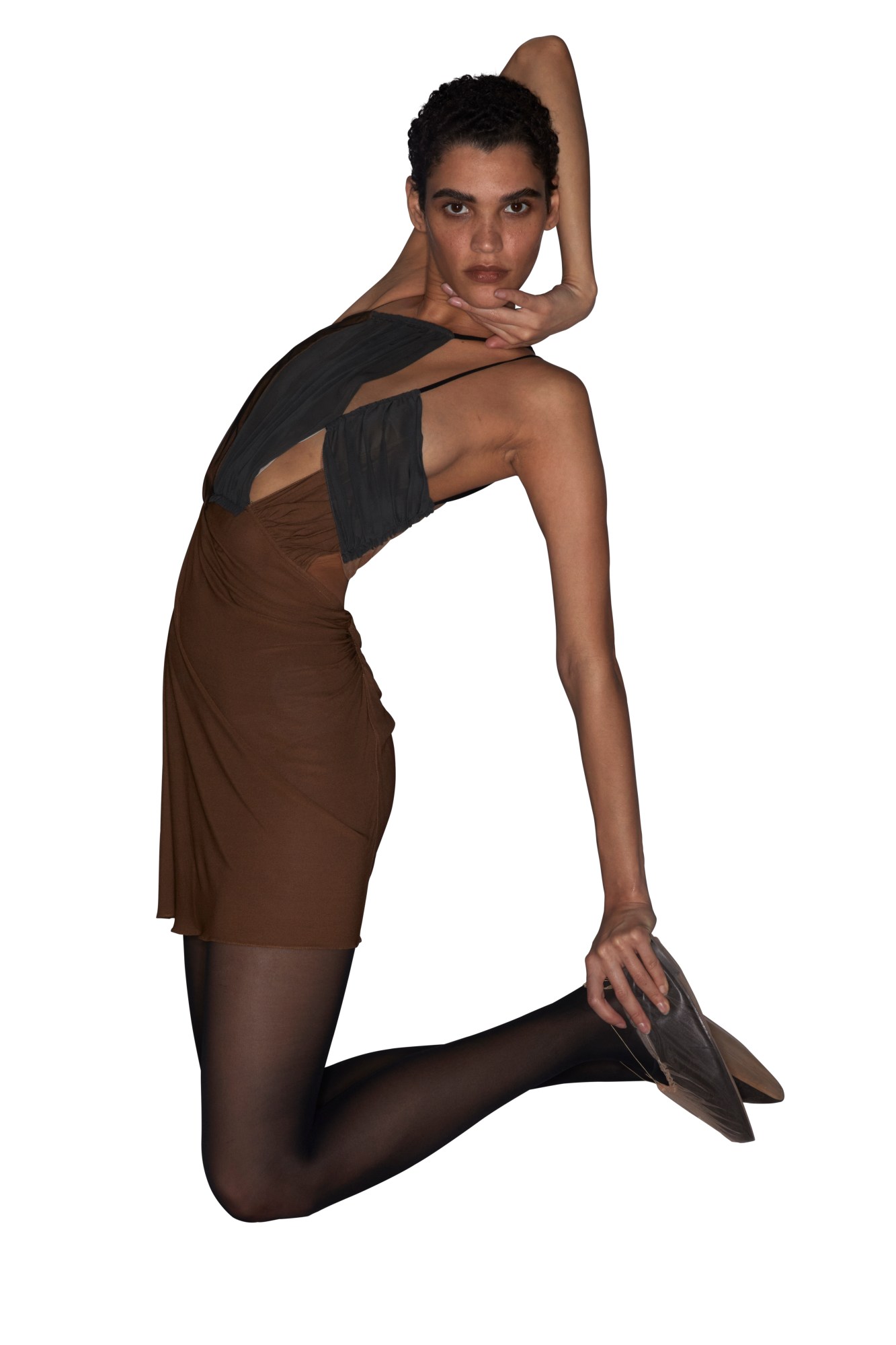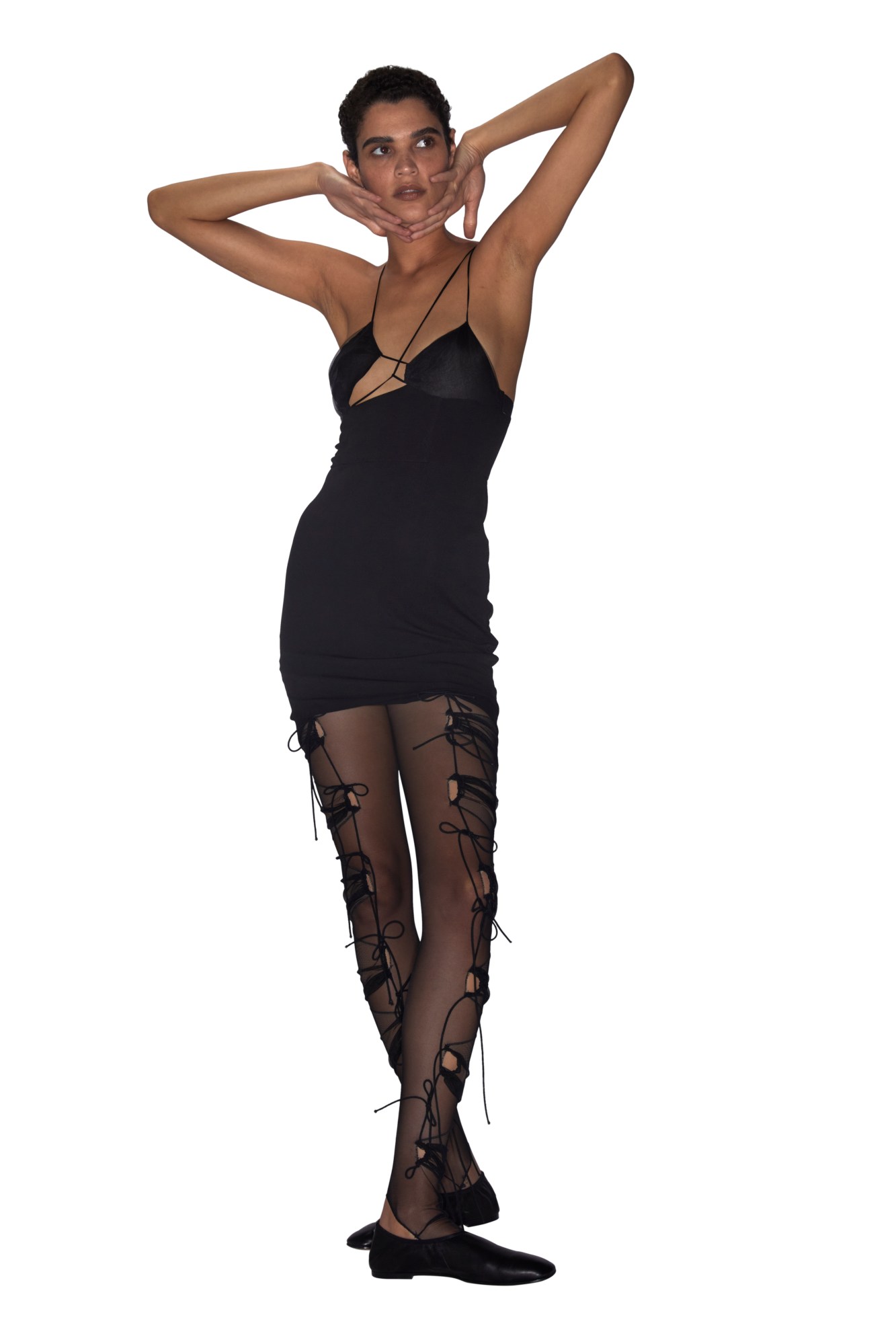 Turns out, however, that the time spent alone at home wasn’t much of a hindrance — creatively or physically — for Nensi. “In a sense, I kind of preferred it because I had time to myself to think,” she says. This time to think — to flip through old memories — uncovered the inspiration behind the designer’s latest collection. “During lockdown, I wasn’t seeing anything new. I remembered this ballet I saw two or three years ago at Sadler’s Wells in London, and I searched it on YouTube. I liked that the ballet was kind of weird, both the music and the dance itself, but the dancers were all so beautiful and feminine in these bodysuits. I liked that juxtaposition.” The ballet in question is William Forsythe’s “In the Middle, Somewhat Elevated”. It’s easy to see why the piece, the first postmodern ballet, characterized by an off-kilter-ness, resonates so deeply with Nensi. It’s a choreography of contrasts (the softness of a pointed toe and the sharpness of a palmed hand) and minute movements. In the video Nensi watched (and rewatched) during quarantine, dancers move gracefully, then erratically, to a cacophonous, electronic score. They’re all wearing jewel-green bodysuits, sheer footless tights, overlaid. These particular dancewear pieces served as the foundation for spring/summer 21, which showcased sheer, spliced “bodies,” as Nensi calls them, with intricate strap detailing. Another stand-out piece was a pair of lace-front tights, a gorgeously technical feat that set the internet abuzz when Nensi teased them on Instagram, days before the season’s digital show.