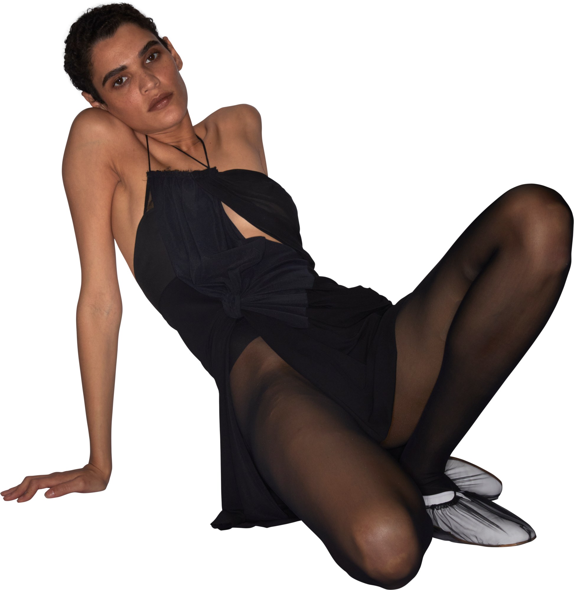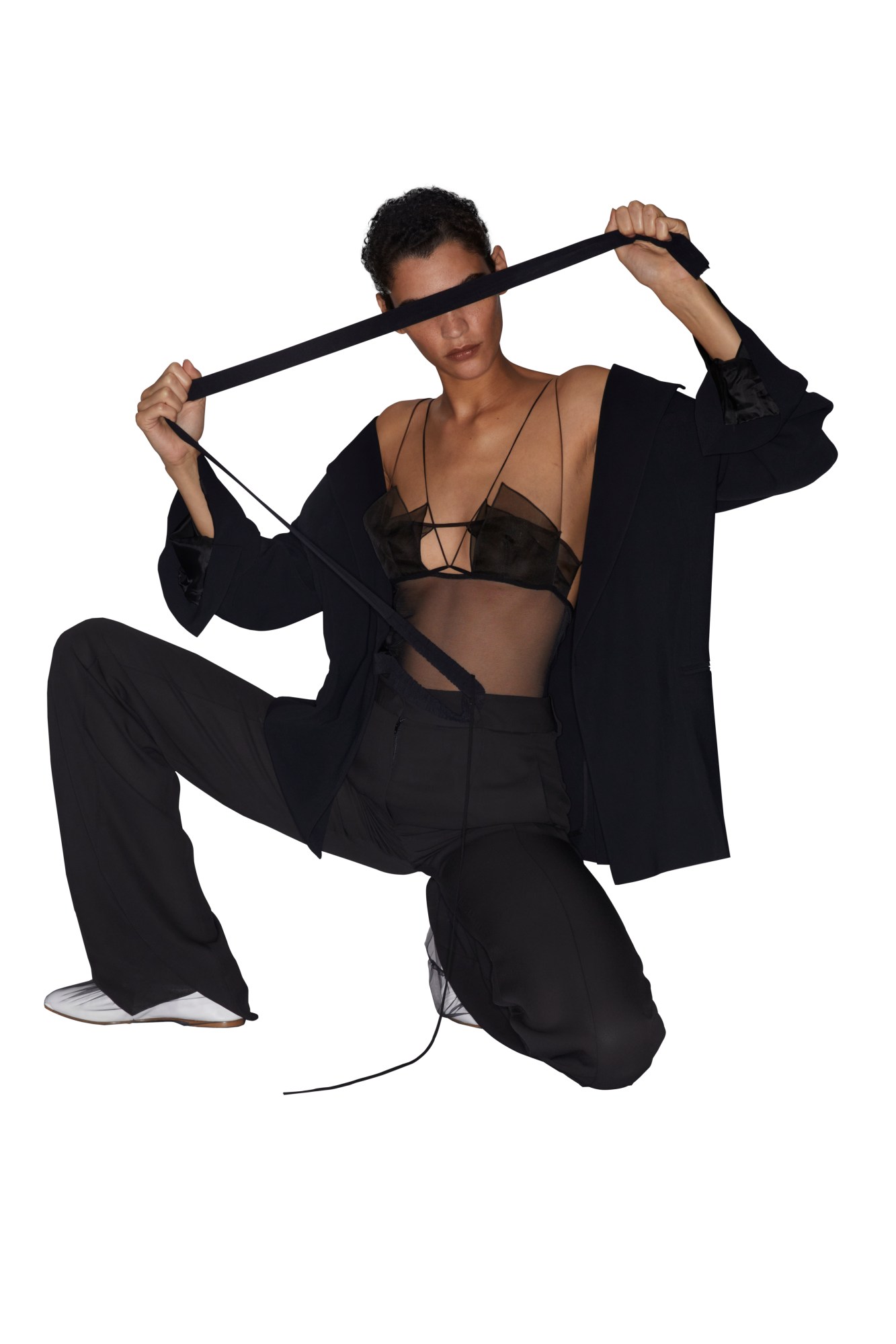 Designing directly onto the mannequin — and, by proxy, a woman’s body — is essential to Nensi’s work and has heavily shaped her design ethos. “The body is very important for me; I use it as an anchor to create all these different drapes,” she says. “I want to enhance the body, but it’s not so much about showing the body. I don’t want it to be sexualized.” Lingerie, in the traditional sense, has long been a category that has pandered to male desire, has maintained an ever-narrow definition of “sexy”. And this extends to ready-to-wear as well: think the “little black dress” and all its implications. Nensi flips the script on these conventions of sexiness, finding new and unusual erogenous zones, highlighting the oft-ignored parts of the female figure. “I try to take that sexual element away from my clothing through the element of deconstruction. The clothes are a little weird,” she laughs. “They’re not placed how normal lingerie would be placed. It’s all about distortion rather than sexualization”. A strappy micro bra from the designer’s CSM MA collection features a layered construction in tulle and satin. The piece is teensy and leaves little to the imagination, as they say. Yet the silhouette is so unusual; it jars the mind a bit. It’s sexy, but not in the conventional sense. It’s sexy in a way that pricks. But that’s just another shard of Nensi’s vision: “I want my clothing to make the woman wearing them to feel powerful and strong.”