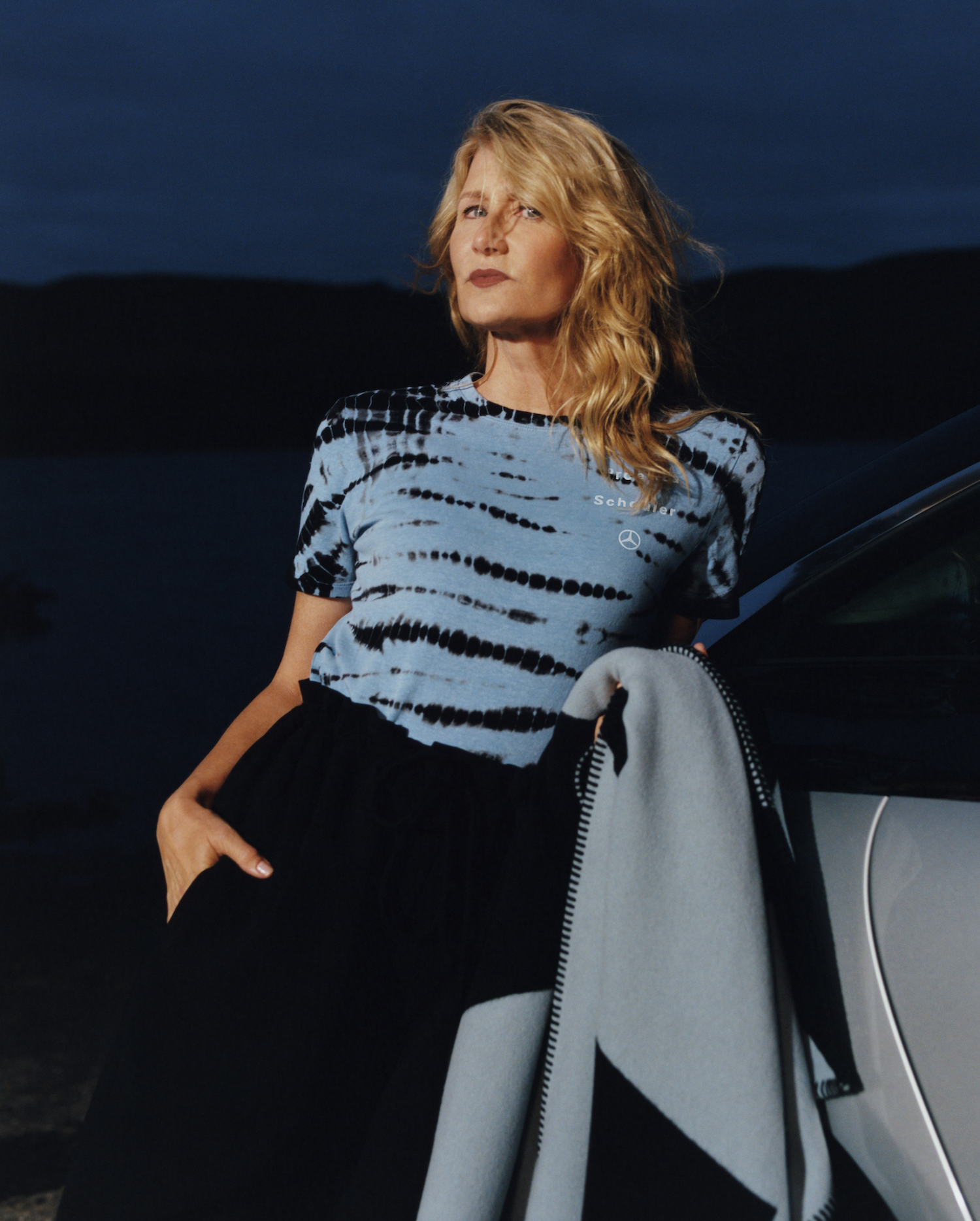 She’s an icon who needs no introduction. From her iconic performance (and wardrobe) as Renata Klein on Big Little Lies, to starring in David Lynch’s 1986 film Blue Velvet, to her turn as Dr. Ellie Sattler in Jurassic Park, there is not a script or a movie that Laura Dern can’t bring sparkle to. It’s impossible not to love her — especially in the fashionsphere. Raf Simons put her on a T-shirt, Miuccia Prada adores her, and now, at the height of her career, the Oscar-winning star is the face of Proenza Schouler’s new collaboration with Mercedes-Benz. Drawn to the designers’ commitment to sustainability (the collection comprises recycled cashmere knits, eco-cotton tees with eco-friendly tie-dyes, upcycled leather keychains and recycled-wool totes) — the environmentally-conscious actress stars in the campaign with her model son Ellery Harper. Photographed by Harley Weir, they take a quintessentially Californian a road trip in an all-electric Mercedes-Benz EQS (Laura is a native Los Angeleno, so she spends a lot of time in her car). We caught up with her to discuss her love for fashion, her tips for dressing up, and most importantly, her life in looks.