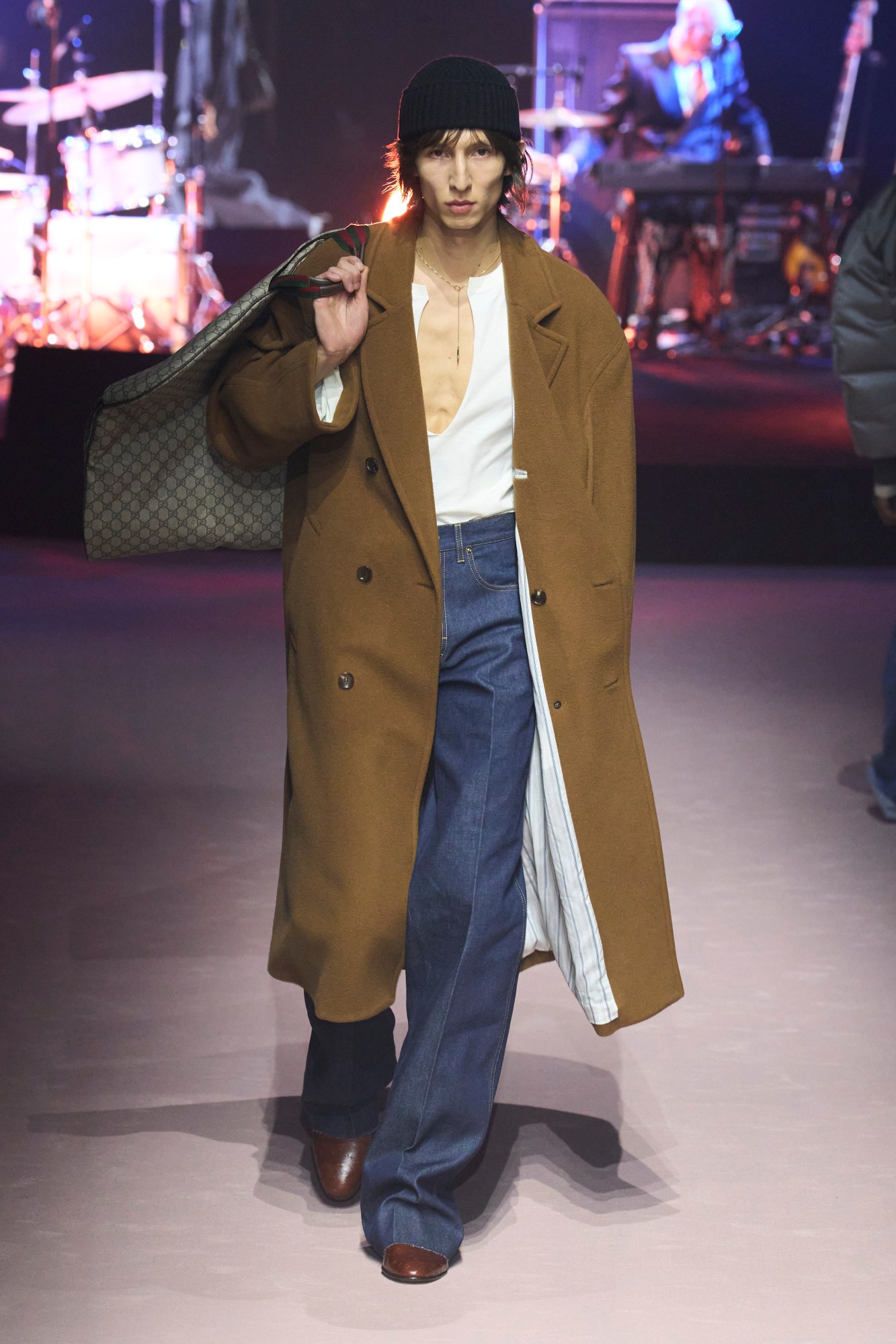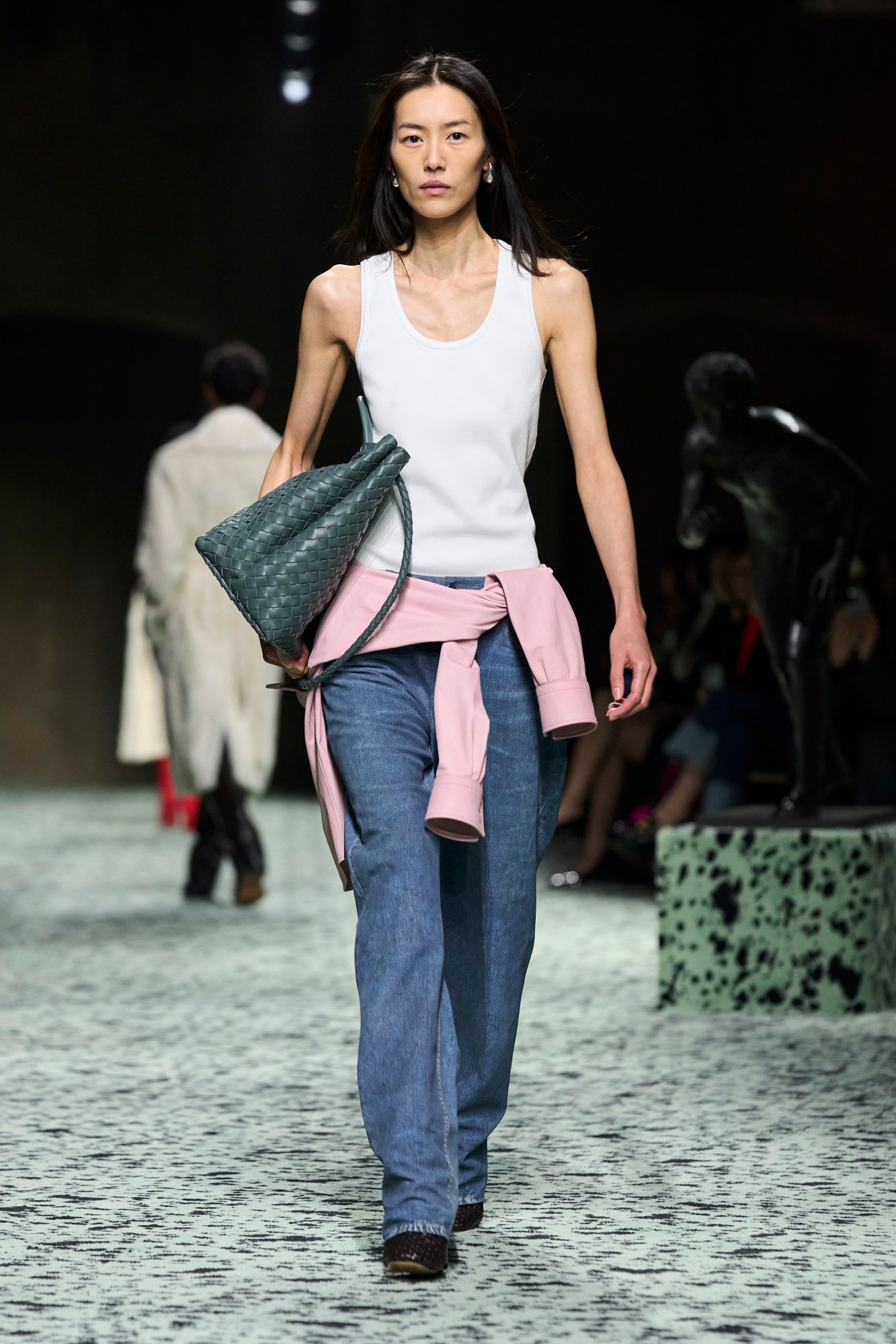 A style reminiscent of Phoebe Philo’s 2010s Céline, the return of luxurious minimalism was evident in every leg of the past fashion month. In New York, Proenza Schouler showed a series of black, navy, ivory and camel blazers. In London, Central Saint Martins’ Max Anthony, Toga, and even Nensi Dojaka showed khakis, jeans, and sweaters as centrepieces in their collections. In Milan, Gucci presented button-down shirts and belted slacks and Bottega Veneta closed their show with what was seemingly the most wearable look of all: tapered denim and a white tank accompanied by a light pink jacket tied around the waist, all crafted from trompe l’oeil leather (even pieces that bespeak painstaking craftsmanship are masquerading as ‘jeans and a tee.’) And finally, in Paris, Miu Miu and Loewe both fielded offerings that were notably normie compared to previous seasons. A renewed appreciation for elevated wardrobe necessities left consumers with a shared sentiment: all hail wearable clothing.